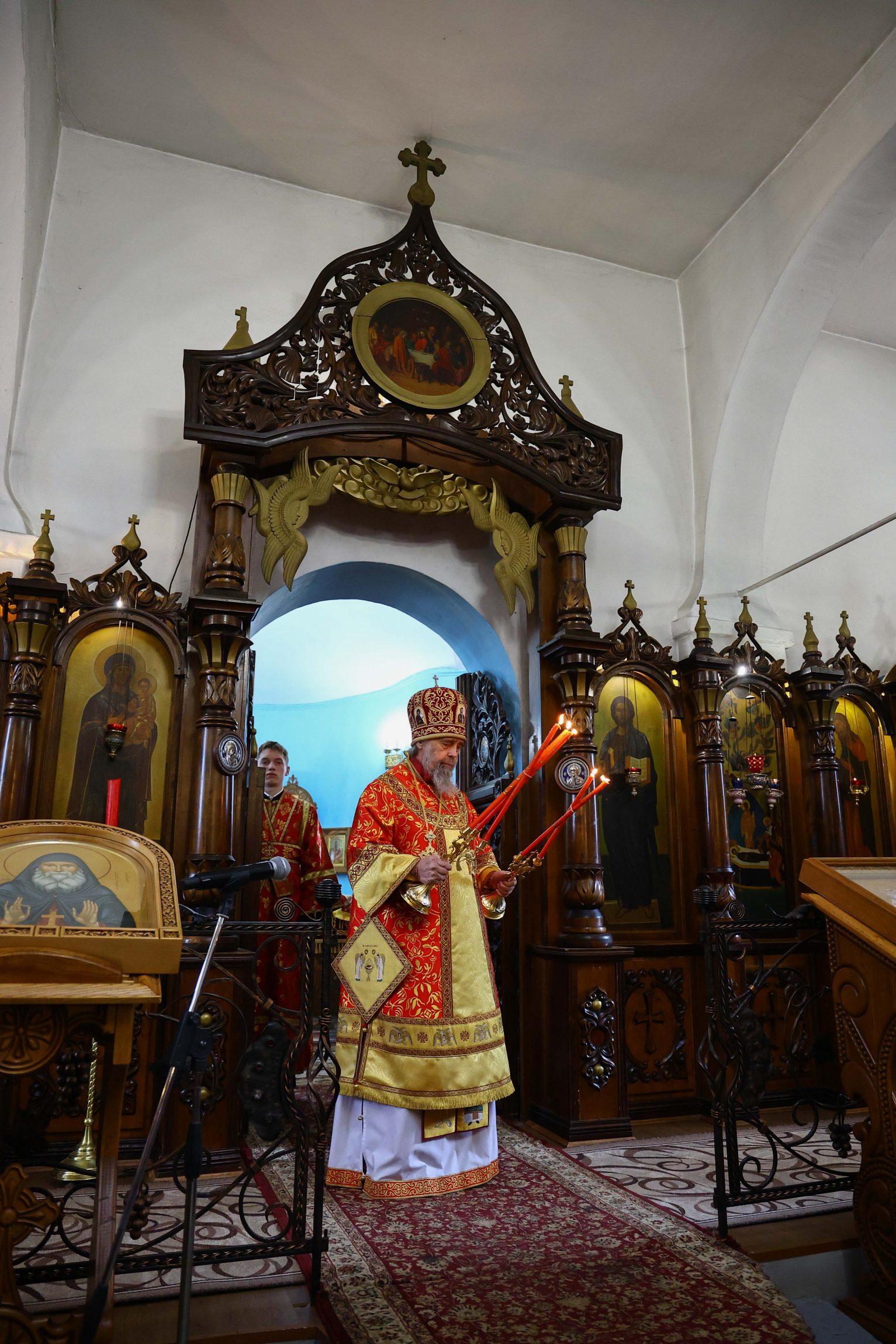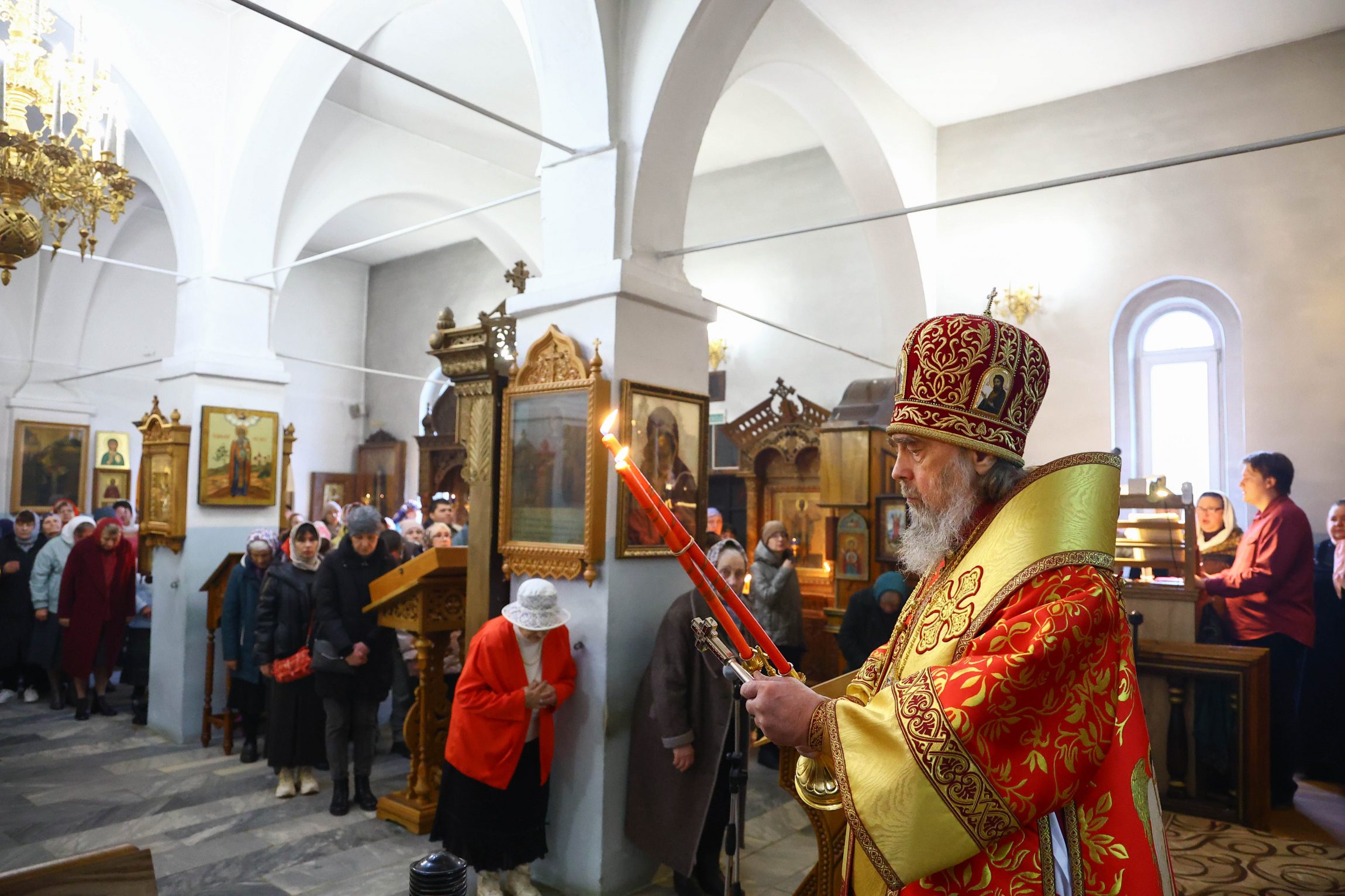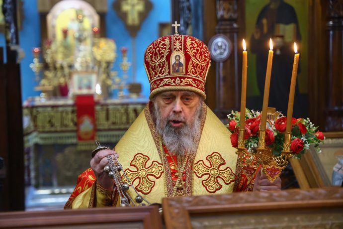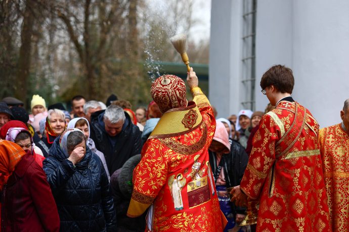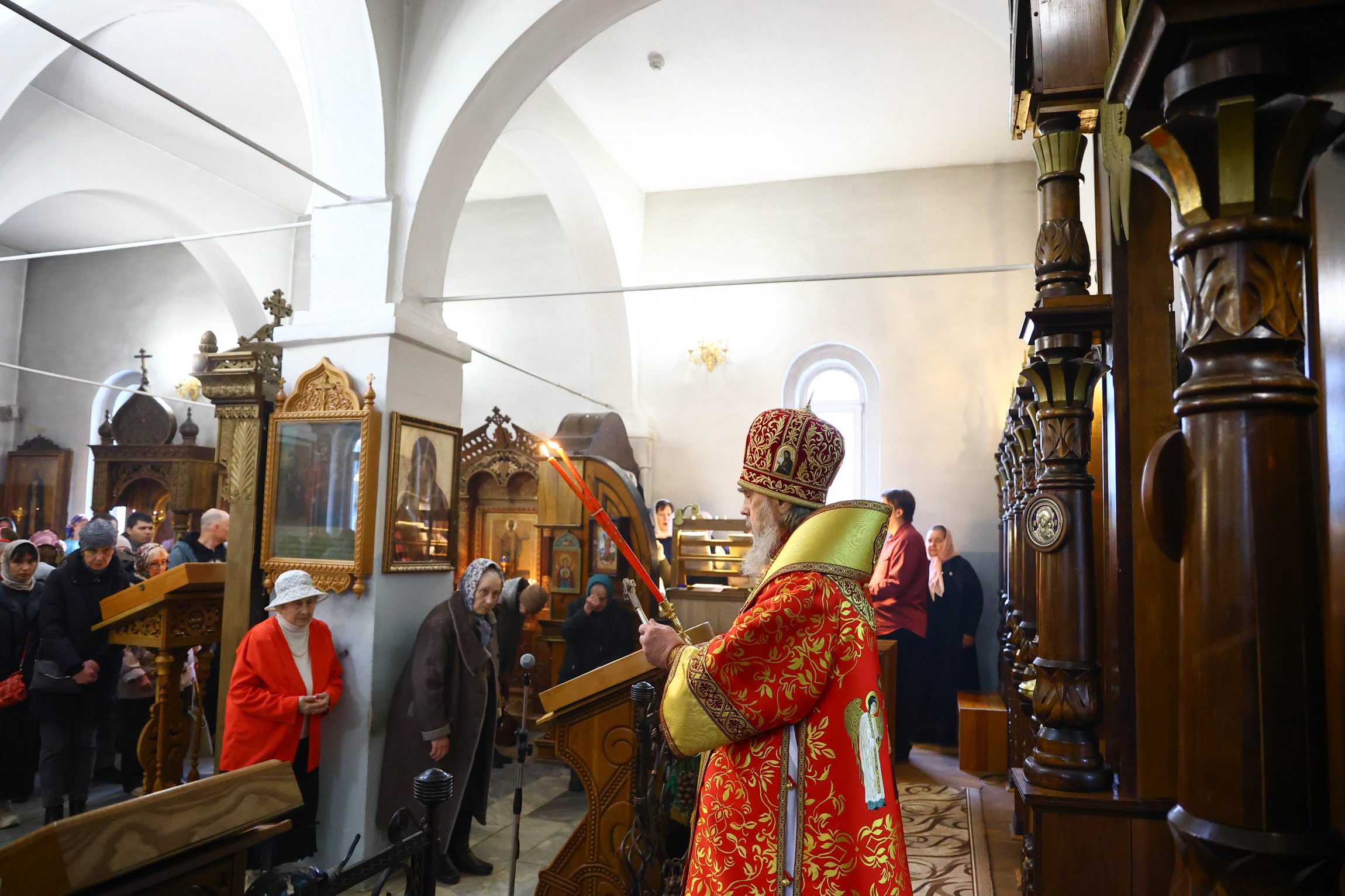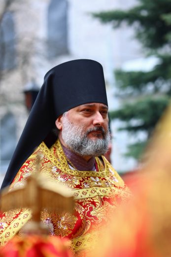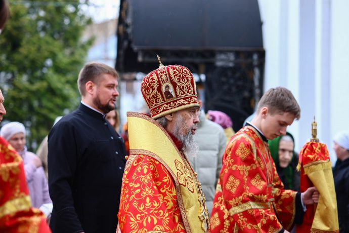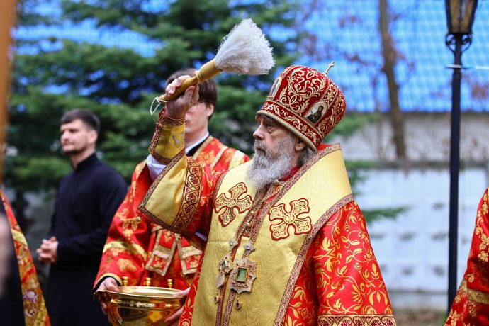 По окончании богослужения владыка приветствовал молящихся: «В светозарное пасхальное сорокадневие и мы единодушно со всей православной христианской вселенной, ликуя, празднуем победу над нашим преткновенным человеческим свободным выбором, обрекающим нас и всю нашу чувственную природу на богозабвение, богонечувствие и через это — на опытное злотворчество, вредотворчество и смертотворчество, одержанную жертвенной самозабвенной любовью, открывшейся в Предвечном Божием совете, Которым еще прежде создания мира было предуведено это наше преткновение, в Едином из Трех Своих Божественных Лиц, Единородном Божиим Сыне. Жертвенным, смиренным и кротким Своим снисхождением и служением Единородный Божий Сын, ставший от Приснодевы Марии при содействии Духа Святого, по благоволению Бога и Отца и Своим самодействием, и Сыном Человеческим, перевозглавил Собою от Адама первозданного человеческий род и явил в Себе абсолютную норму жизни и деятельности человеческого естества, преобразив и исцелив в Себе это наше смертотворчество и злотворчество послушанием не хотящей смерти грешников воле Божией, добровольным воспринятием крестных страданий и неповинной смерти, в первые возведя человеческое естество в Себе Самом в богоподобное непадательное состояние, а Воскреснув на третий день, биологическую нашу смерть преобразовал в сон всей земли и установил закон всеобщего воскресения.