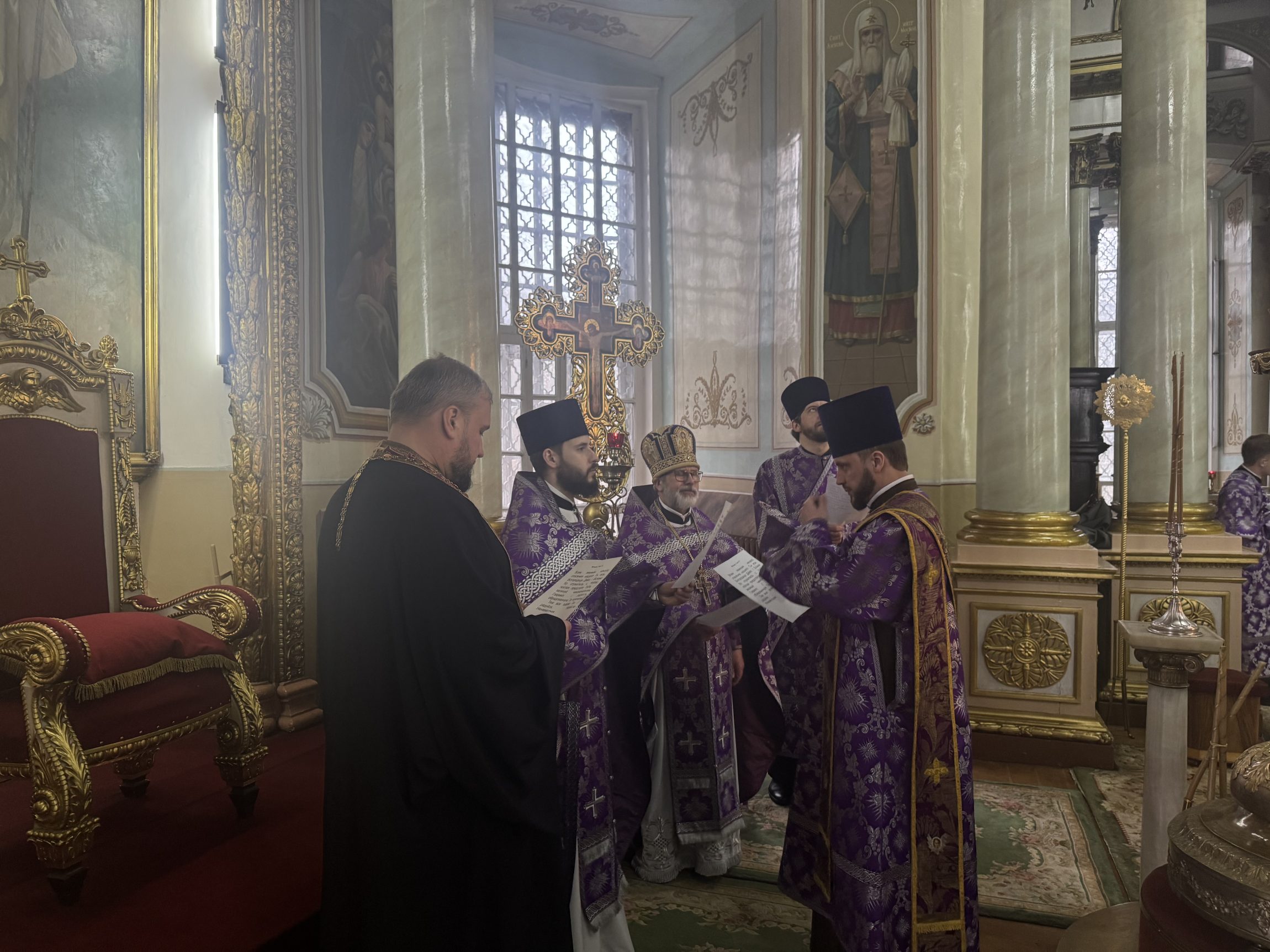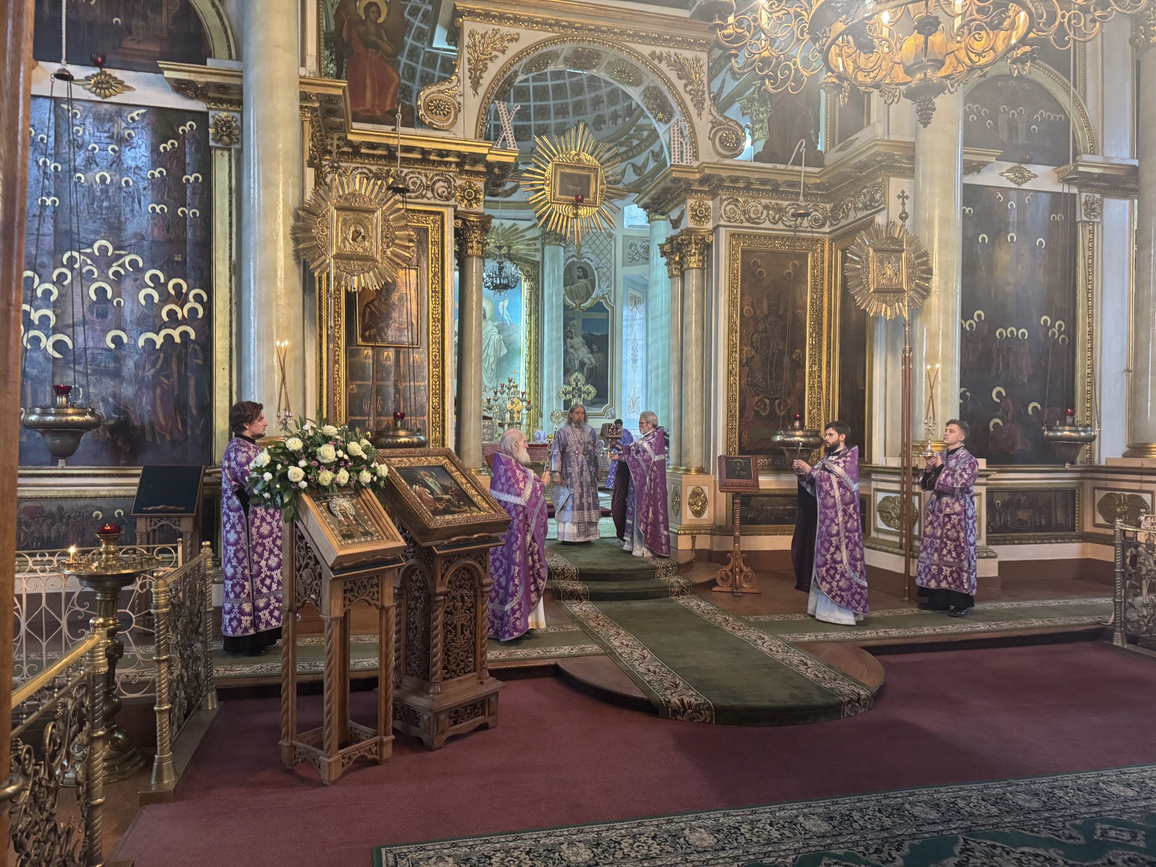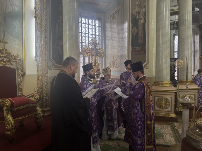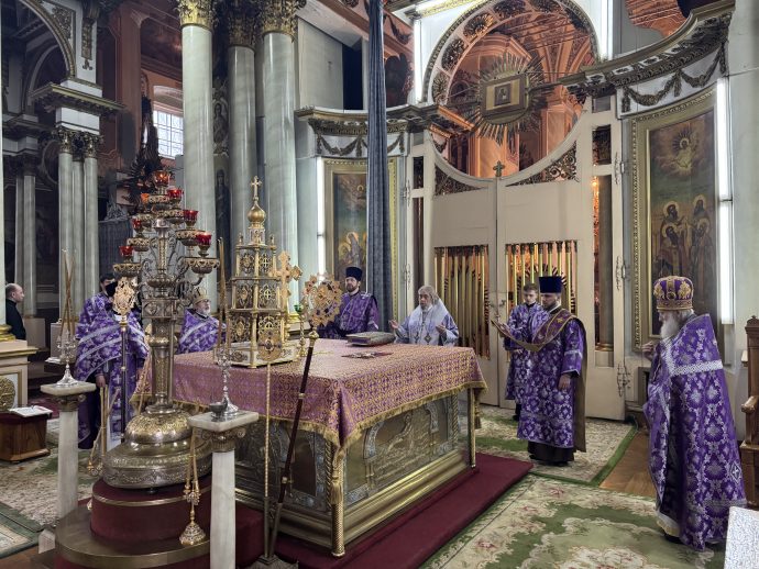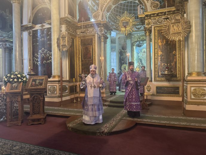 На сугубой ектении вознесены молитвы о благопоспешении христолюбивому Российскому воинству в установлении мира в сию лихую годину, на Святую Русь нашедшую, о мире на Украине, а также о сохранении единства святого Православия.