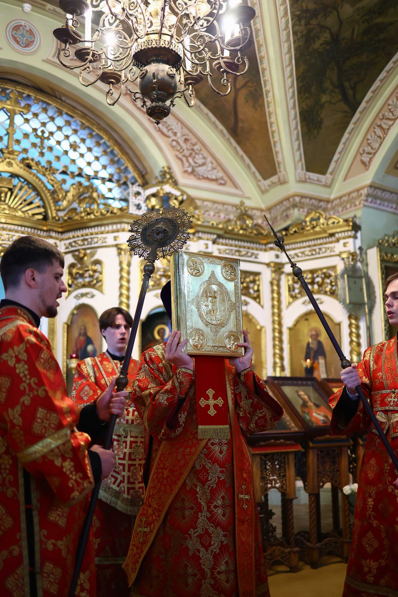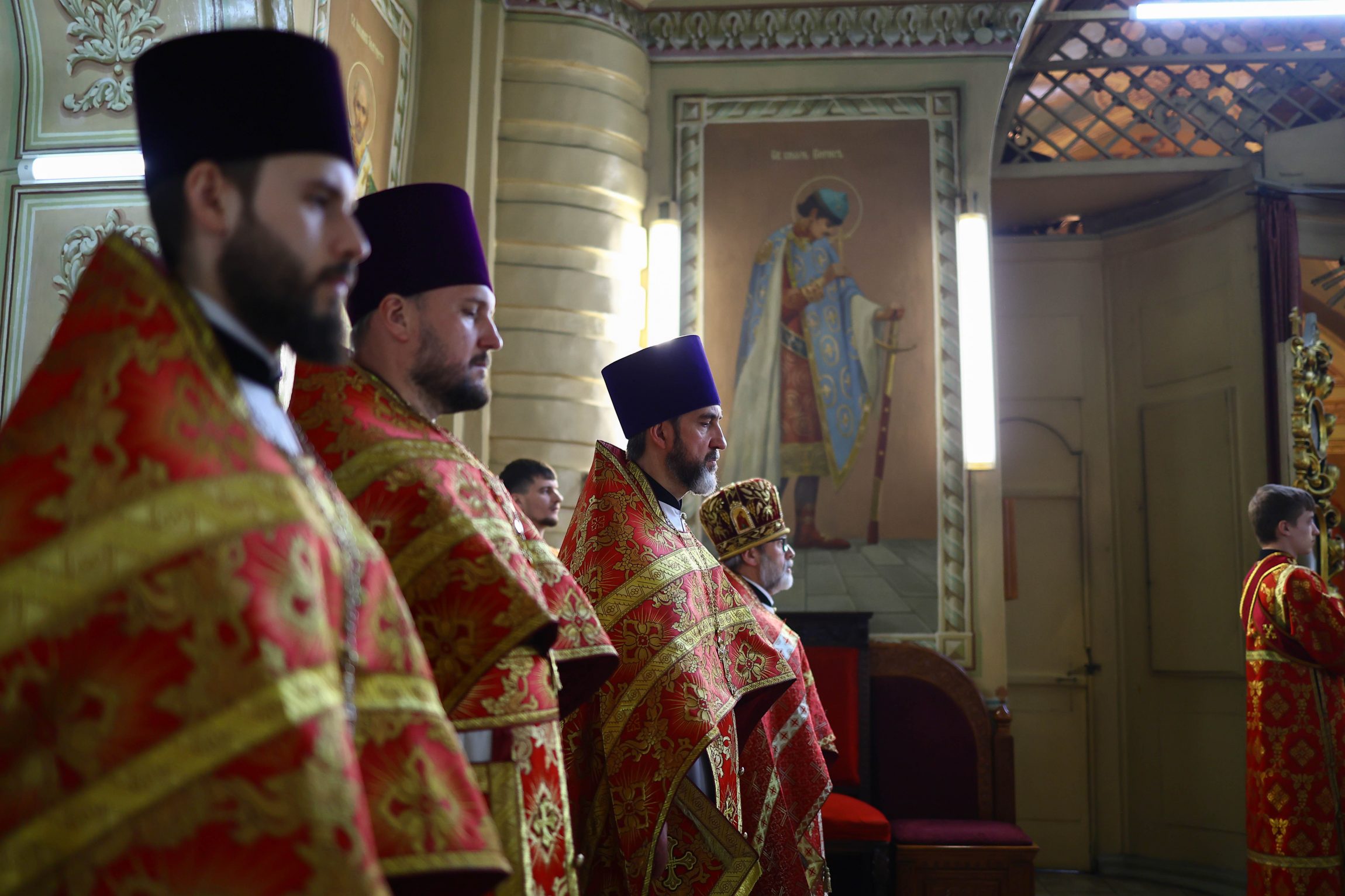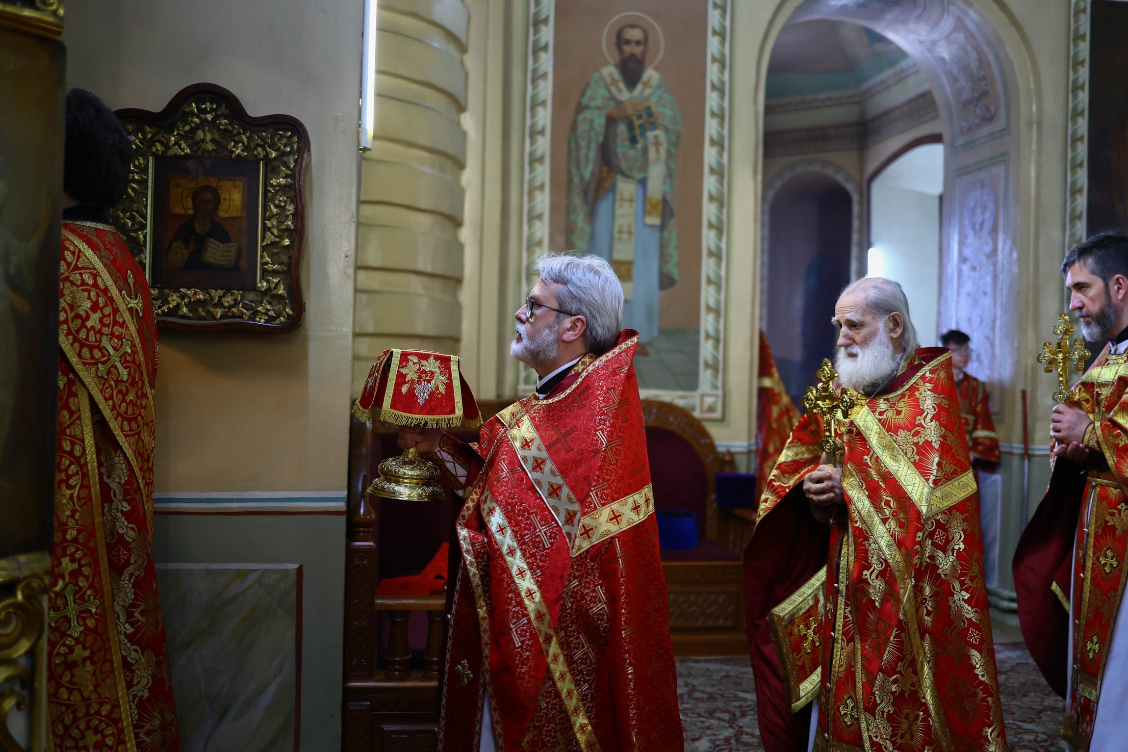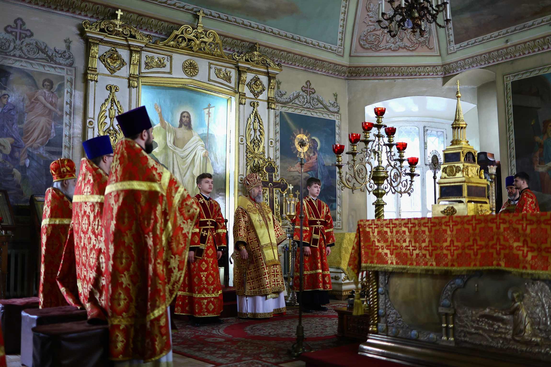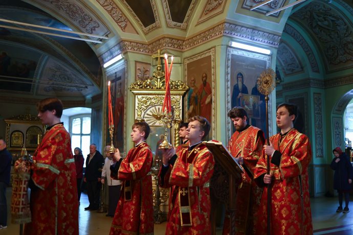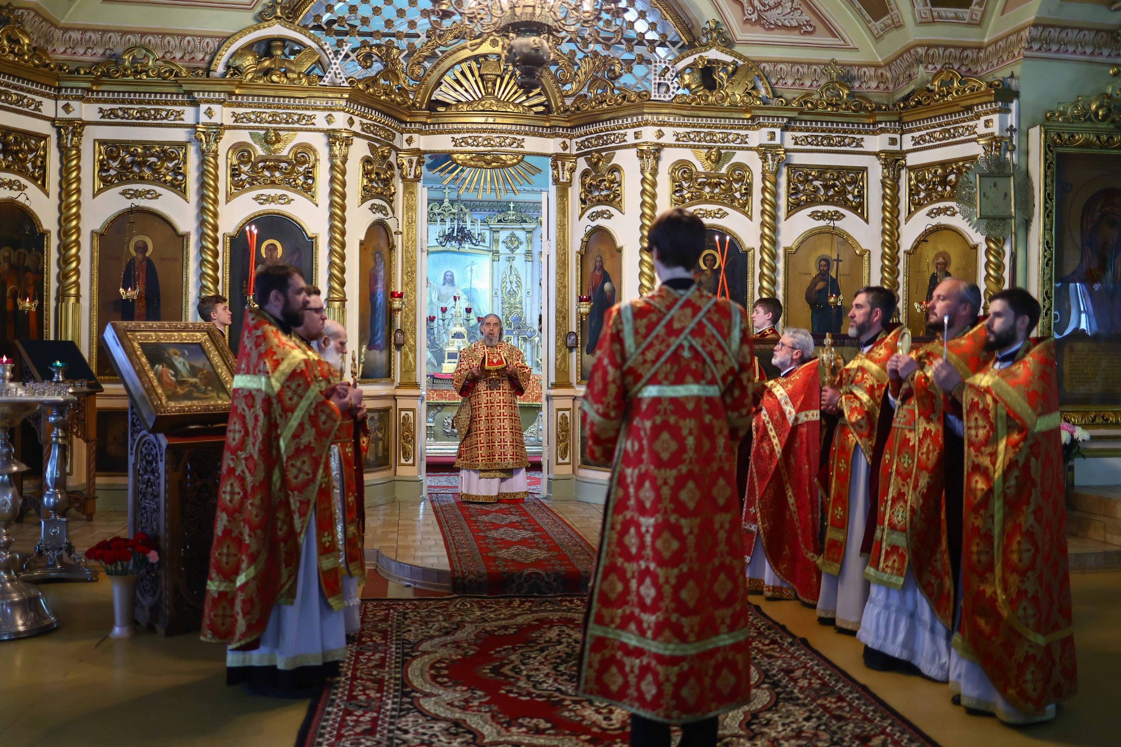 На сугубой ектении вознесены молитвы о благопоспешении христолюбивому Российскому воинству в установлении мира в сию лихую годину, на Святую Русь нашедшую, о мире на Украине, а также о сохранении единства святого Православия.