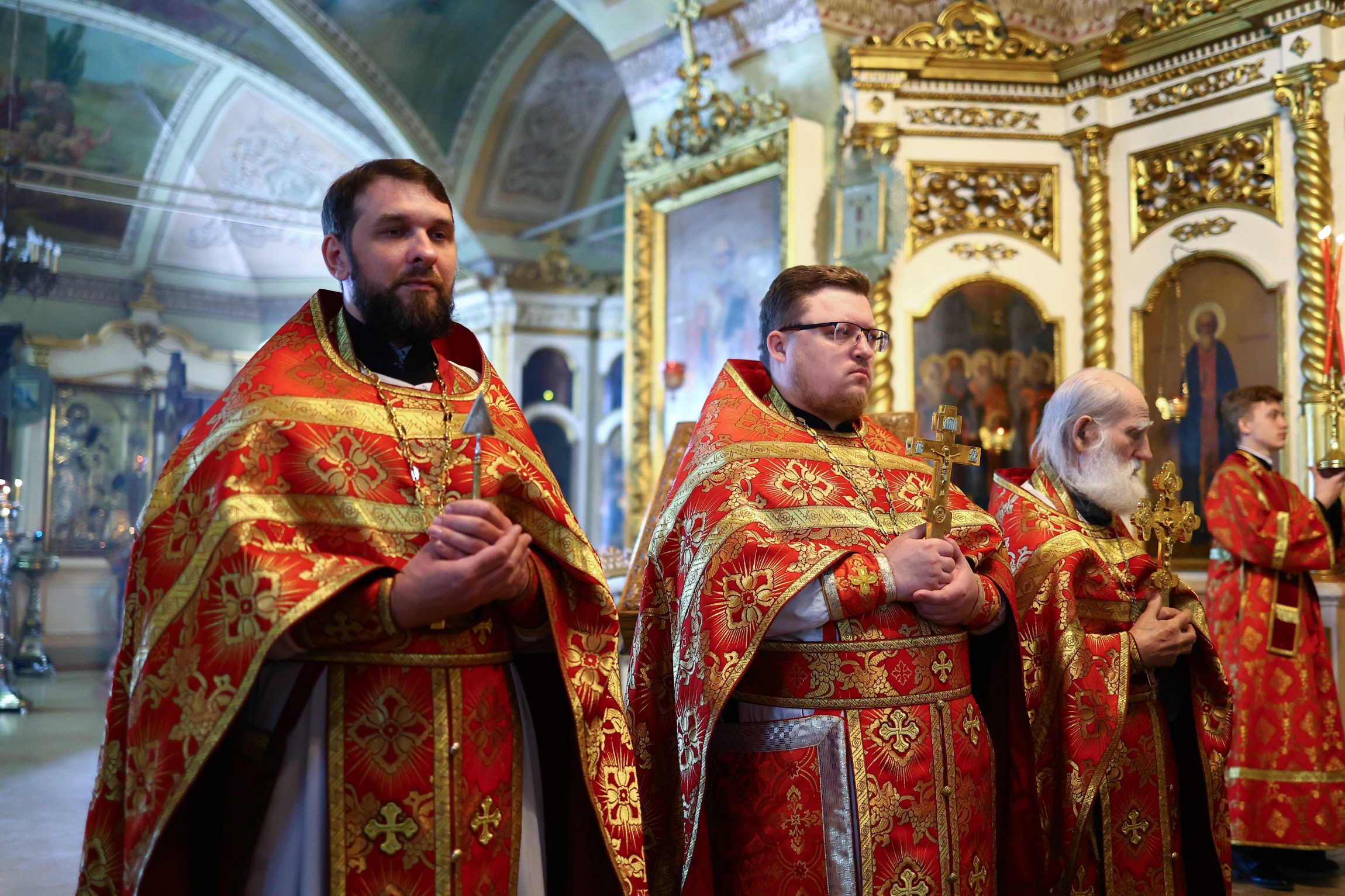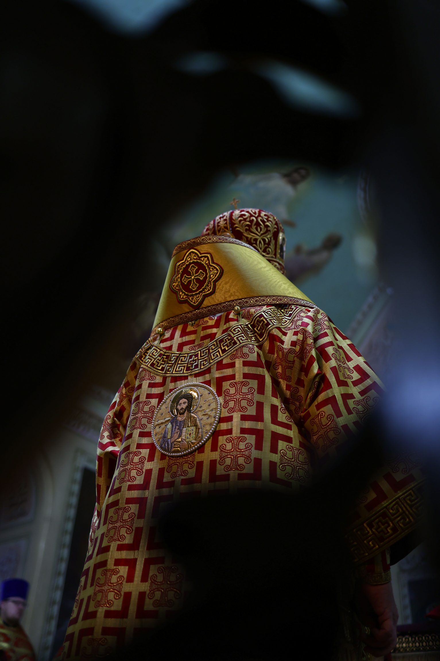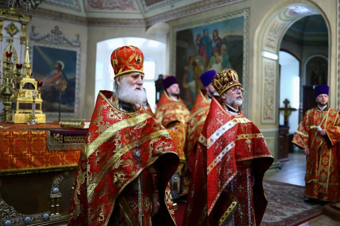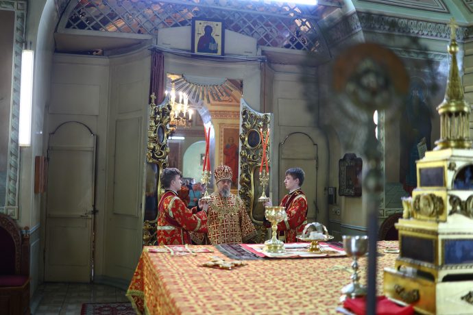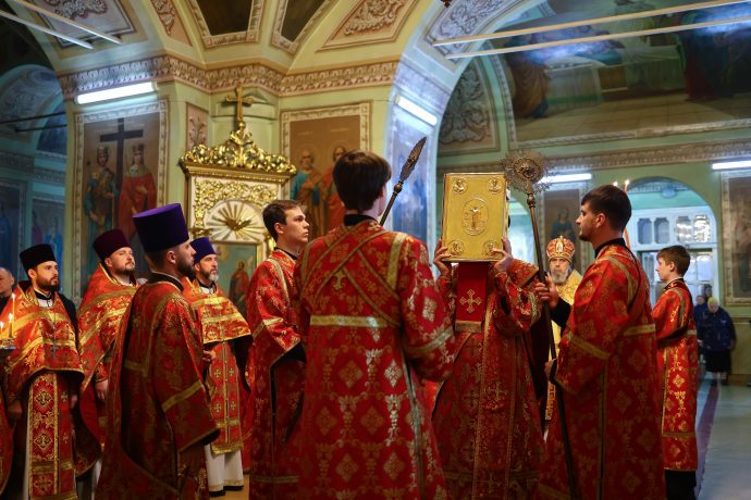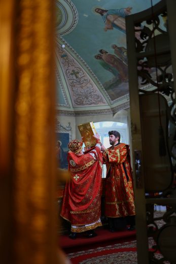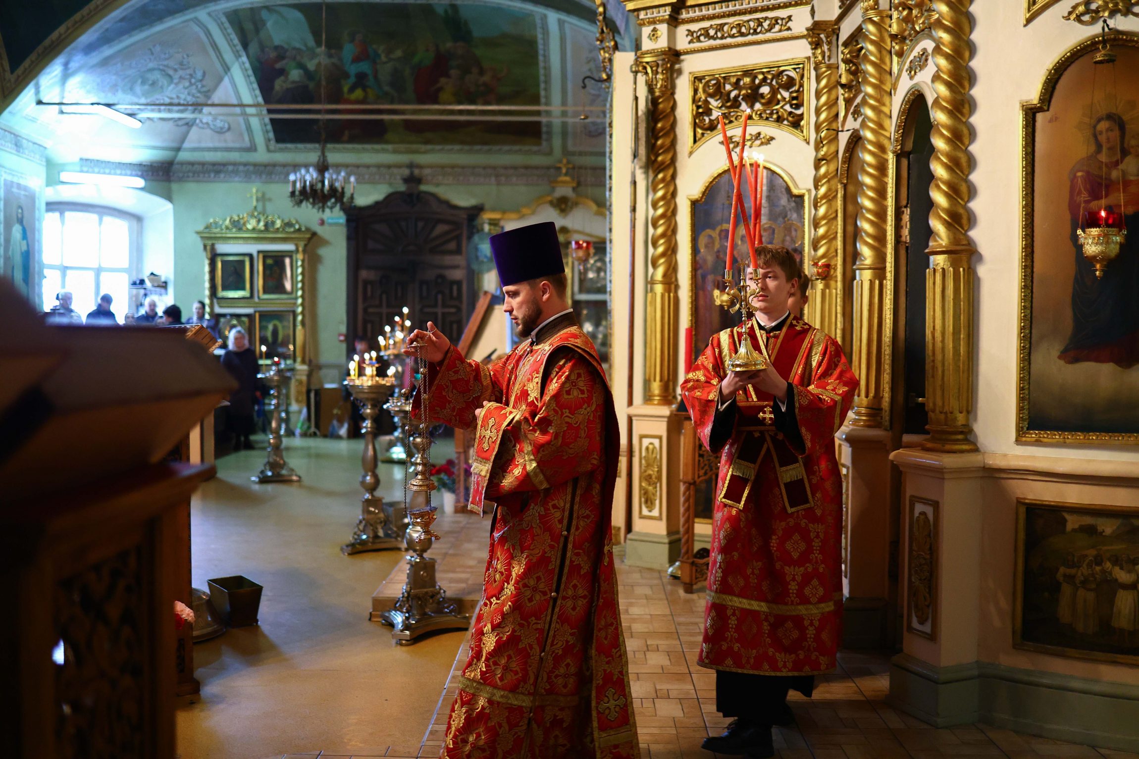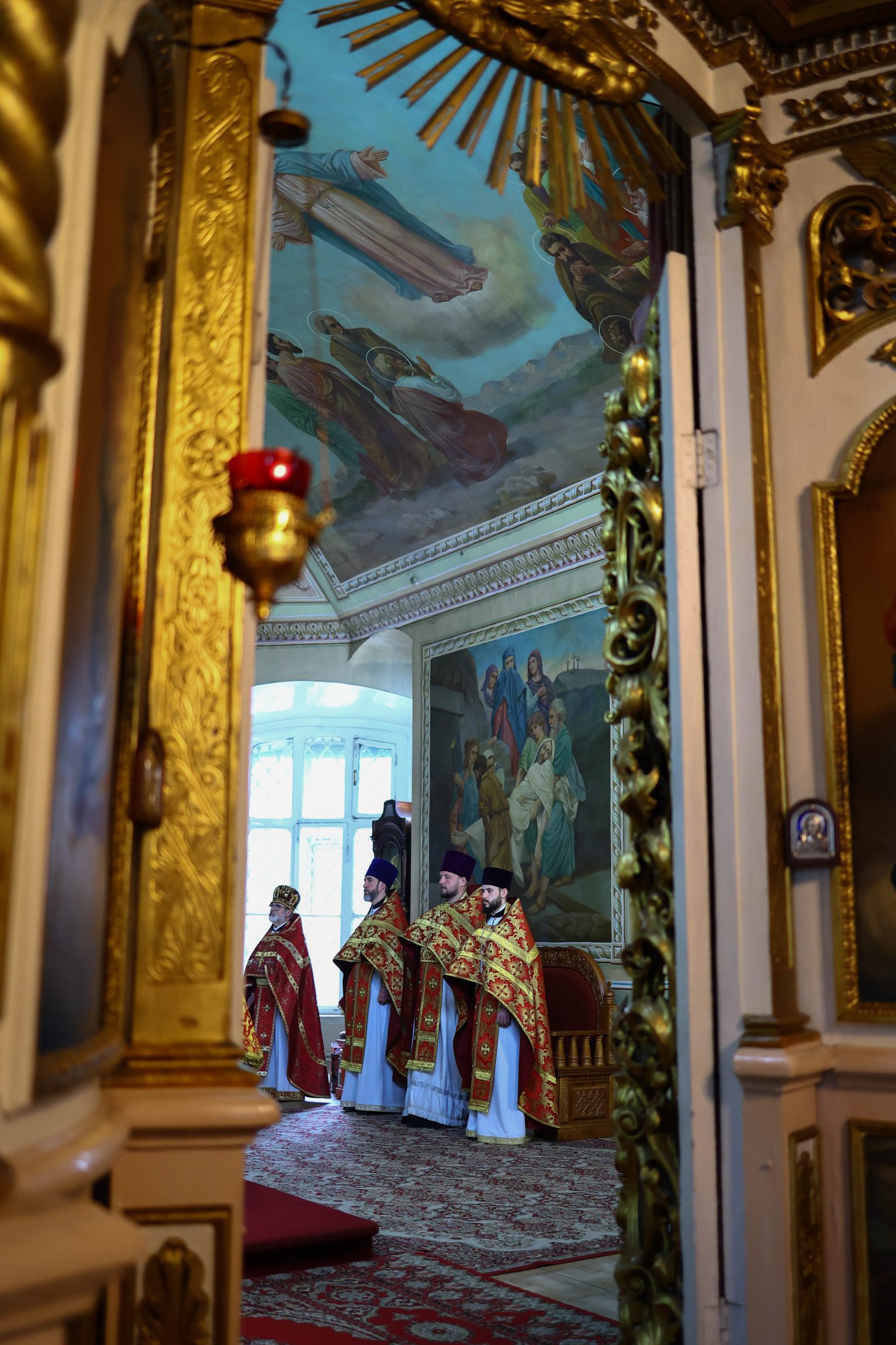 На сугубой ектении вознесены молитвы о благопоспешении христолюбивому Российскому воинству в установлении мира в сию лихую годину, на Святую Русь нашедшую, о мире на Украине, а также о сохранении единства святого Православия.