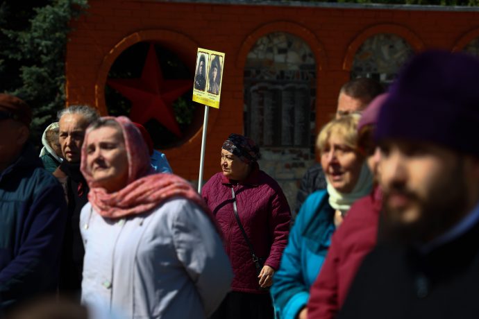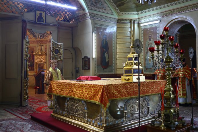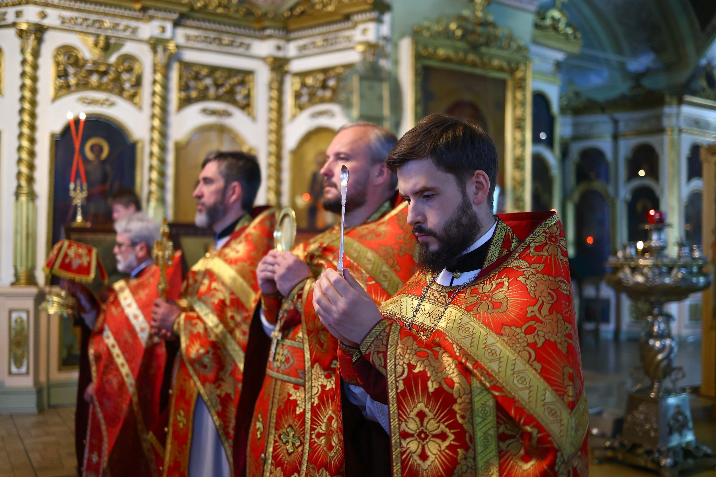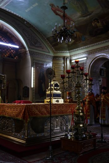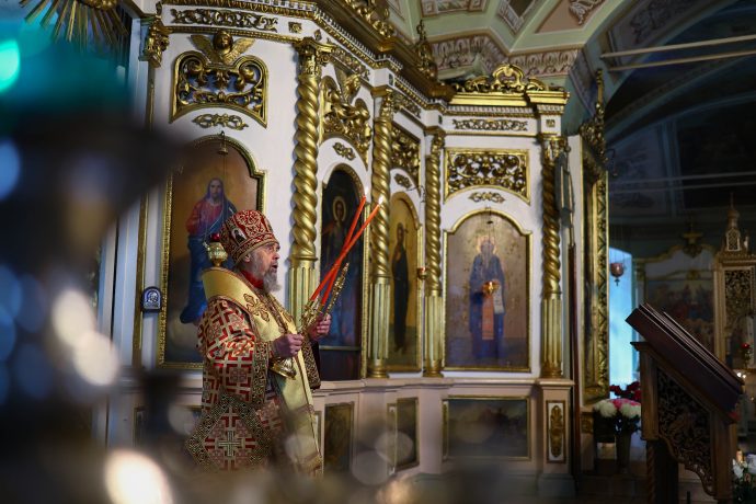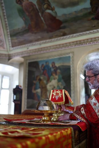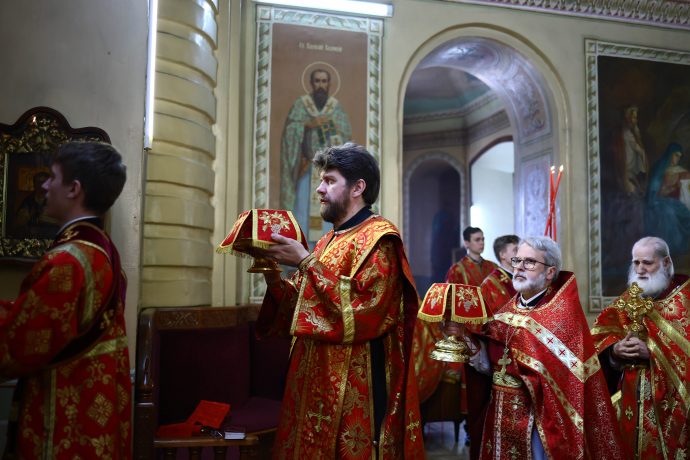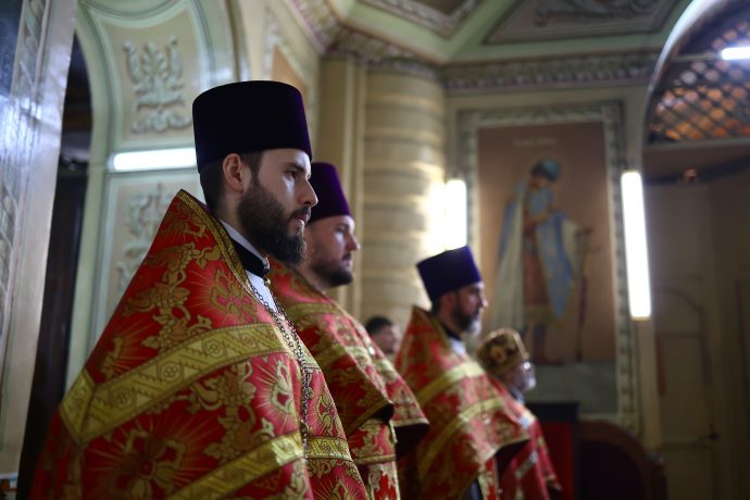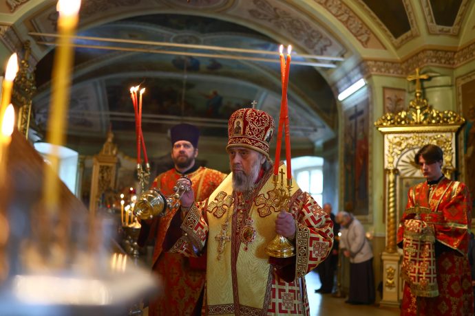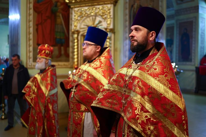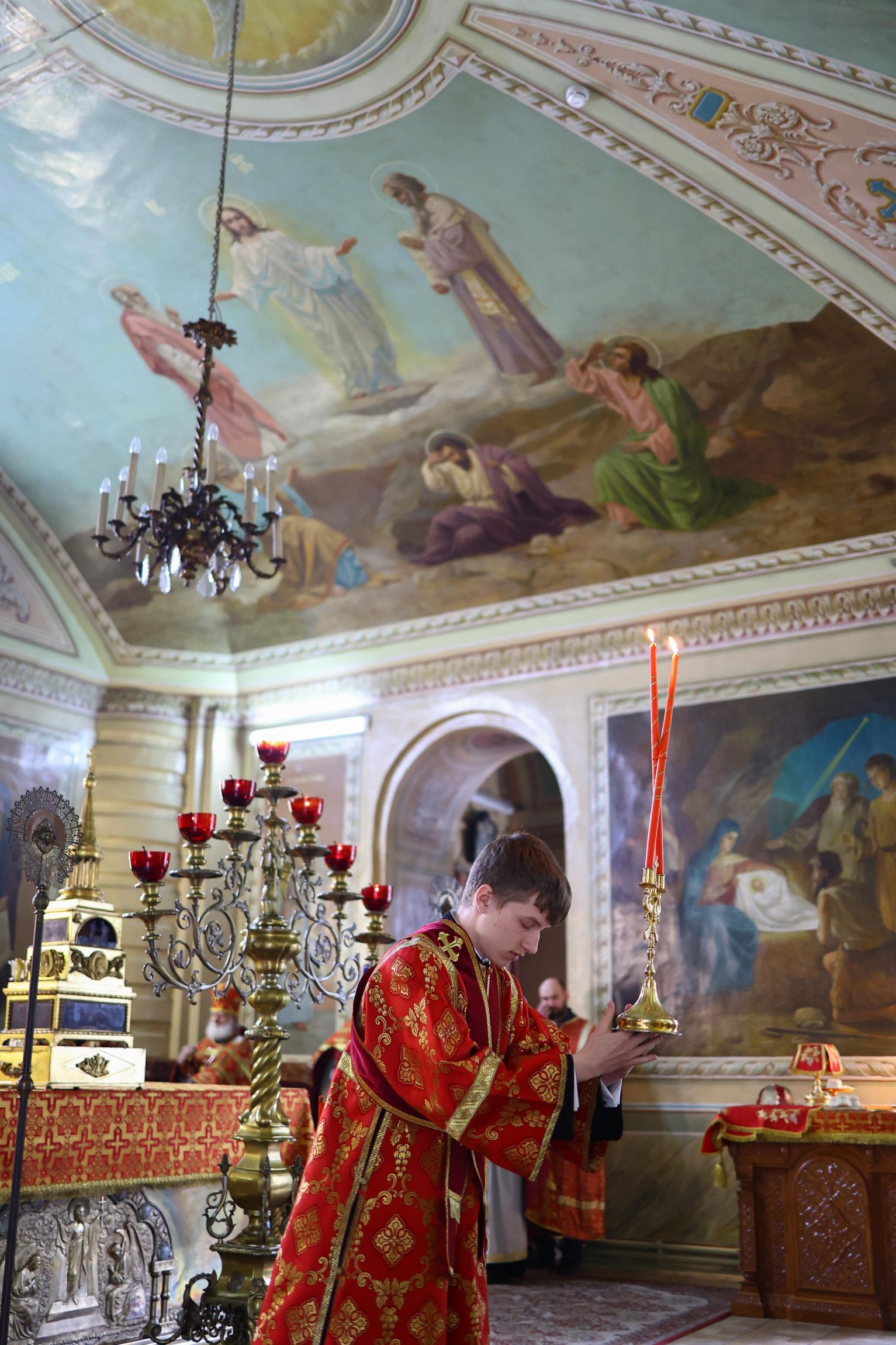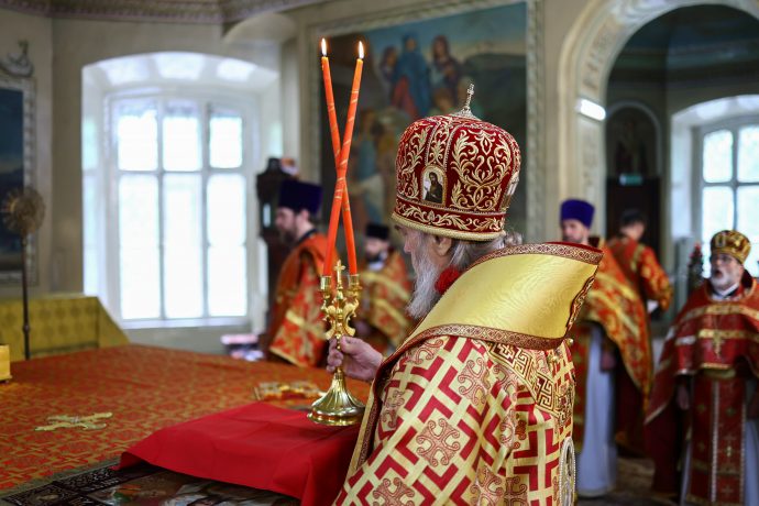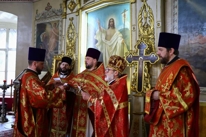 На сугубой ектении вознесены молитвы о благопоспешении христолюбивому Российскому воинству в установлении мира в сию лихую годину, на Святую Русь нашедшую, о мире на Украине, а также о сохранении единства святого Православия.