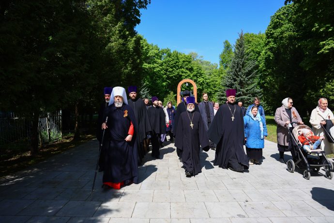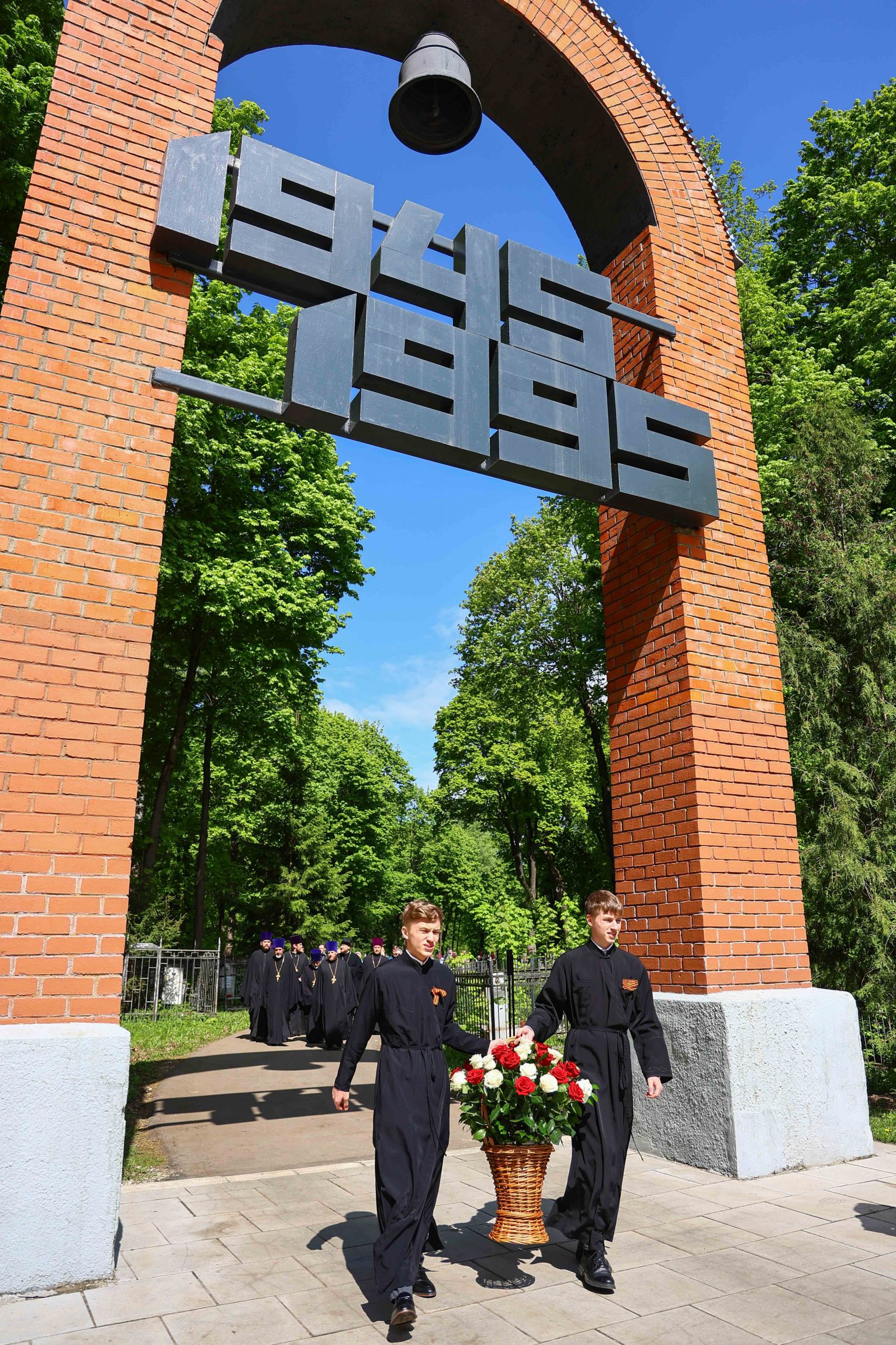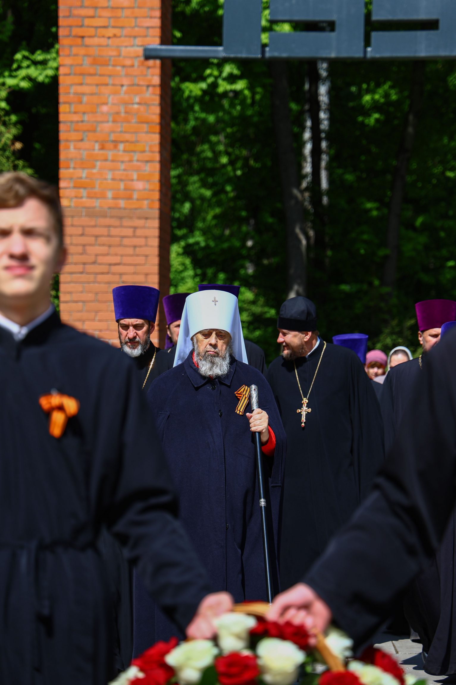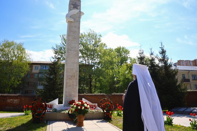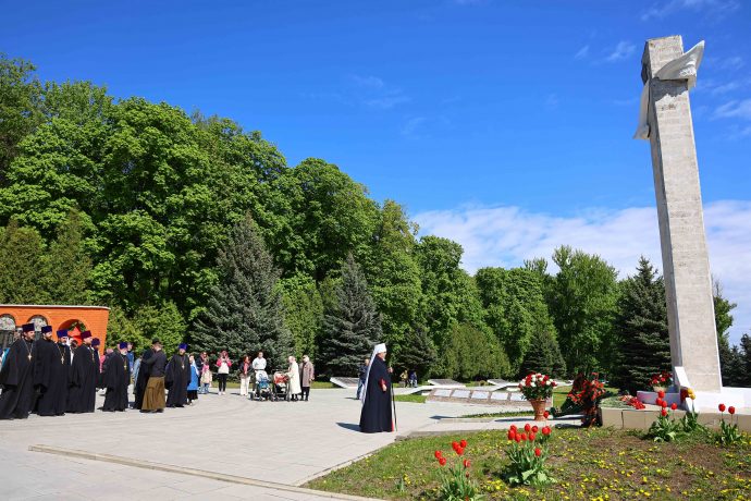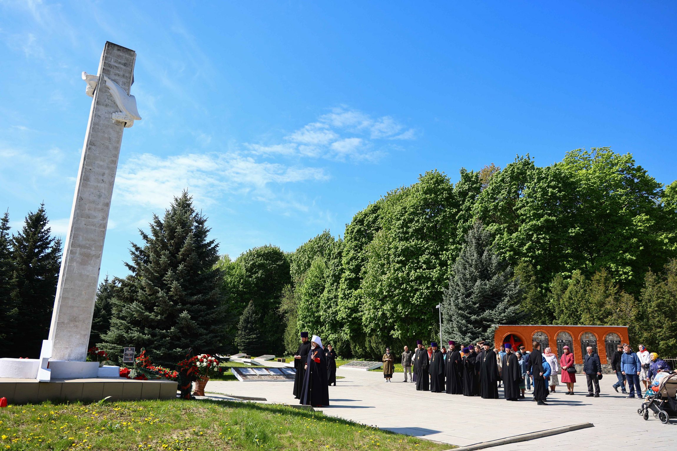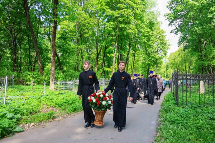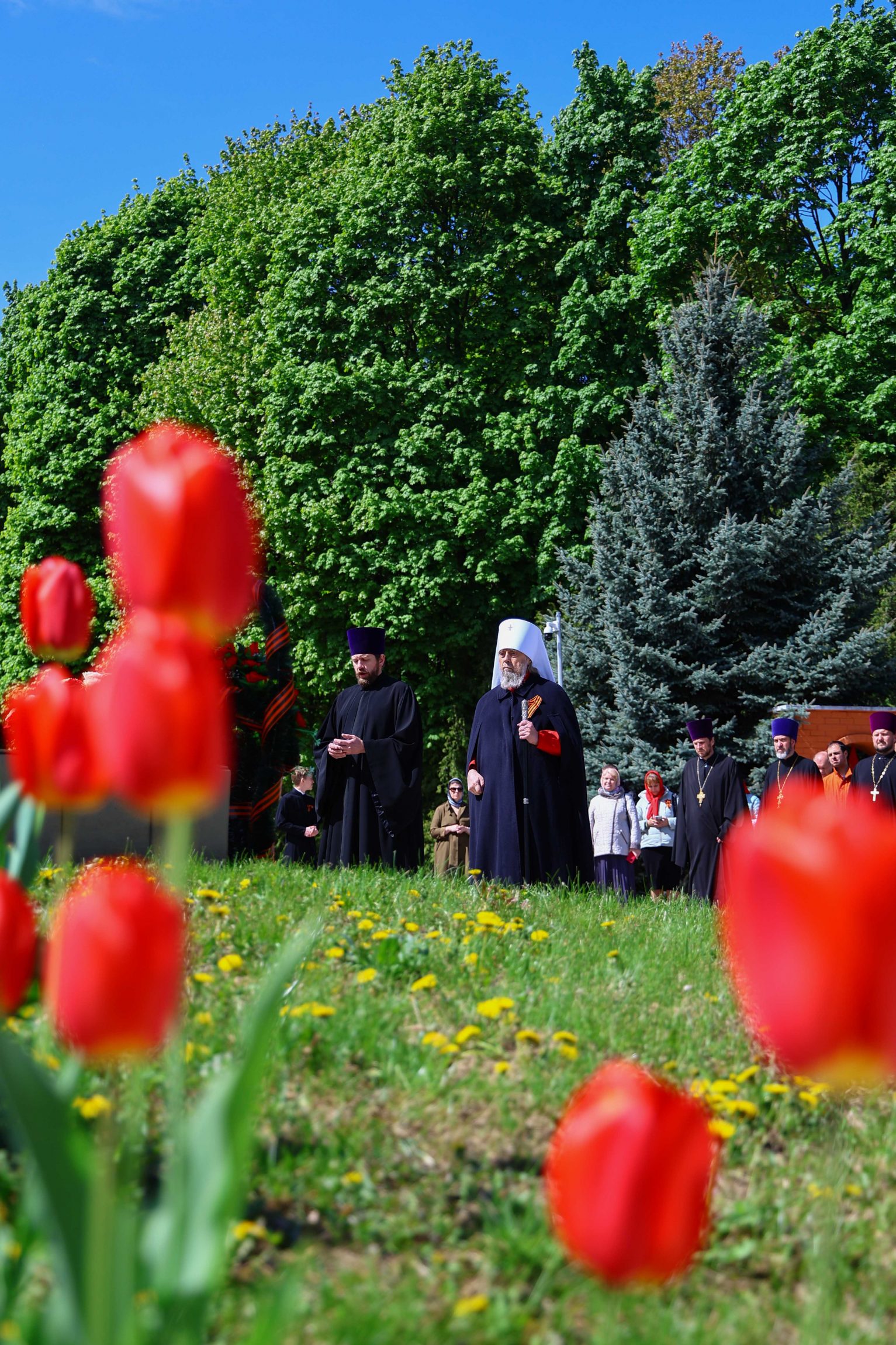 После чего архипастырь возглавил шествие духовенства и паствы к расположенному на старинном Всехсвятском кладбище мемориалу Защитникам Отечества, где поздравил всех с Днем Победы: «Восьмидесятая сия весна в истории нашего народа, Отечества и Святой нашей Матери, Русской Православной Церкви, соединяет собой сугубую радость Христовой победы над осуществленным подвигом Его самозабвенной жертвенной любви безвластием смерти навсегда удерживать поглощаемых ею грехолюбцев и смертотворцев и радость победы христоподобного человеческого духа наших прадедов и дедов, отдавших самое дорогое, что у них было, — жизнь, в непостыдной надежде, что все устрояющий ко благу миробытия человека Бог, во Святой Троице славимый и поклоняемый, ради этого их жизненного труда и христоподобного подвига даст возможность на бескрайних просторах Отечества нашего продолжаться жизни, человеческому творчеству, духовному прозрению путей Божественного Промысла и искренней ответной сердечной благодарности, немеркнущей из поколения в поколение, человеческих сердец всем тем, кто христоподобно принес в эти 1418 дней такой жертвенный высокий подвиг.