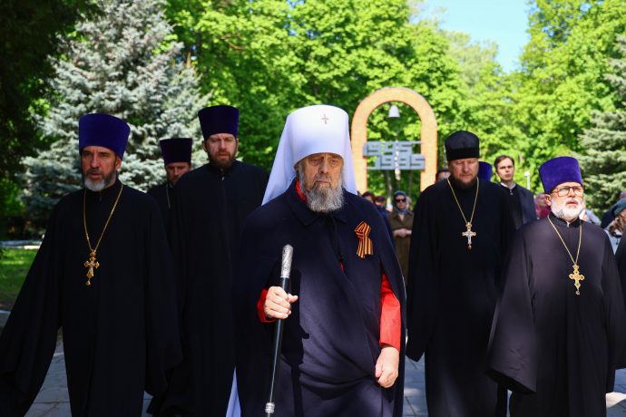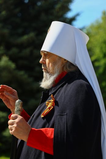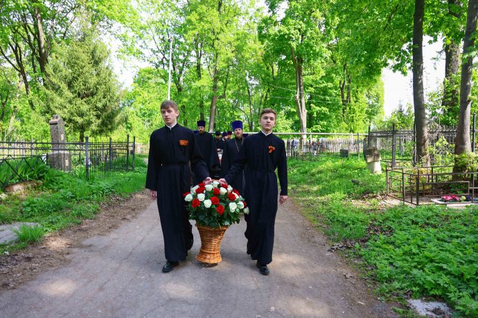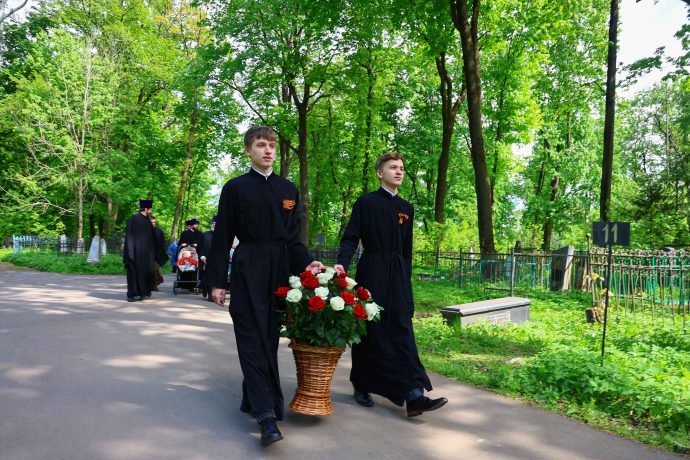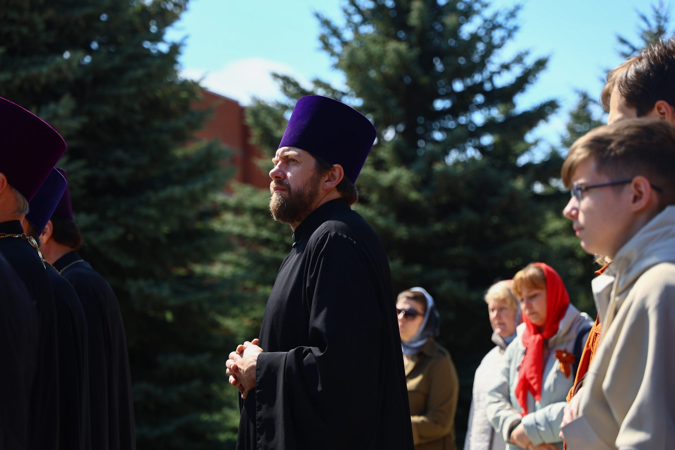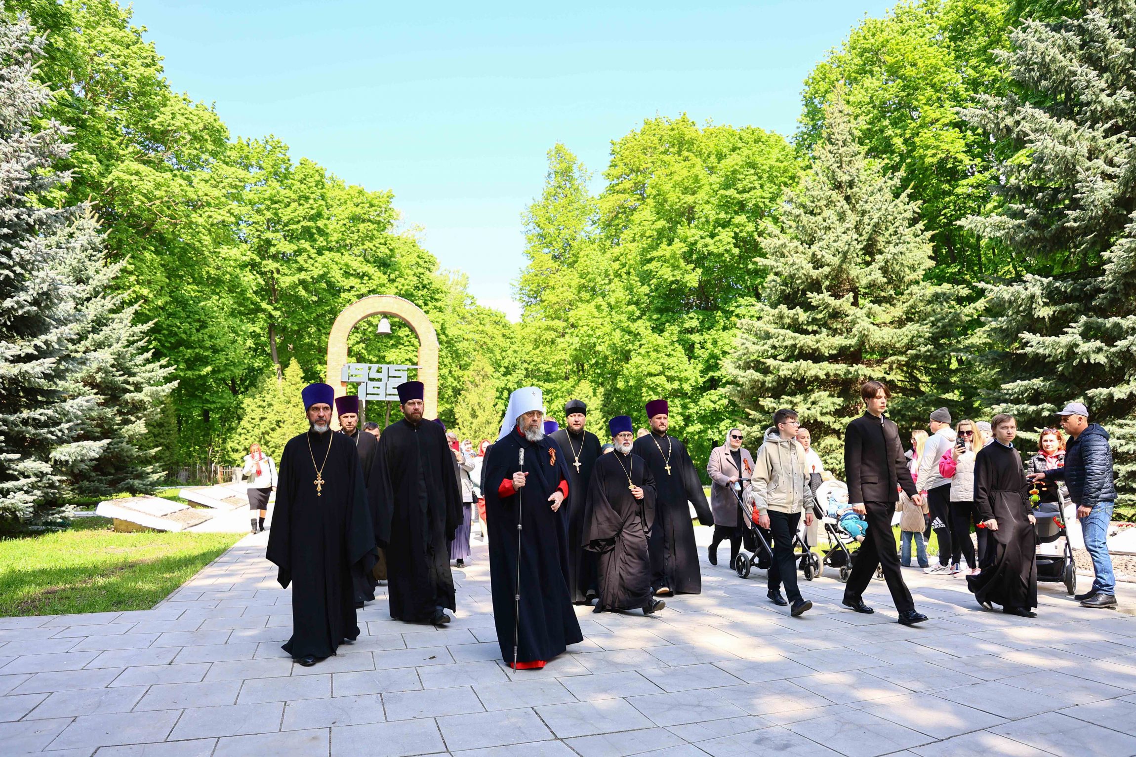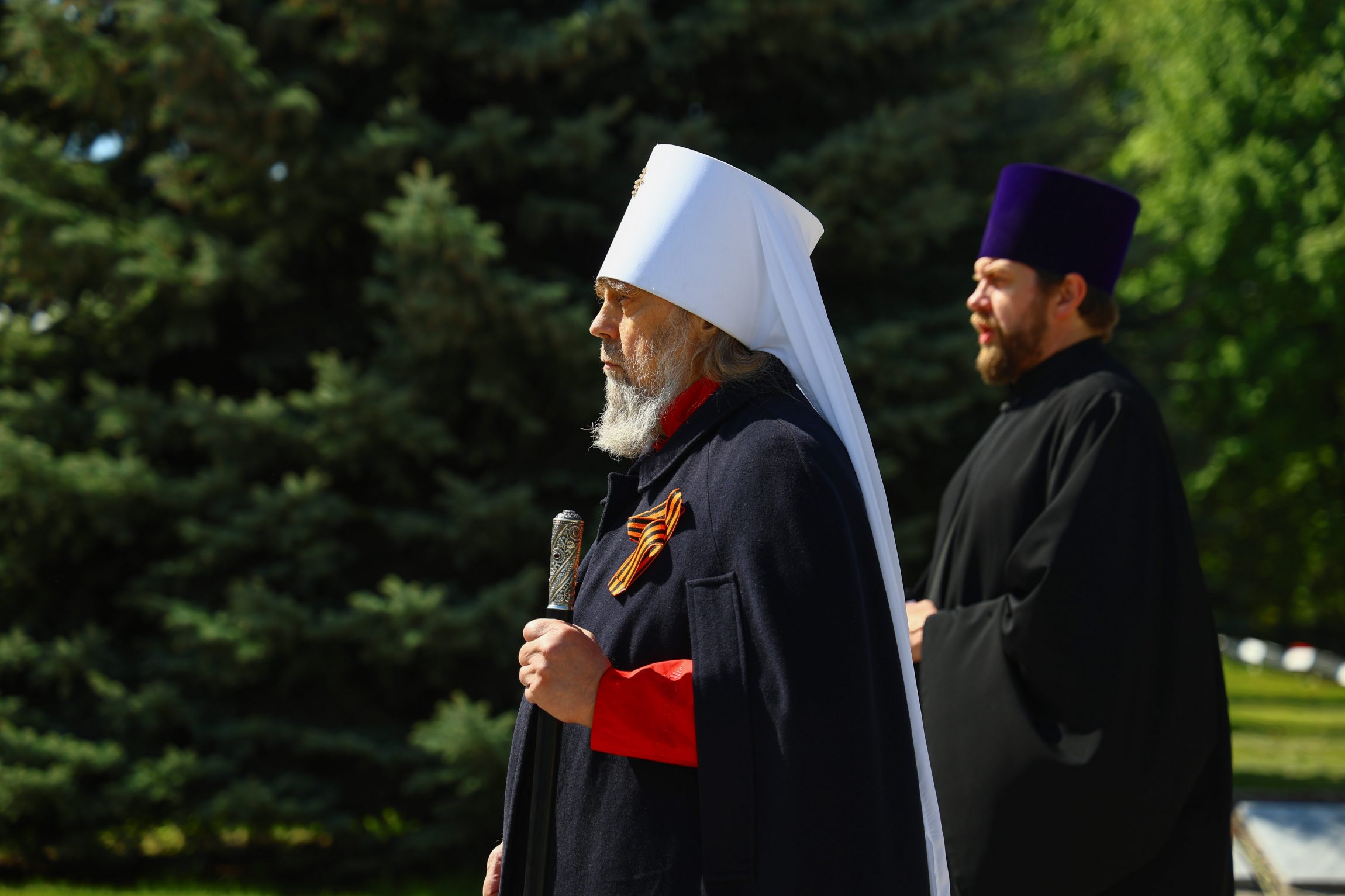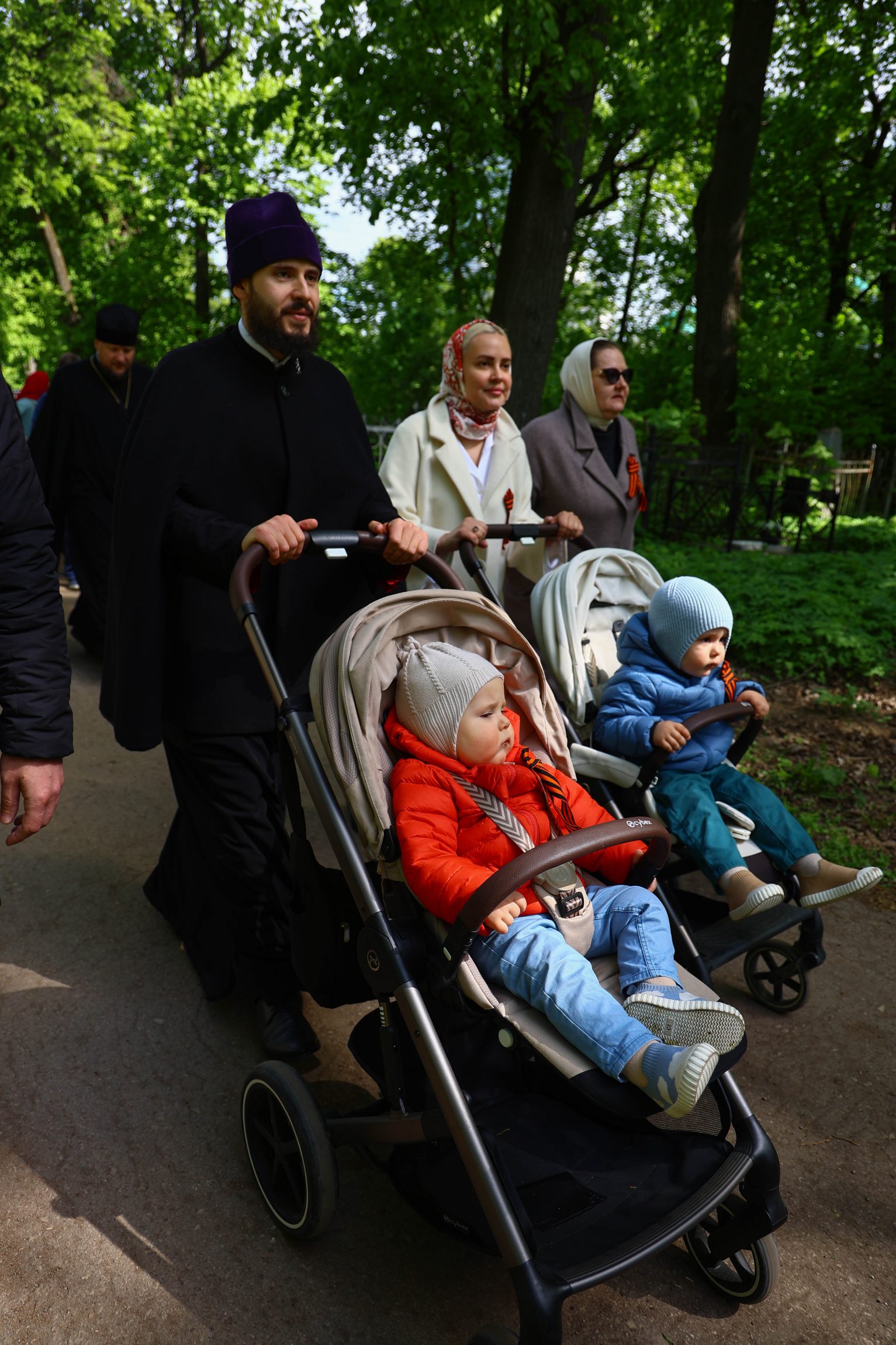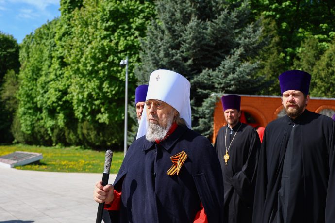 После чего архипастырь возглавил шествие духовенства и паствы к расположенному на старинном Всехсвятском кладбище мемориалу Защитникам Отечества, где поздравил всех с Днем Победы: «Восьмидесятая сия весна в истории нашего народа, Отечества и Святой нашей Матери, Русской Православной Церкви, соединяет собой сугубую радость Христовой победы над осуществленным подвигом Его самозабвенной жертвенной любви безвластием смерти навсегда удерживать поглощаемых ею грехолюбцев и смертотворцев и радость победы христоподобного человеческого духа наших прадедов и дедов, отдавших самое дорогое, что у них было, — жизнь, в непостыдной надежде, что все устрояющий ко благу миробытия человека Бог, во Святой Троице славимый и поклоняемый, ради этого их жизненного труда и христоподобного подвига даст возможность на бескрайних просторах Отечества нашего продолжаться жизни, человеческому творчеству, духовному прозрению путей Божественного Промысла и искренней ответной сердечной благодарности, немеркнущей из поколения в поколение, человеческих сердец всем тем, кто христоподобно принес в эти 1418 дней такой жертвенный высокий подвиг.