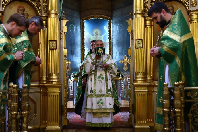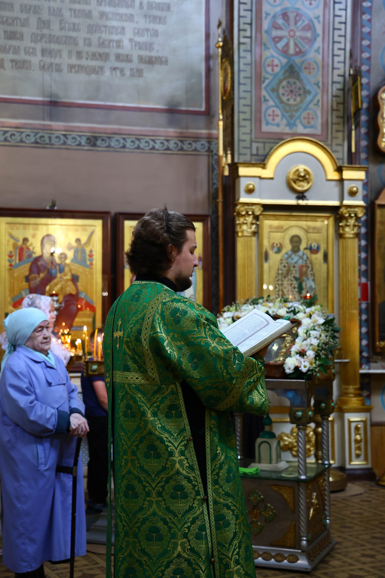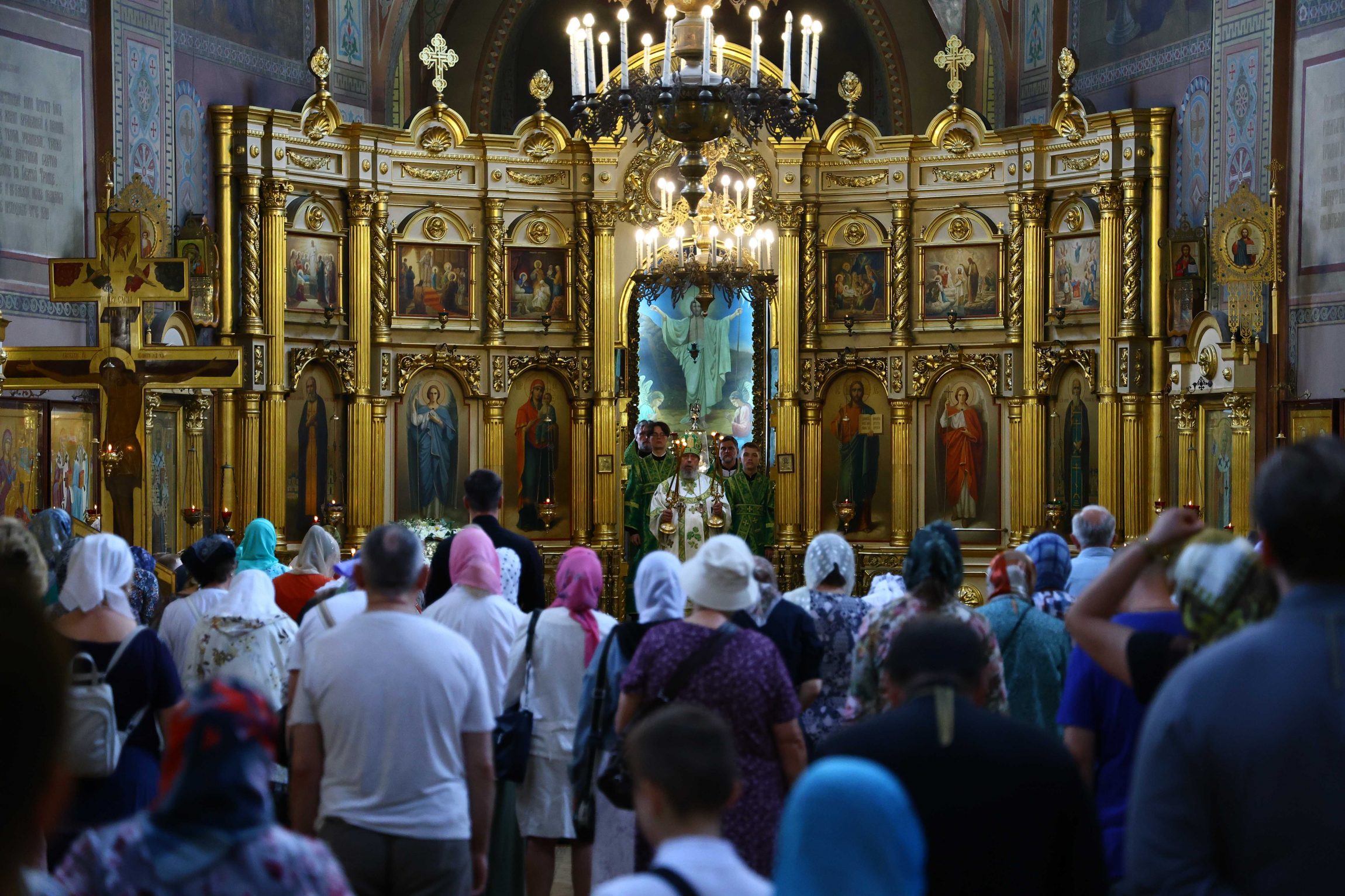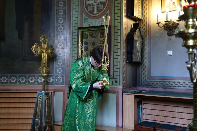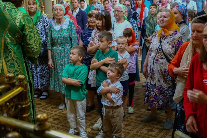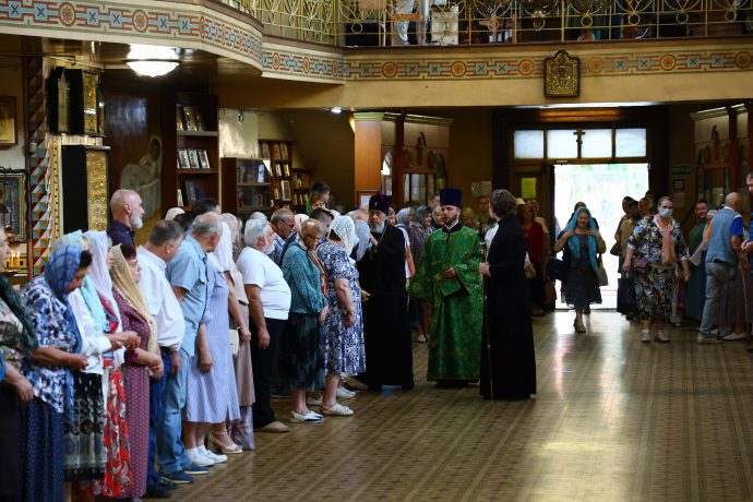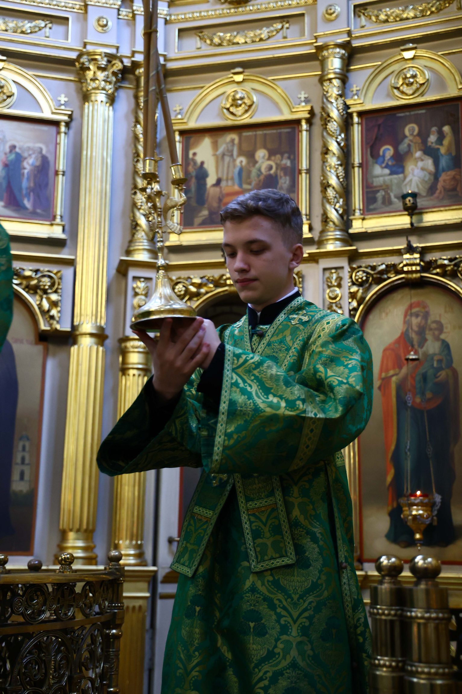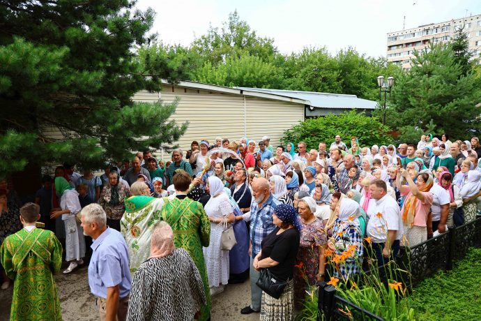 На сугубой ектении вознесены молитвы о благопоспешении христолюбивому Российскому воинству в установлении мира в сию лихую годину, на Святую Русь нашедшую, о мире на Украине, а также о сохранении единства святого Православия.