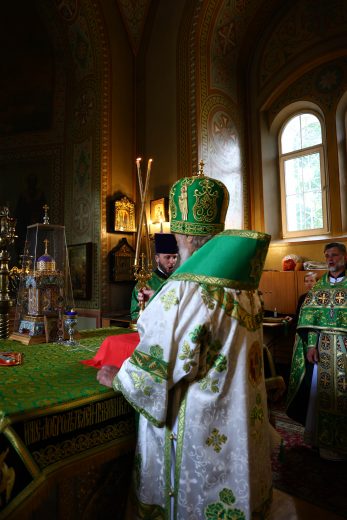 Затем владыка приветствовал молящихся и приступивших к Святой Чаше, поздравив их с духовным торжеством: «Словом мира и любви о Христе приветствую всех вас, всечестные отцы и возлюбленные о Господе братья и сестры, в благословенный день престольного праздника сего святого храма, келии преподобного и богоносного аввы нашего Сергия Великого, пребывающей усердием пращуров наших и ближайших, хорошо ведомых и любимых христолюбивых человеков, сохранивших ее для нас и, будем надеяться, для последующих поколений на богоспасаемой земле славного города-героя Тулы!