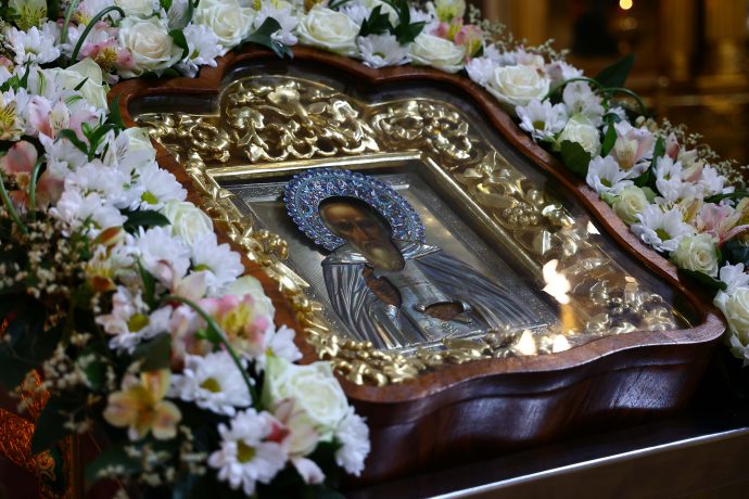 По окончании богослужения совершено славление Преподобному Сергию перед чтимым образом с частицей его святых мощей.