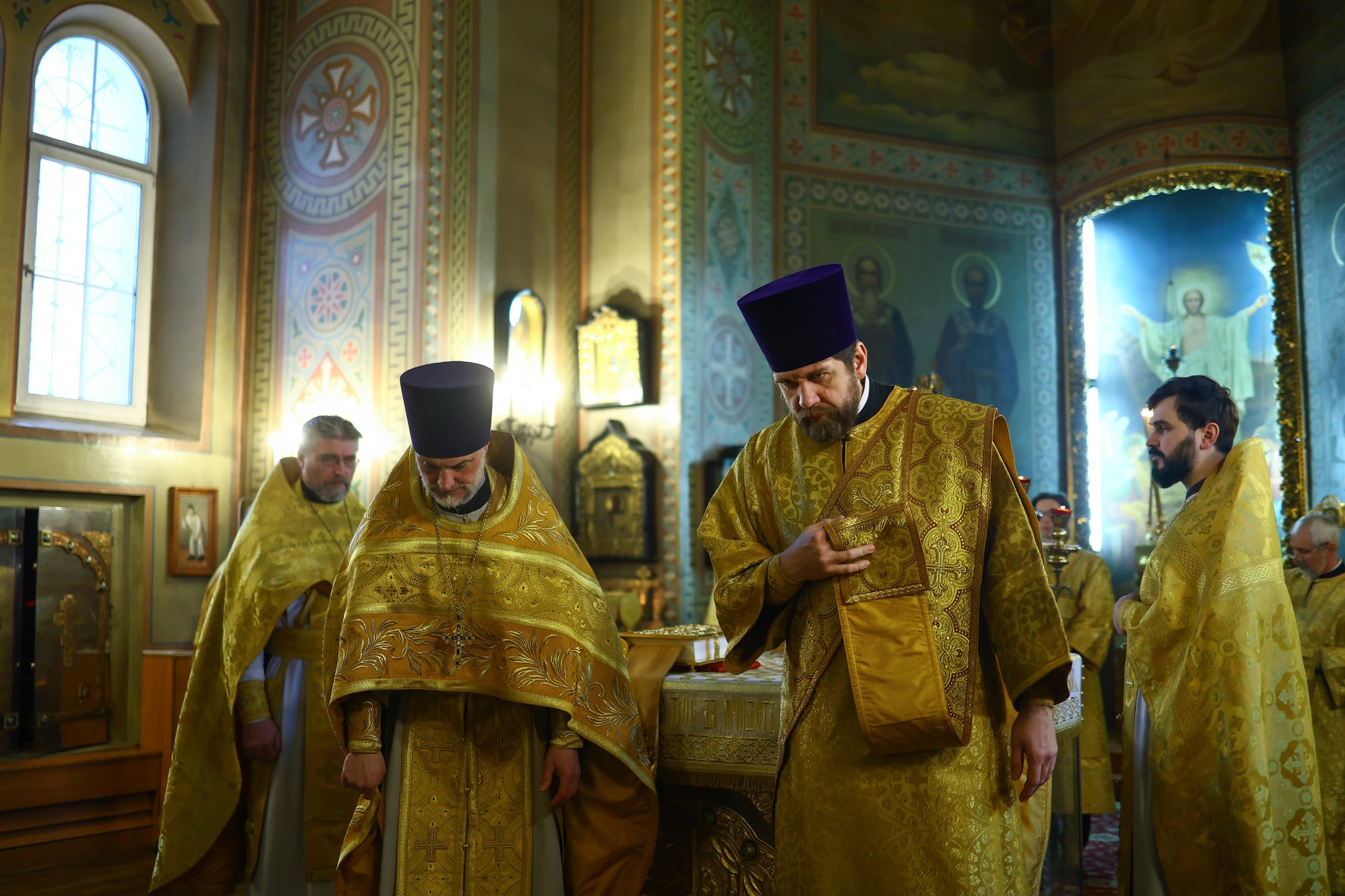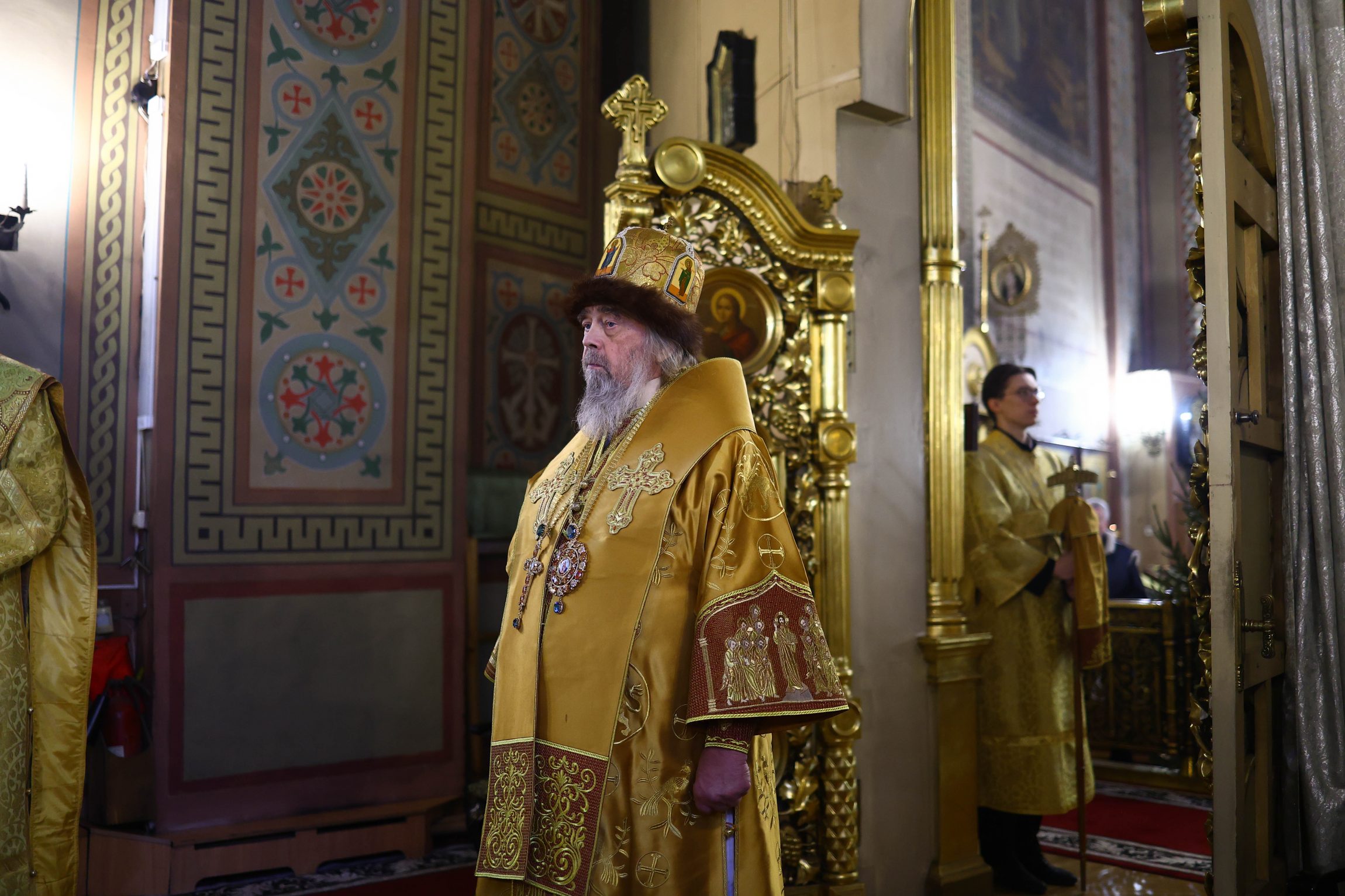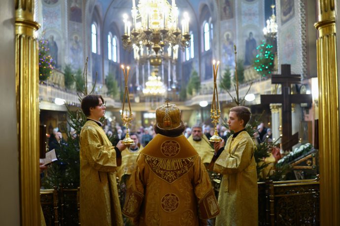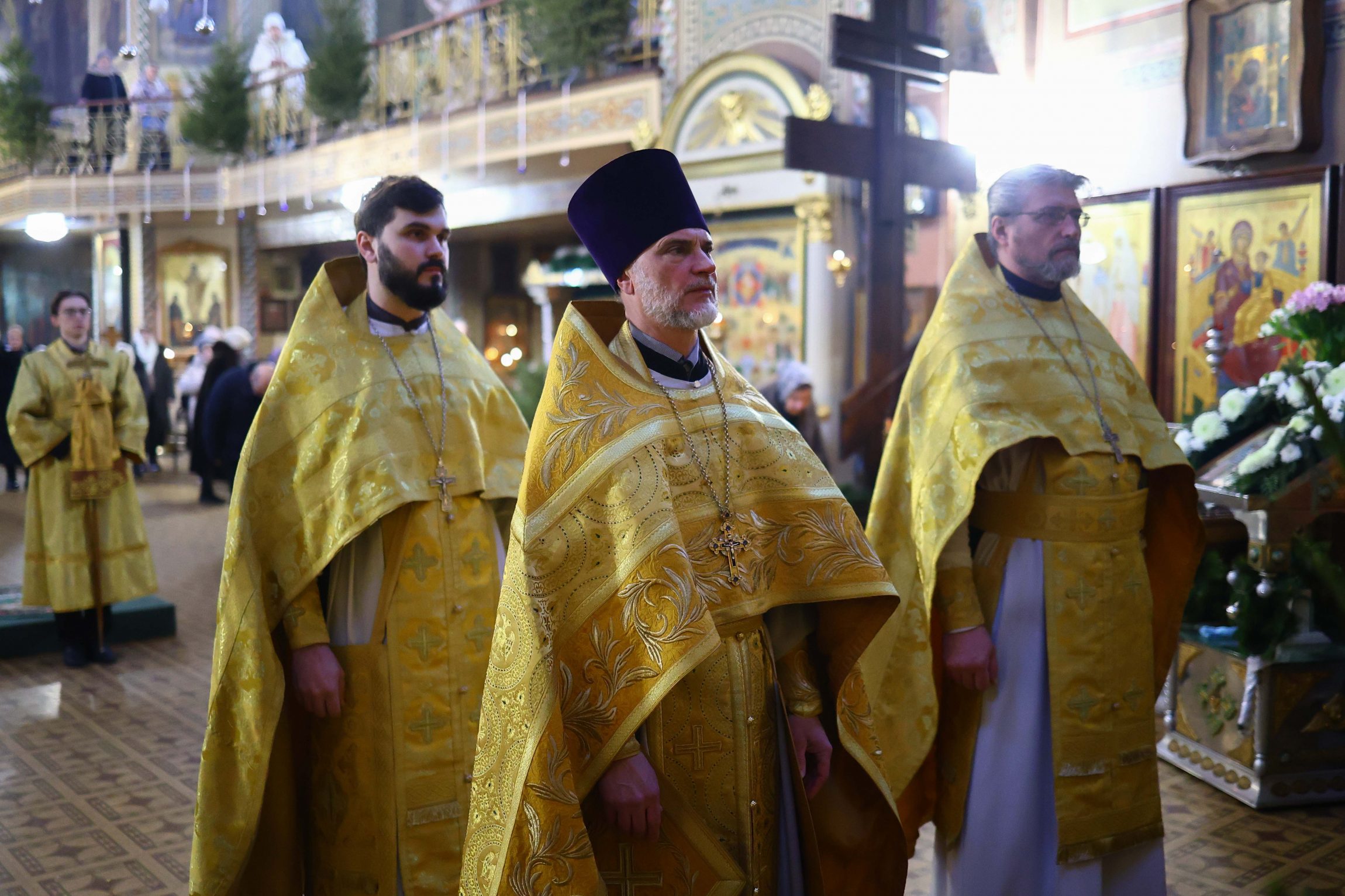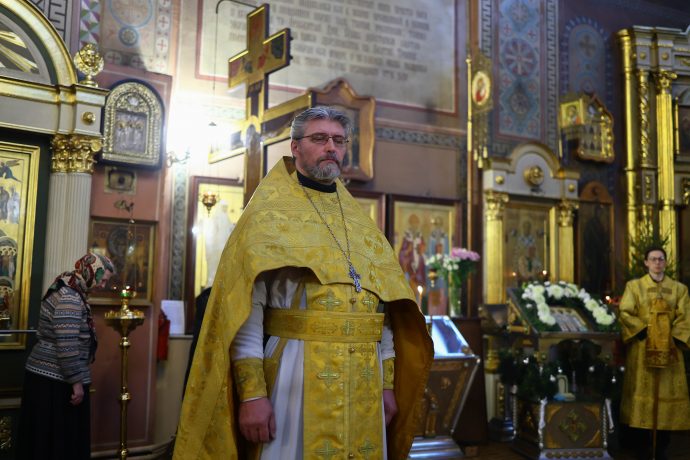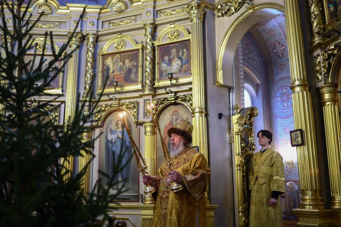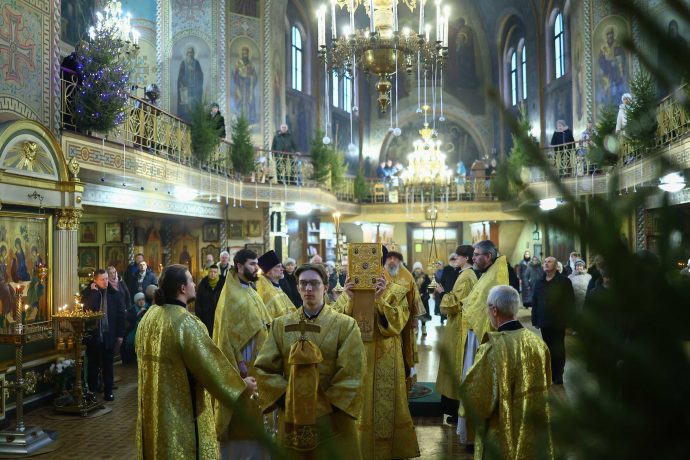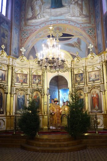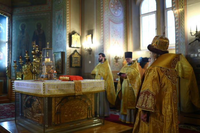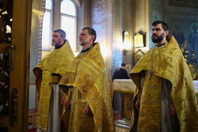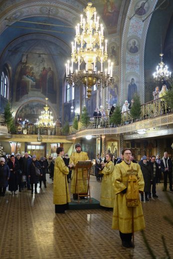 На сугубой ектении вознесены молитвы о благопоспешении христолюбивому Российскому воинству в установлении мира в сию лихую годину, на Святую Русь нашедшую, о мире на Украине, а также о сохранении единства святого Православия.