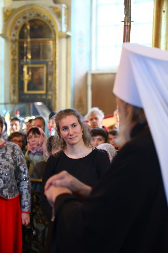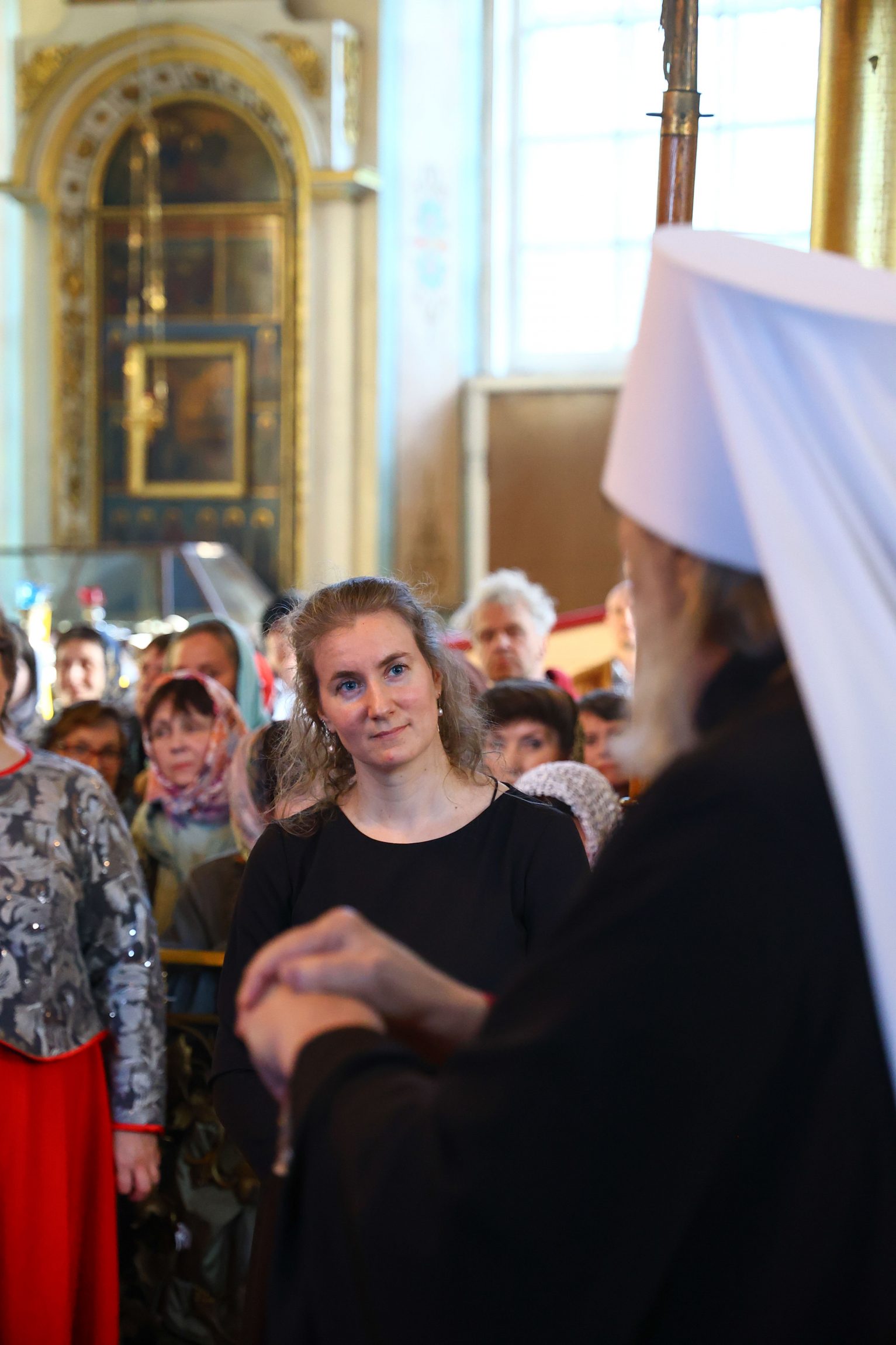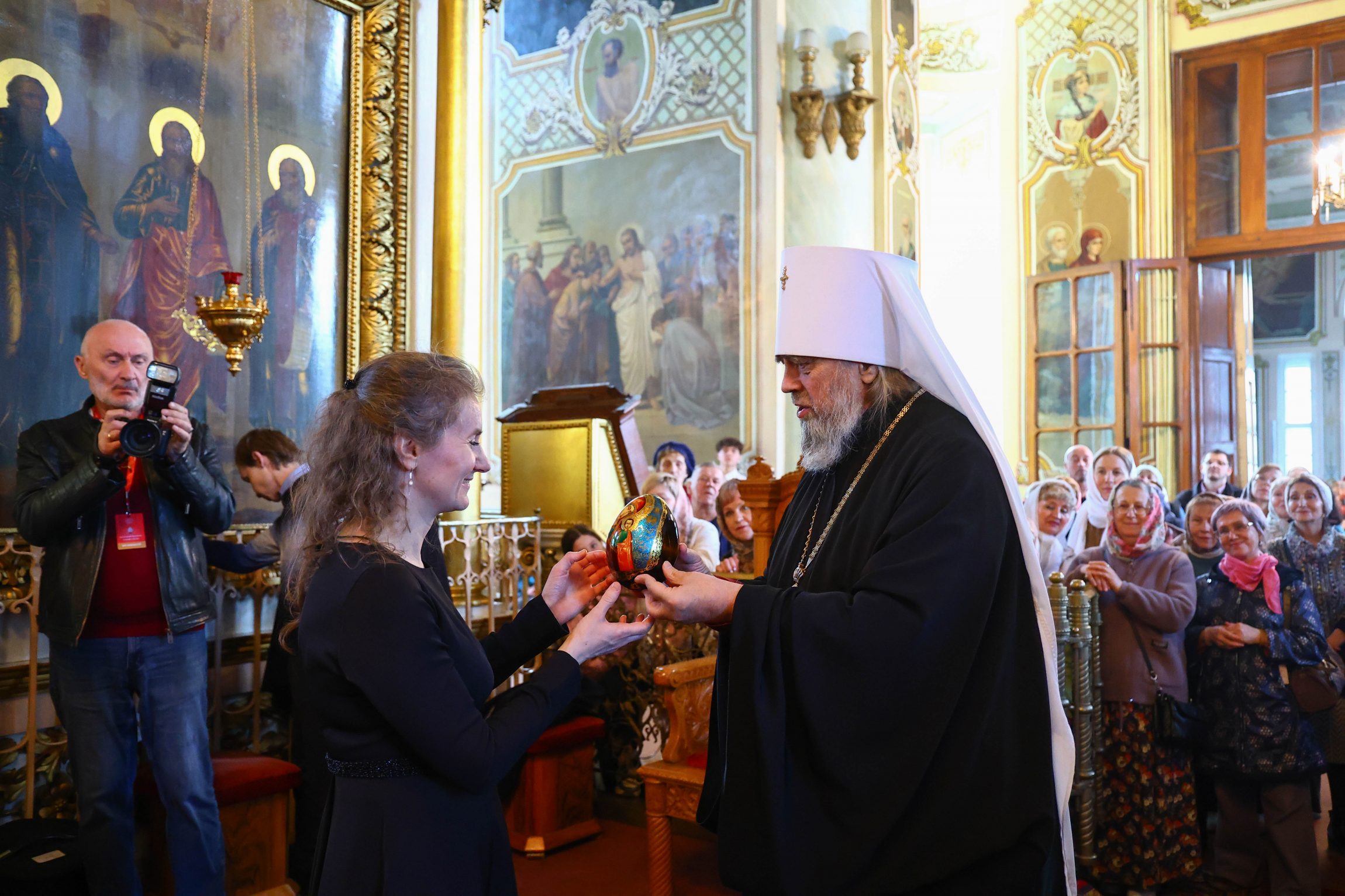 В знак признательности за светлый пасхальный дар тулякам владыка Алексий вручил руководителю коллектива Екатерине Юрьевне Антоненко памятный подарок и цветы.