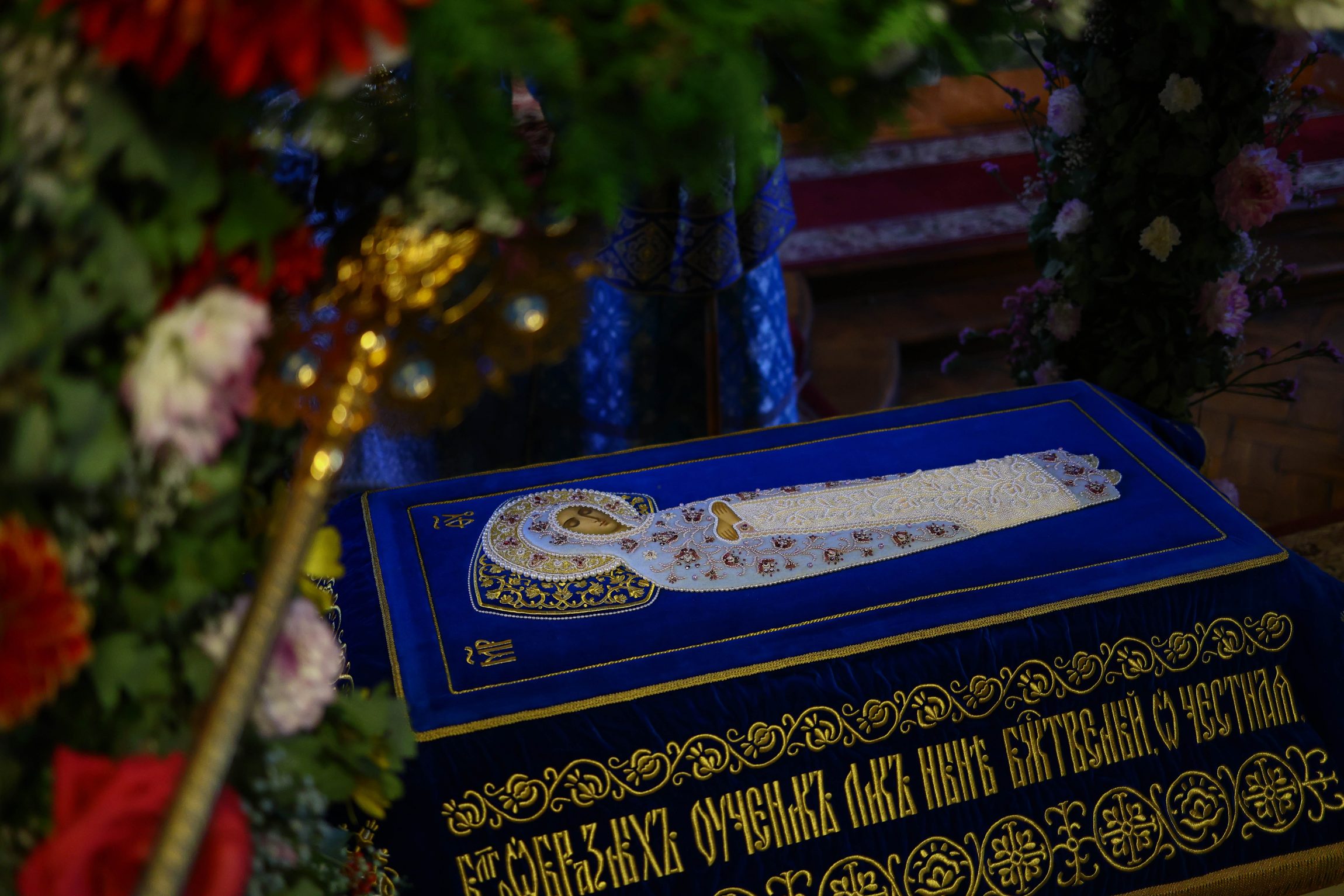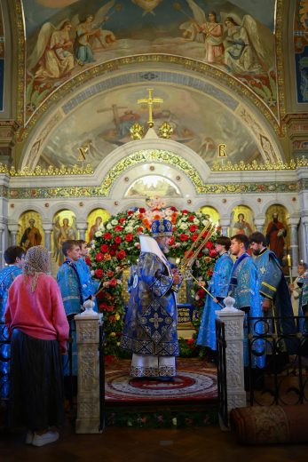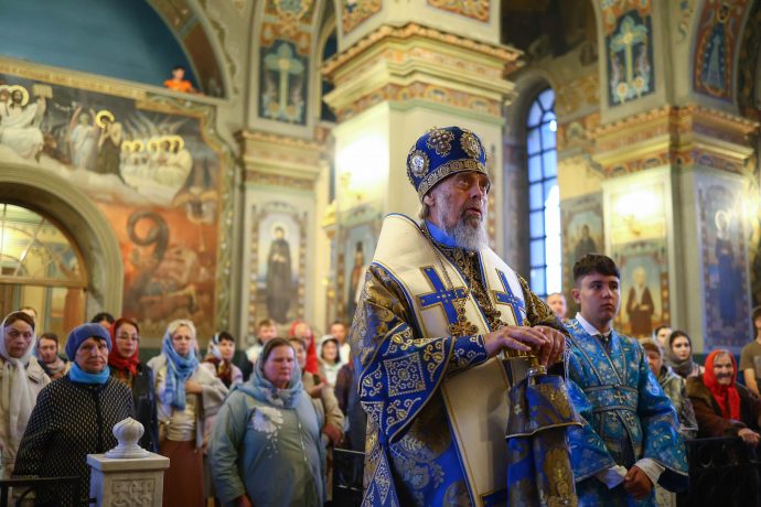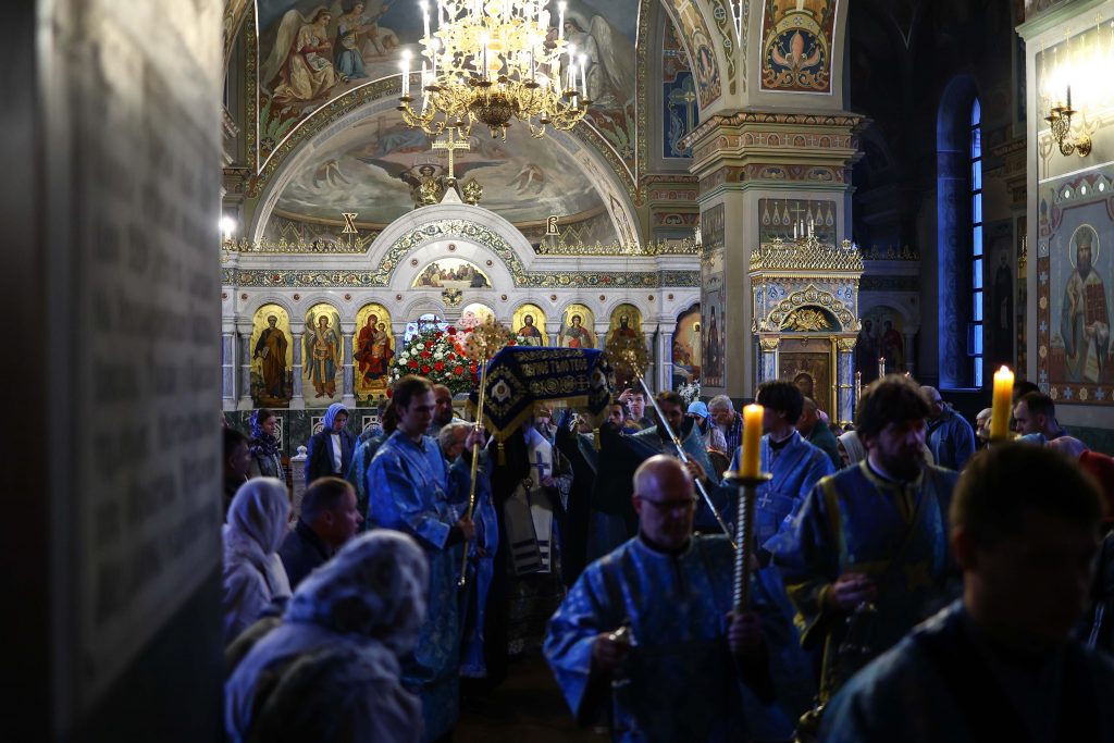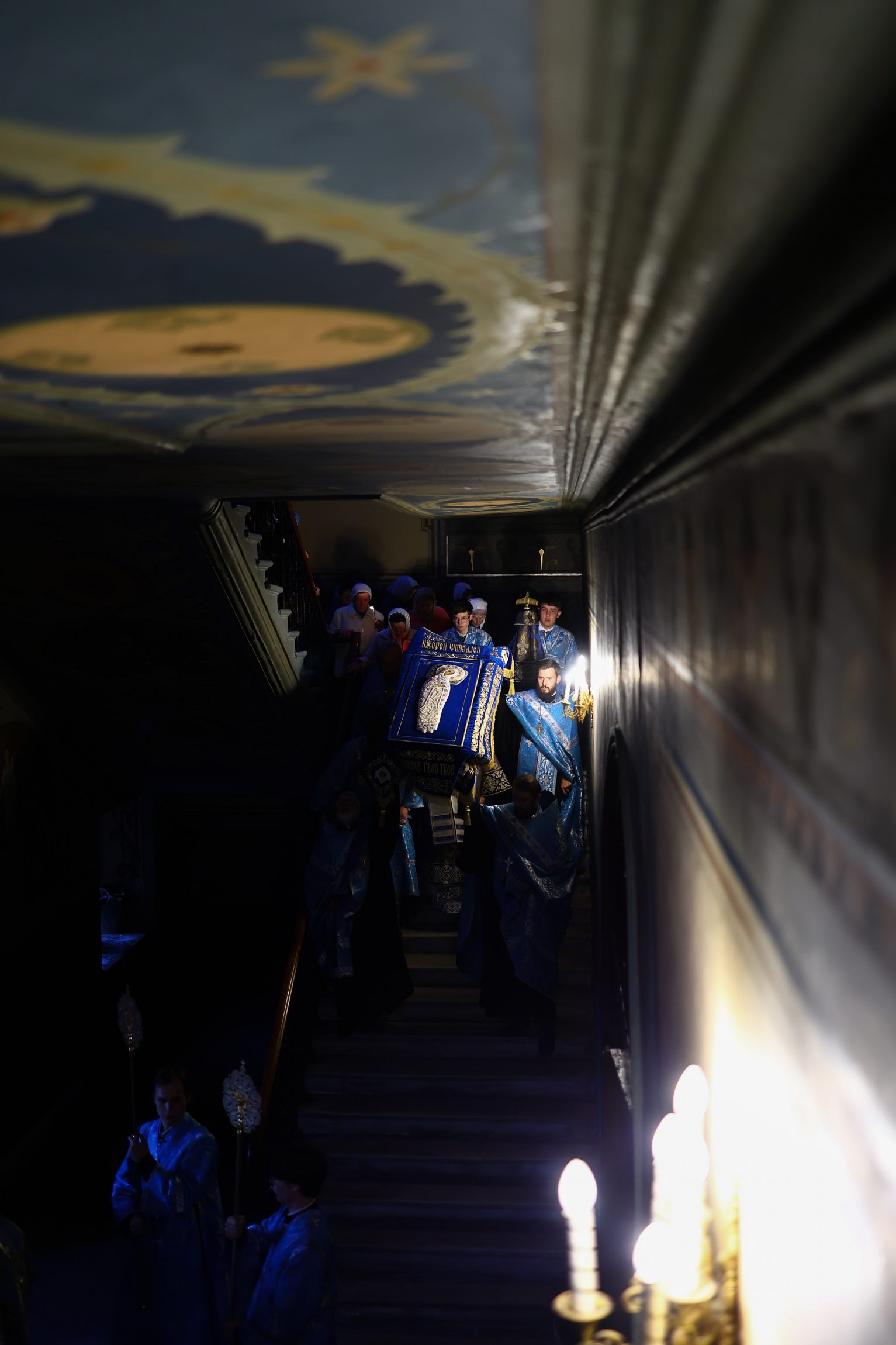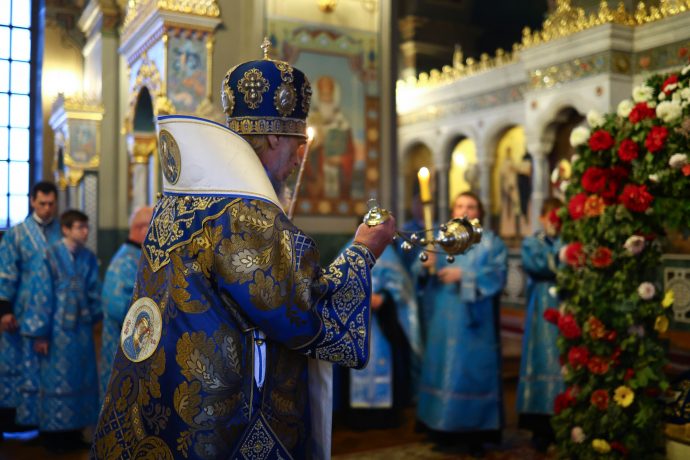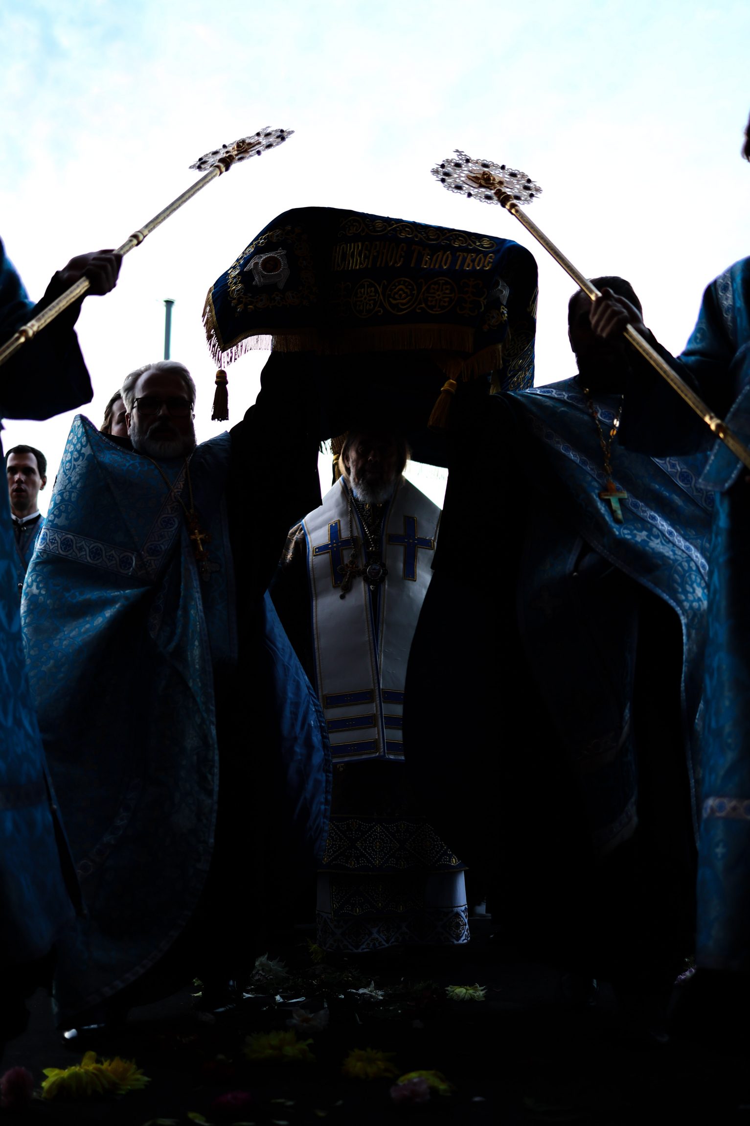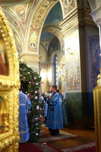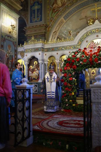По окончании богослужения владыка словом мира и любви о Христе приветствовал предстоящих: «В сей нареченный и святой вечер Богородничной пасхи милостью Божией сердца наши вновь исполнены особой признательности, искренней детской благодарности и ответной любви к тому дару, который стяжала Преблагословенная Владычица наша Богородица, Царица Небесная и Матерь Жизни нашей, когда восприняла в Себя не только всю полноту Божественных нетварных даров благодати Святой Живоначальной Троицы как Свое собственное достояние, но единственным и неповторимым образом взаимодействия с Богом, во Святой Троице славимом и поклоняемом, явилась живым нерукотворенным храмом и жилищем для Единородного Божьего Сына, непосредственным участием в осуществлении Божественного домостроительства искупительного воплощения и вочеловечения Бога Слова, существенно став Приснодевой-Богородицей.