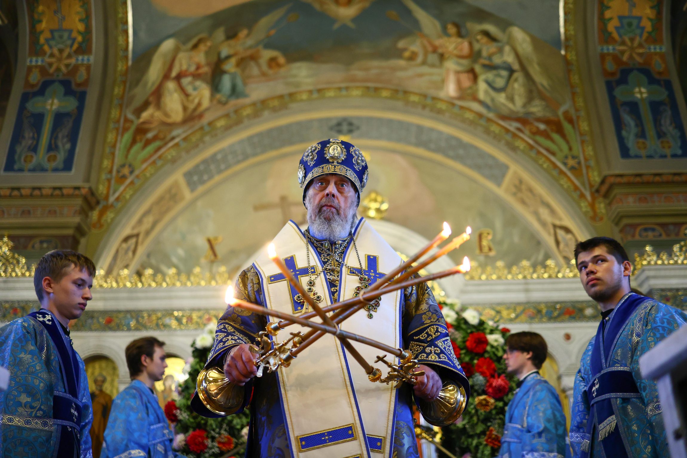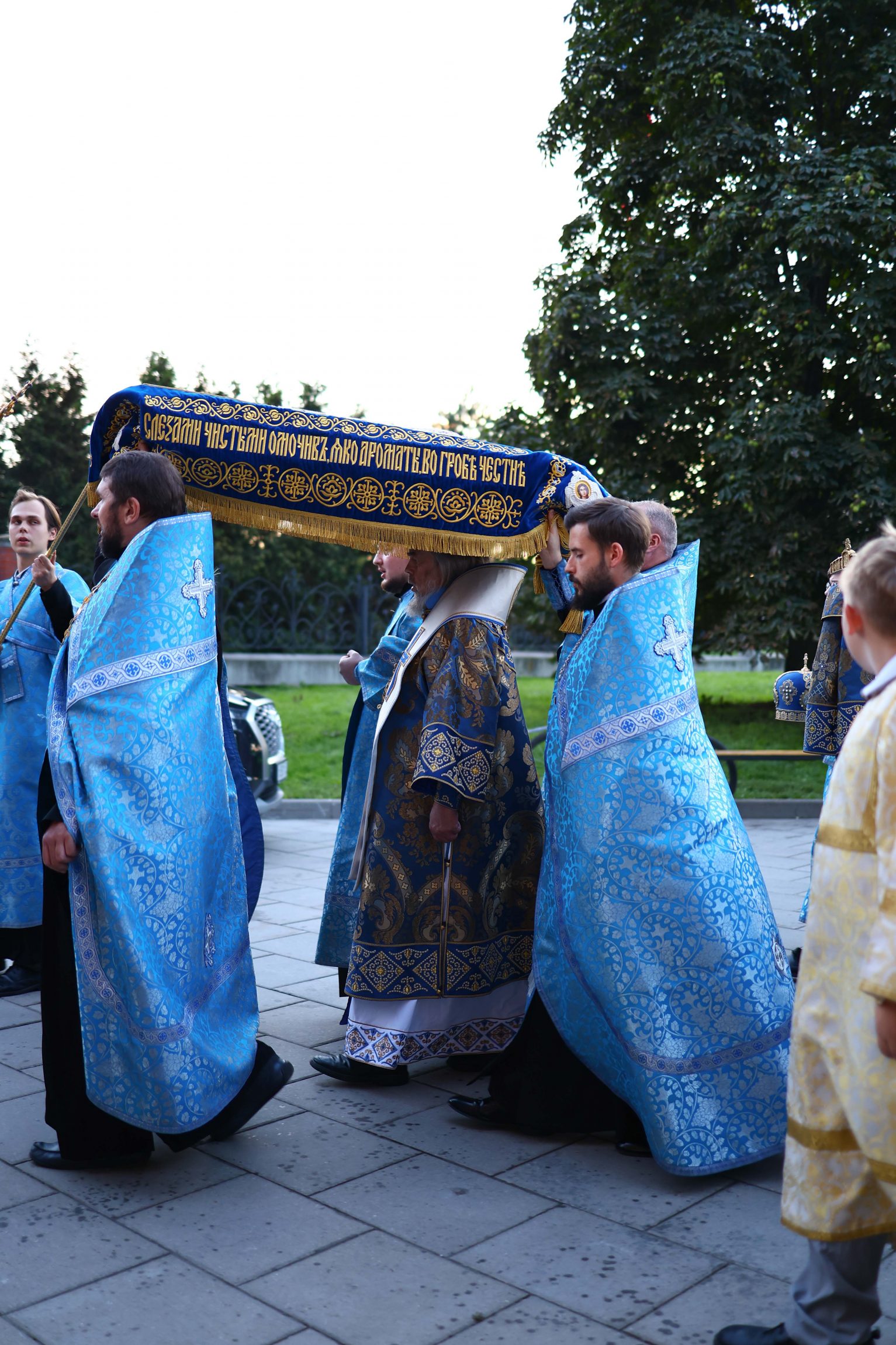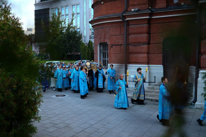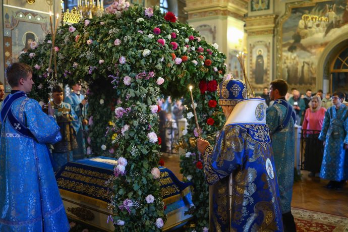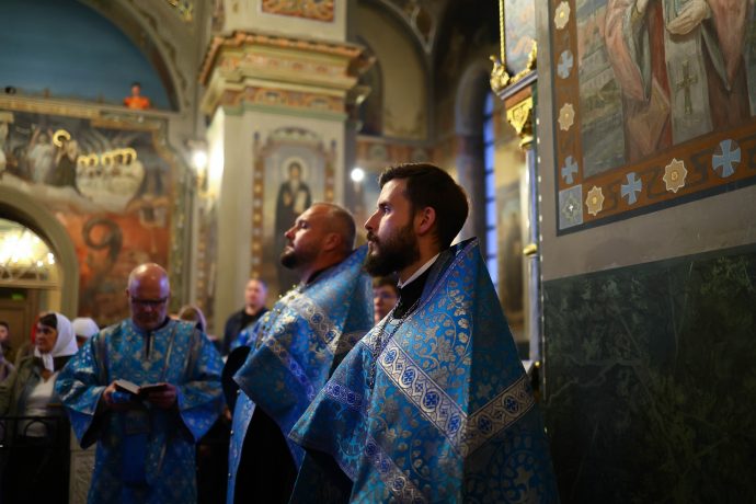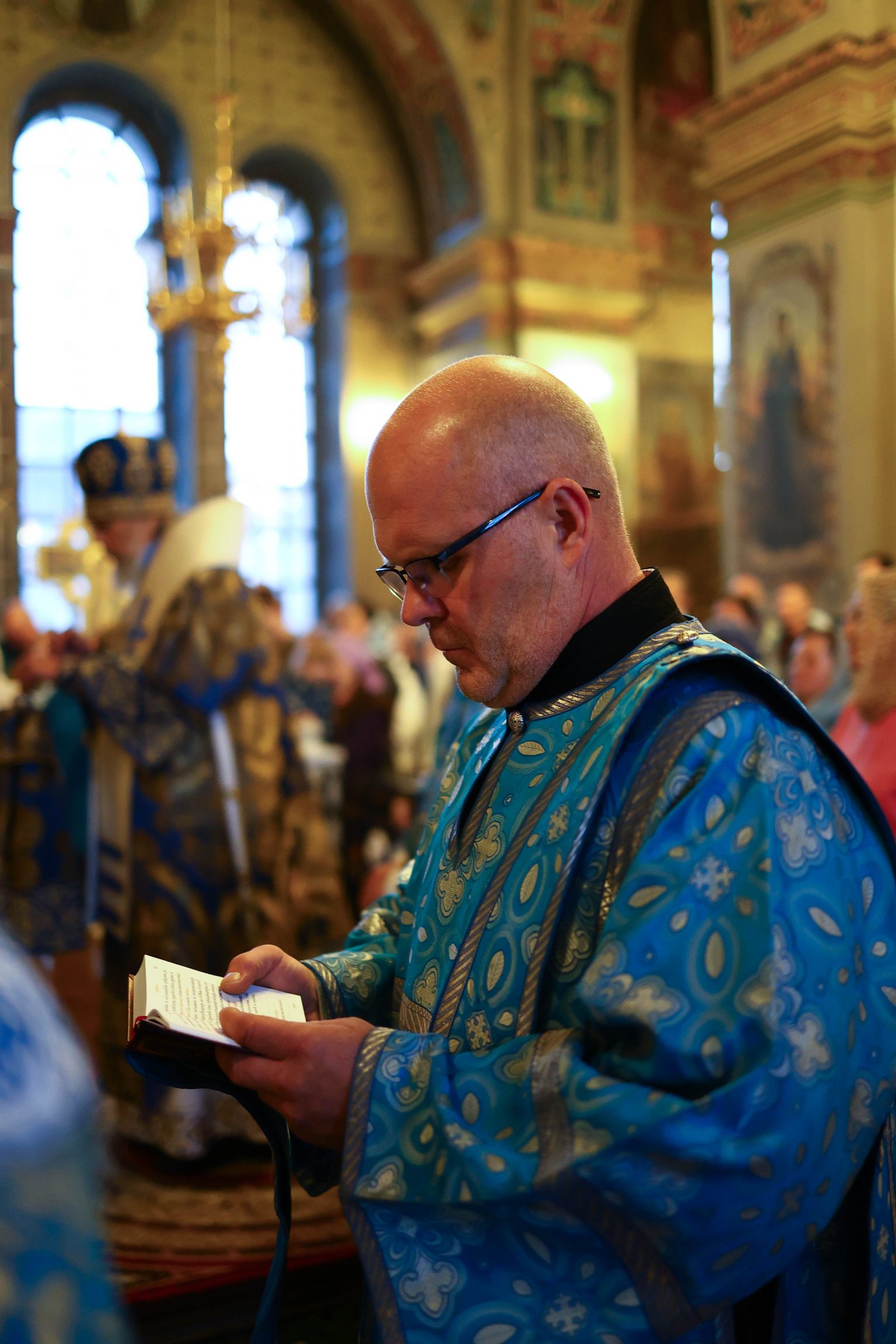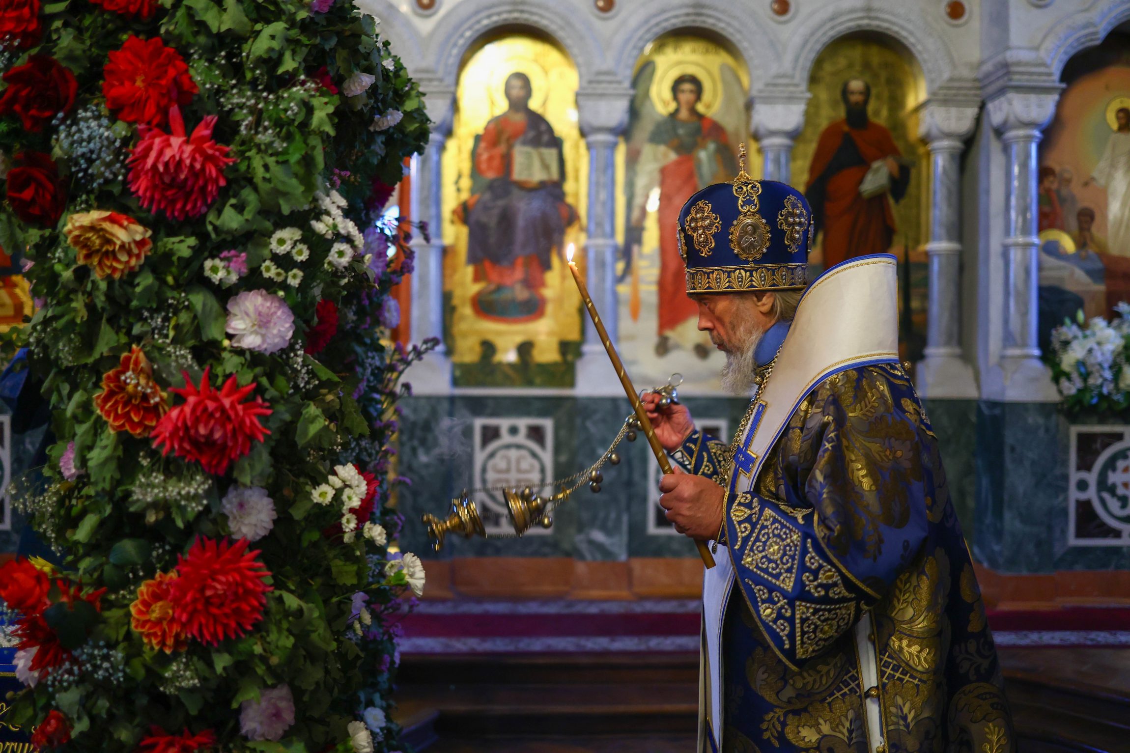 По окончании богослужения владыка словом мира и любви о Христе приветствовал предстоящих: «В сей нареченный и святой вечер Богородничной пасхи милостью Божией сердца наши вновь исполнены особой признательности, искренней детской благодарности и ответной любви к тому дару, который стяжала Преблагословенная Владычица наша Богородица, Царица Небесная и Матерь Жизни нашей, когда восприняла в Себя не только всю полноту Божественных нетварных даров благодати Святой Живоначальной Троицы как Свое собственное достояние, но единственным и неповторимым образом взаимодействия с Богом, во Святой Троице славимом и поклоняемом, явилась живым нерукотворенным храмом и жилищем для Единородного Божьего Сына, непосредственным участием в осуществлении Божественного домостроительства искупительного воплощения и вочеловечения Бога Слова, существенно став Приснодевой-Богородицей.