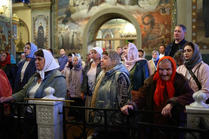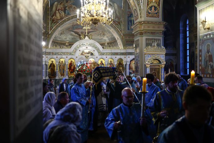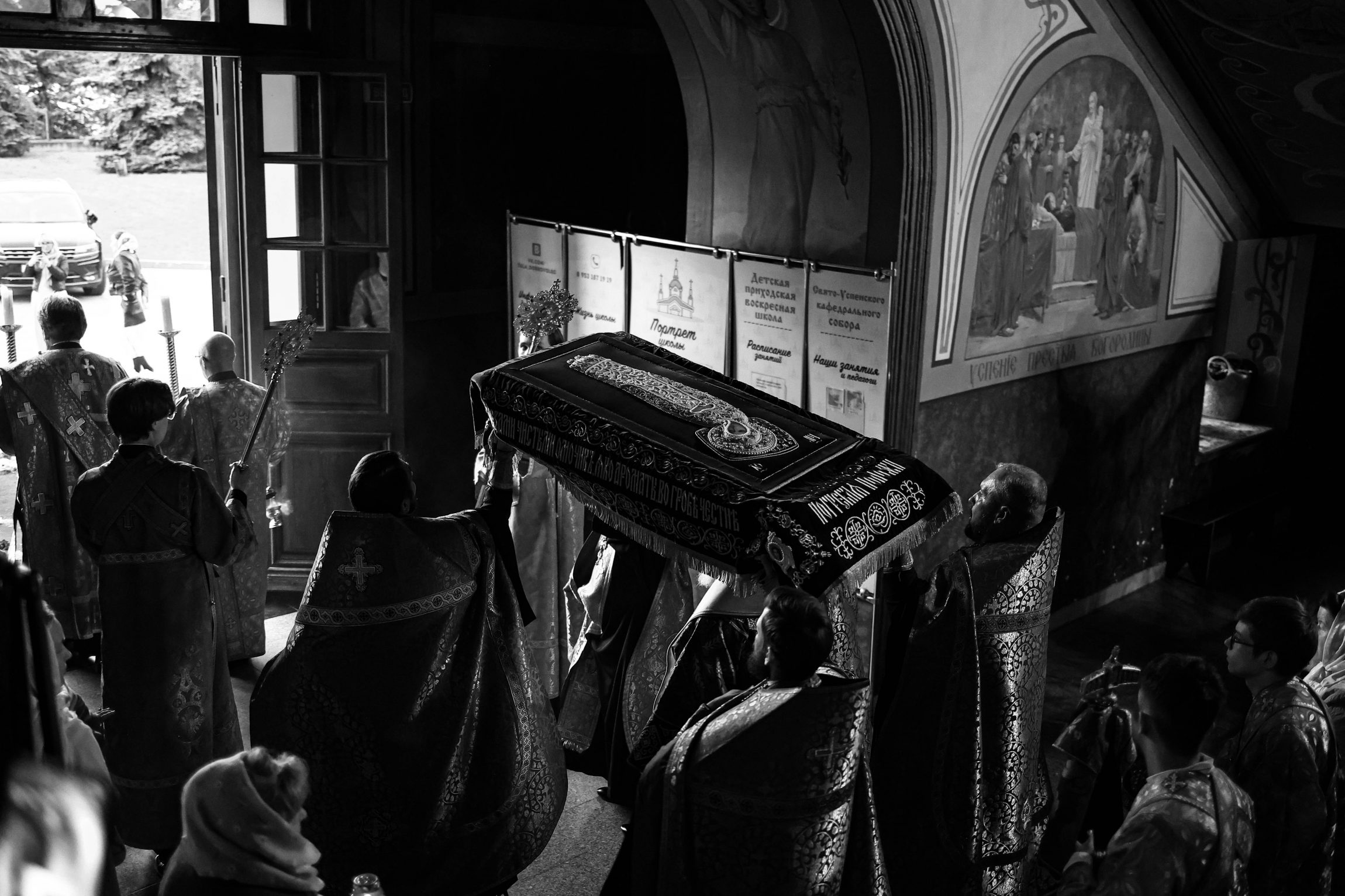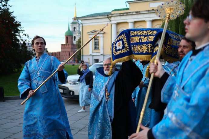 Митрополит Тульский и Ефремовский Алексий совершил утреню с чином погребения и обнесением Святой Плащаницы Богоматери крестным ходом с пением высокой трисвятой песни в Успенском кафедральном соборе города Тулы в сослужении соборного духовенства.