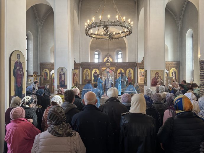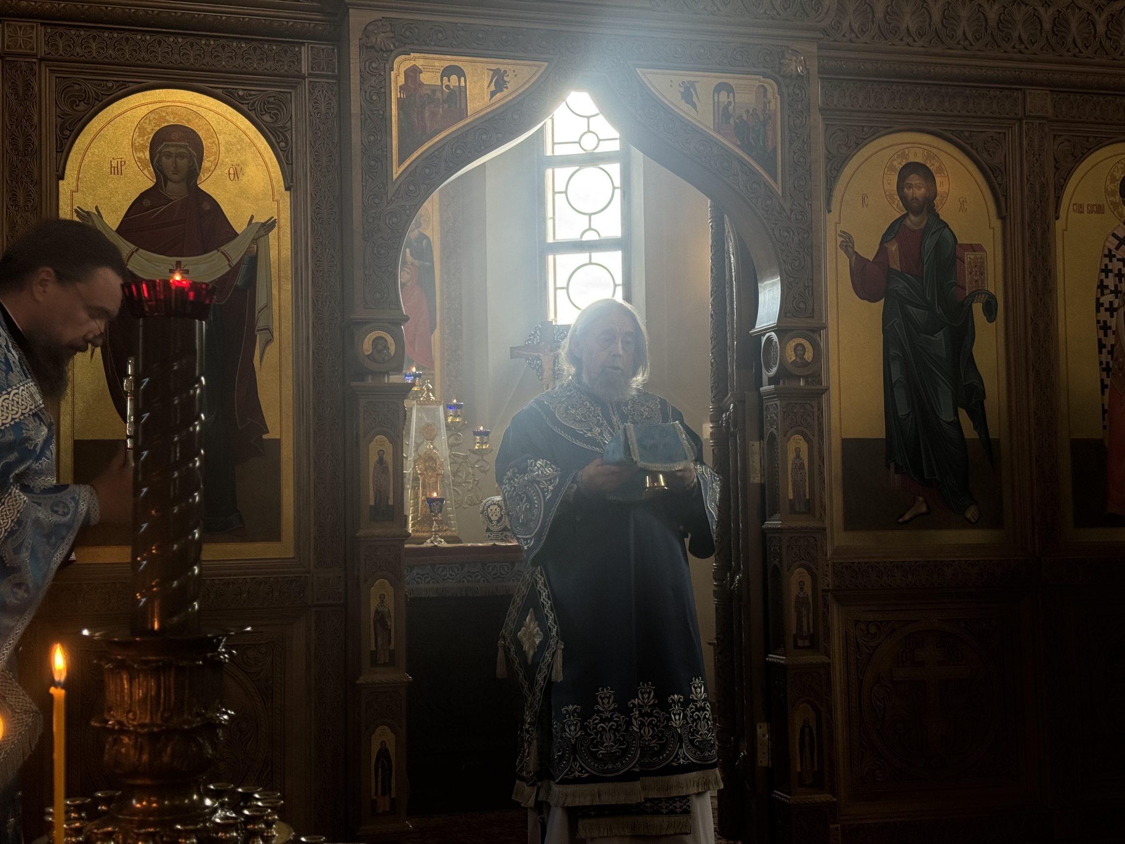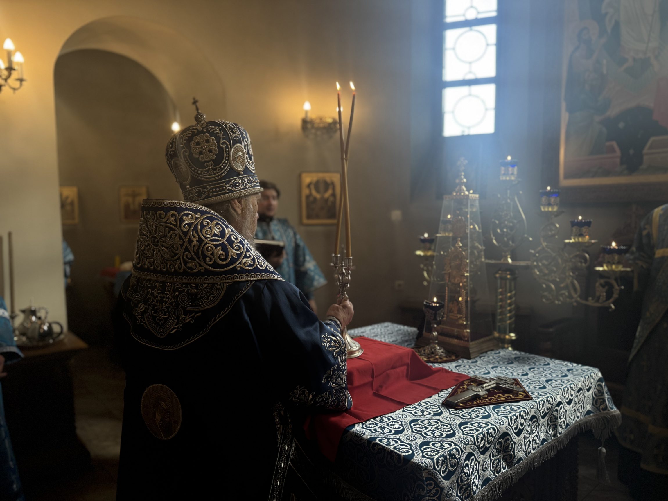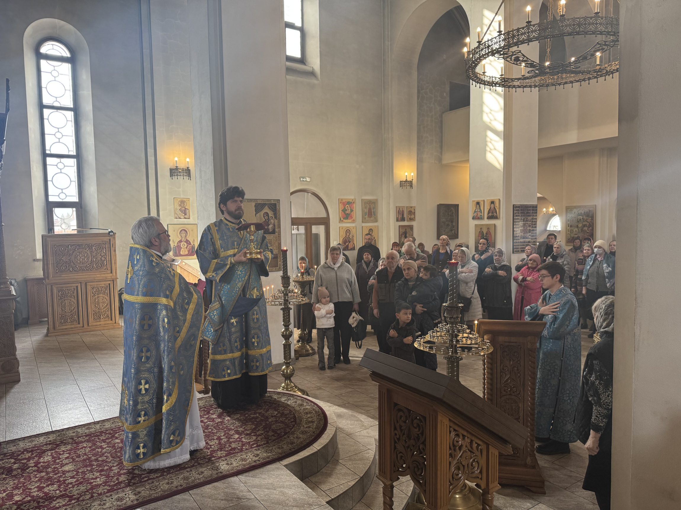 На сугубой ектении вознесены молитвы о благопоспешении христолюбивому Российскому воинству в установлении мира в сию лихую годину, на Святую Русь нашедшую, о мире на Украине, а также о сохранении единства святого Православия.