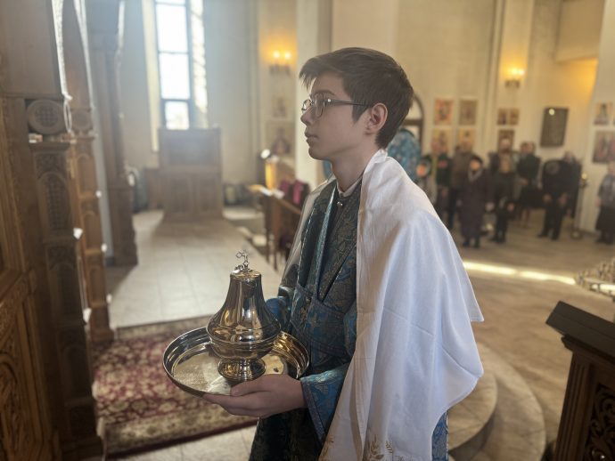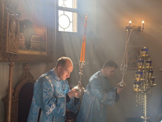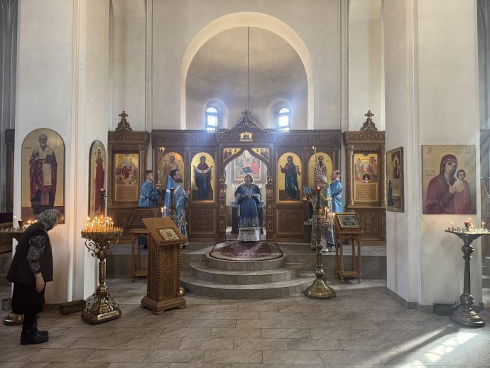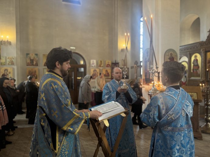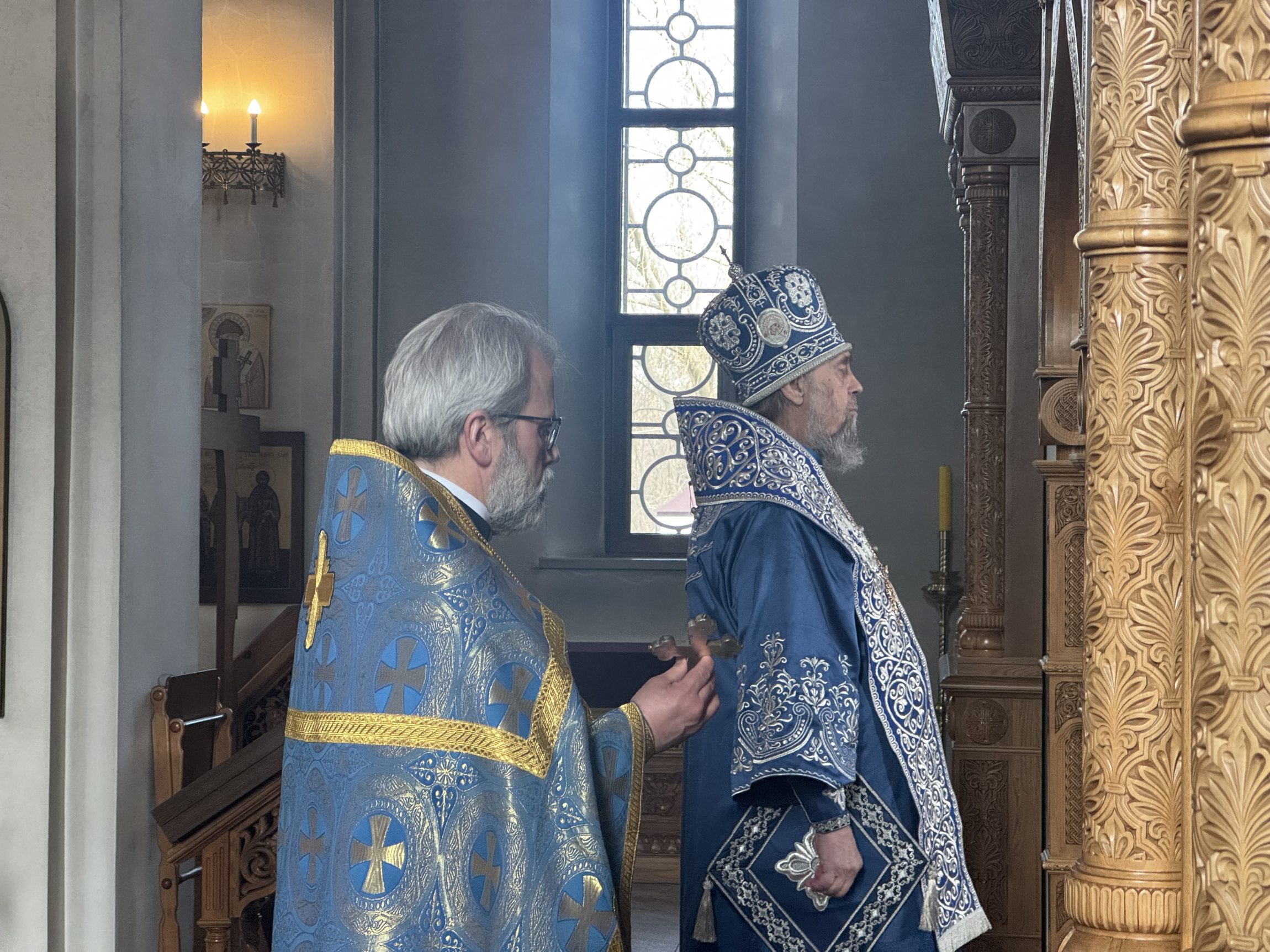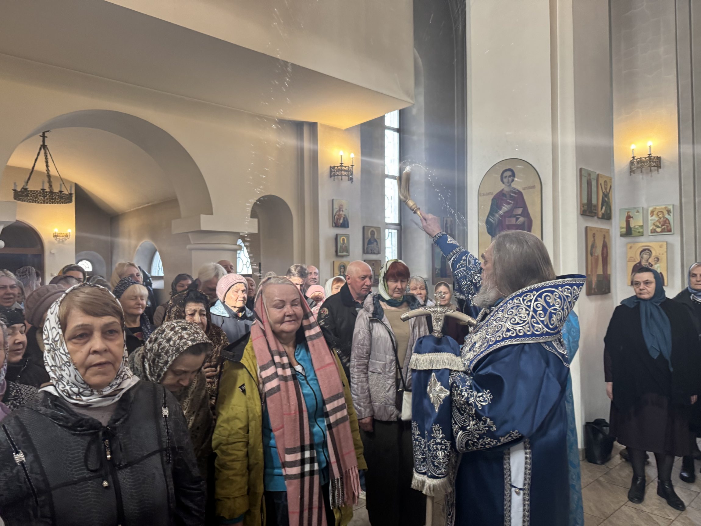 На сугубой ектении вознесены молитвы о благопоспешении христолюбивому Российскому воинству в установлении мира в сию лихую годину, на Святую Русь нашедшую, о мире на Украине, а также о сохранении единства святого Православия.