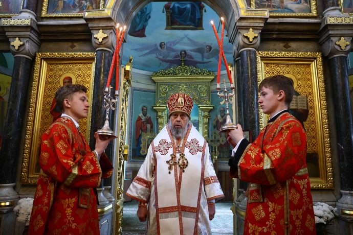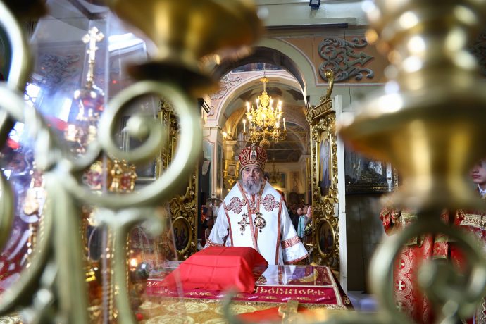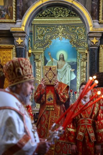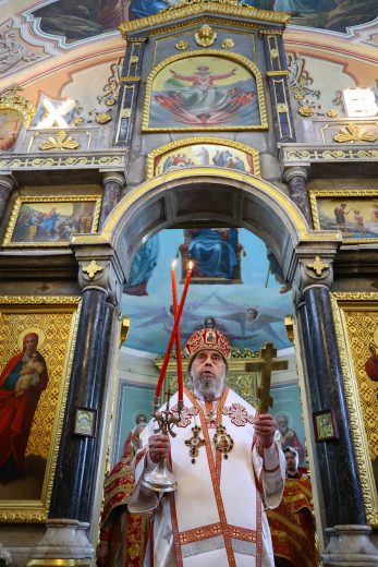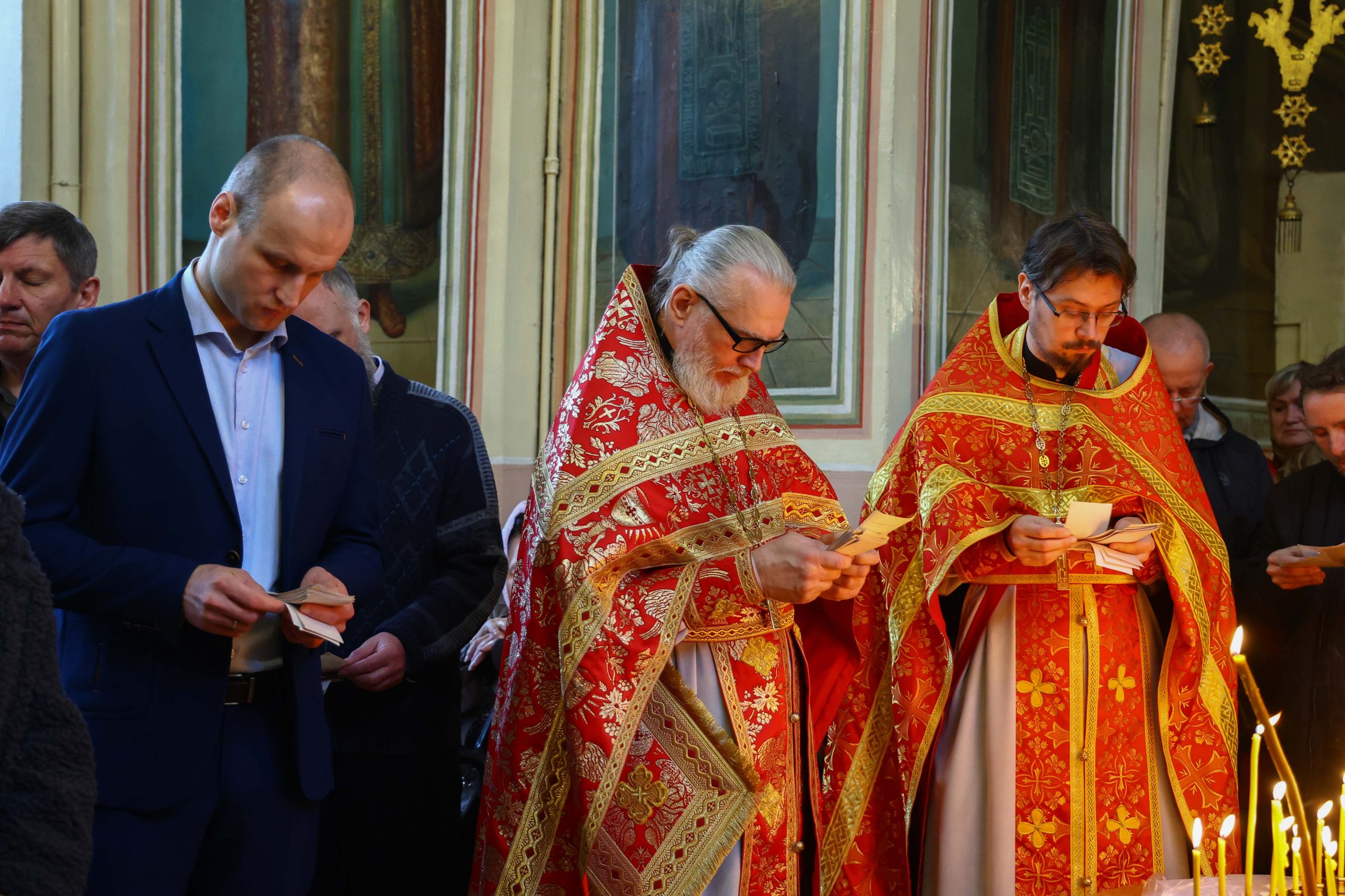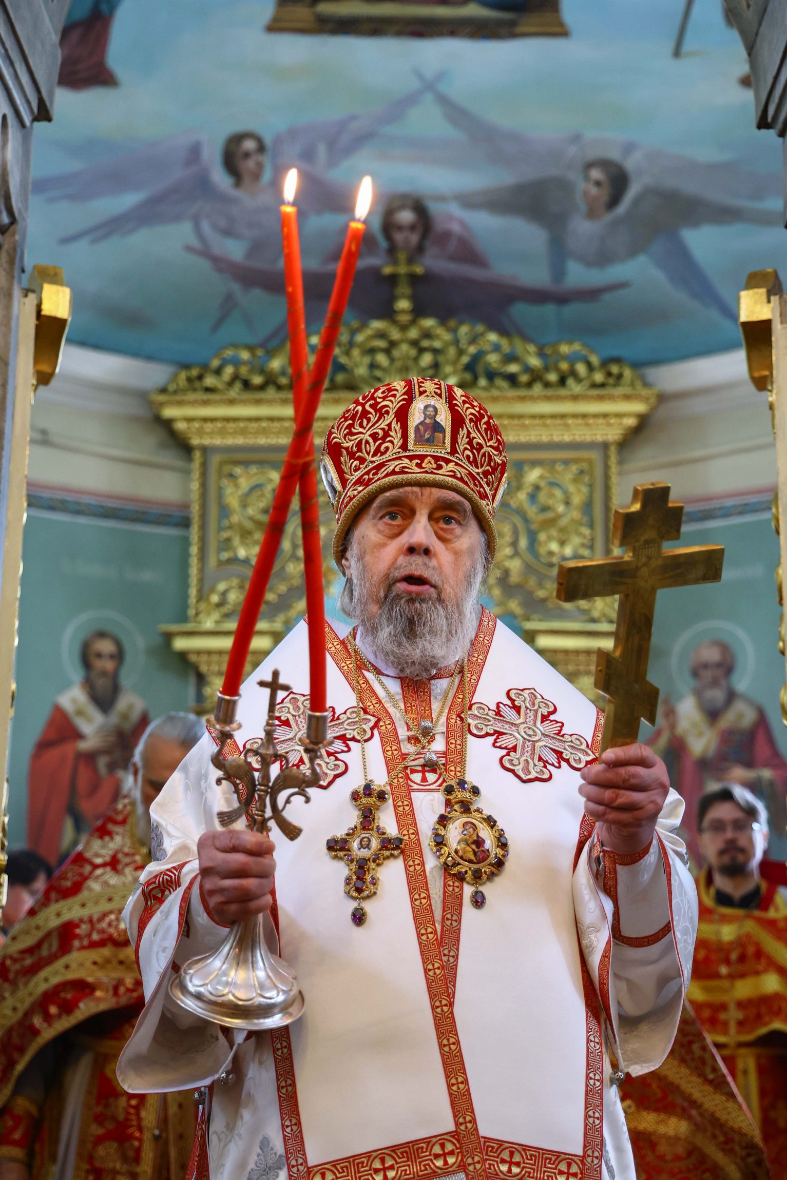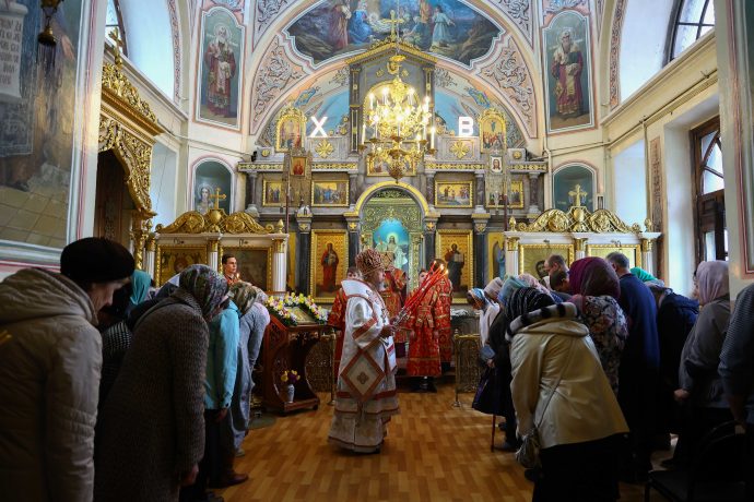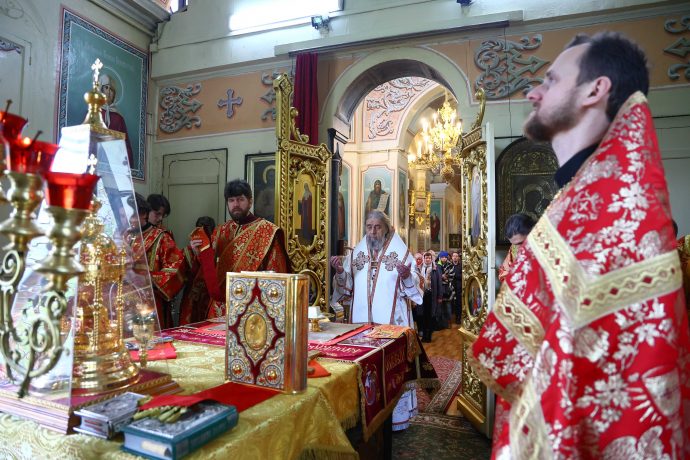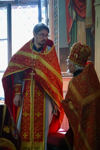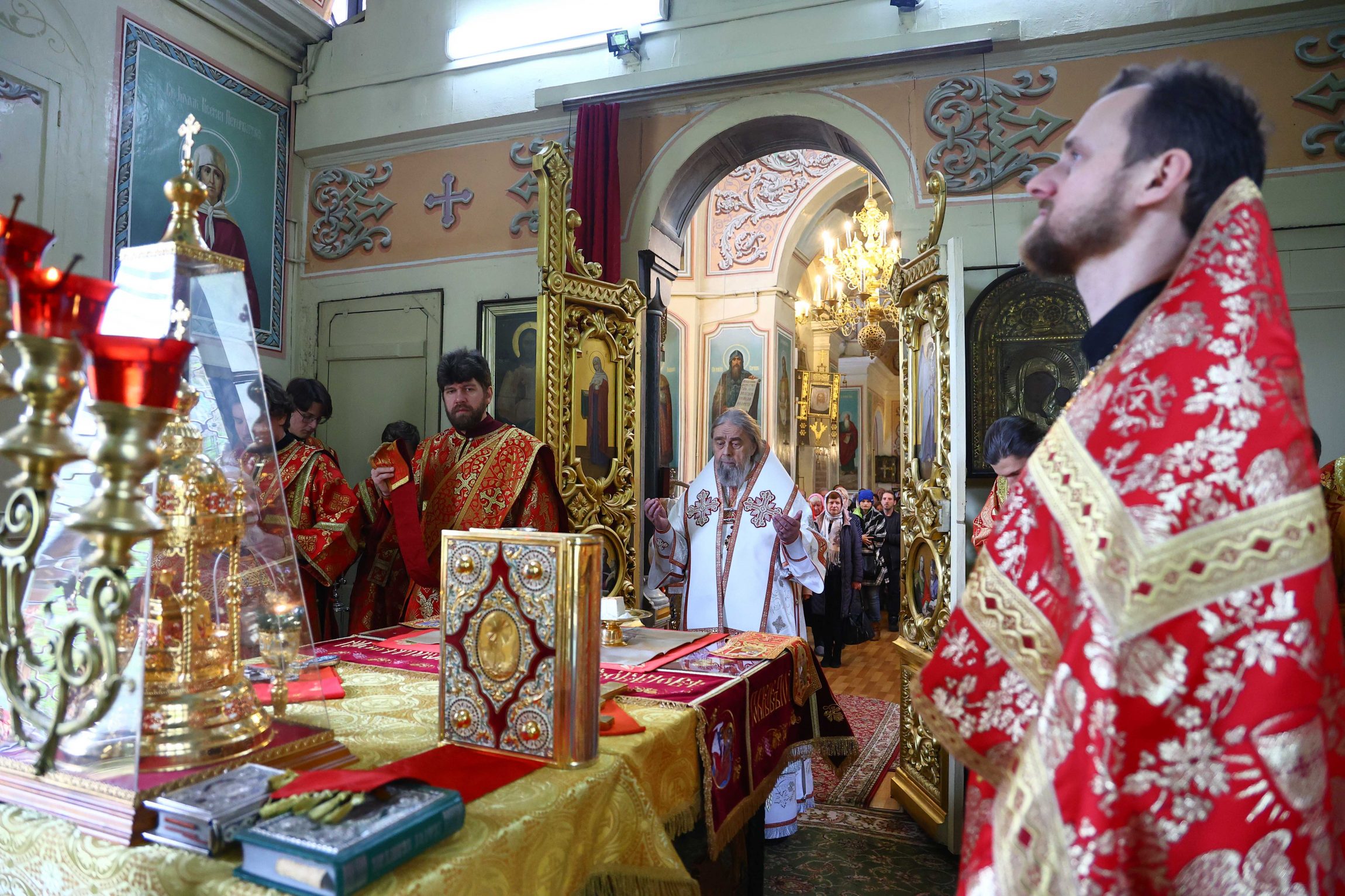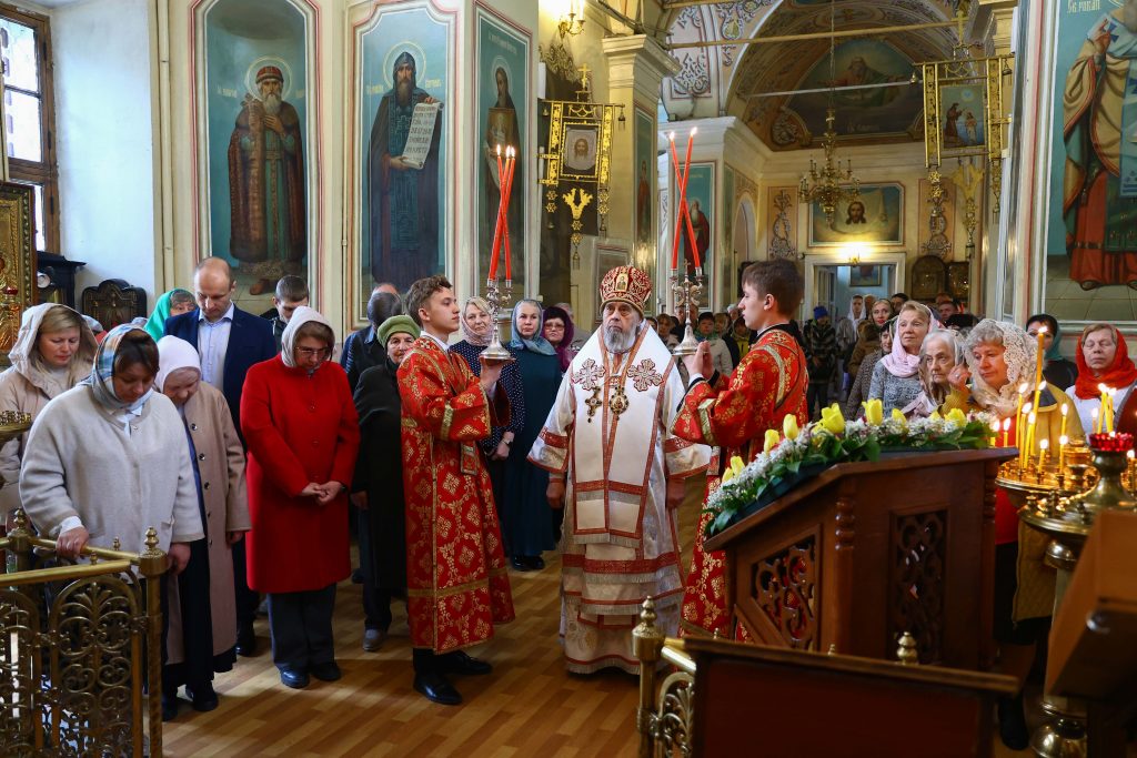 На сугубой ектении вознесены молитвы о благопоспешении христолюбивому Российскому воинству в установлении мира в сию лихую годину, на Святую Русь нашедшую, о мире на Украине, а также о сохранении единства святого Православия.
