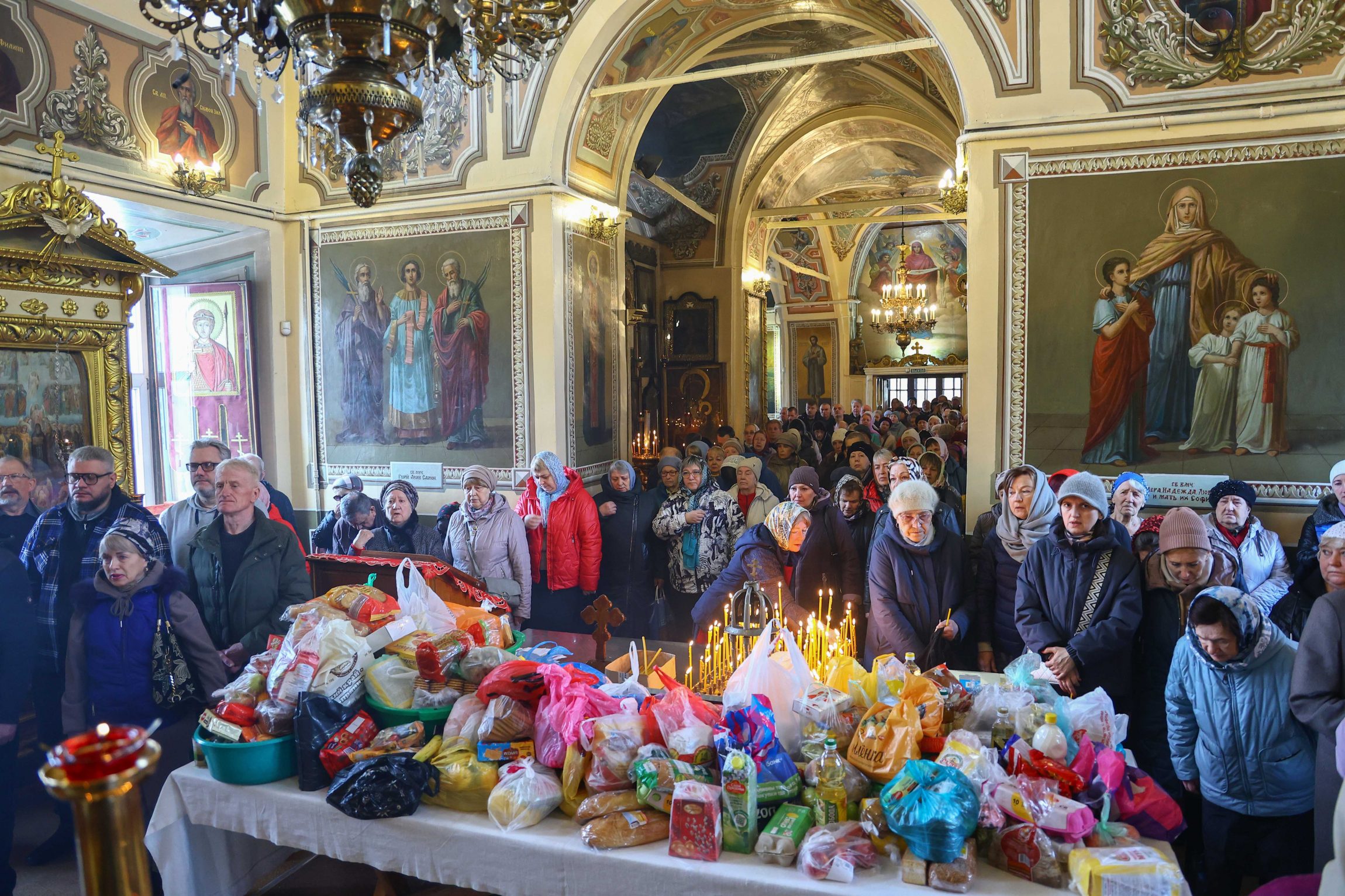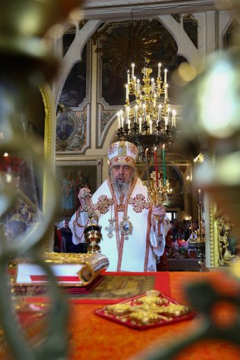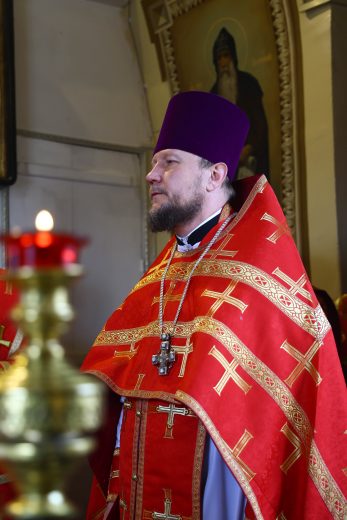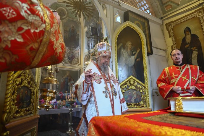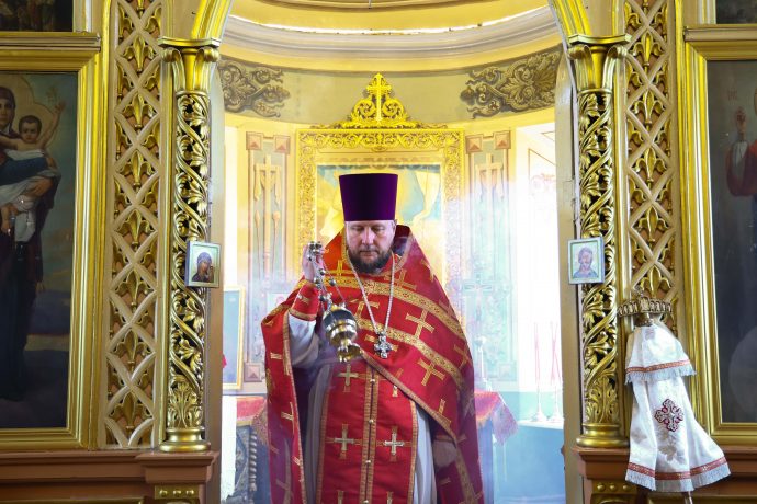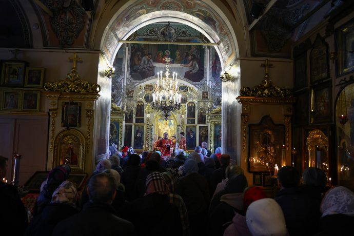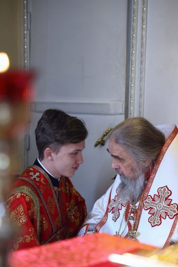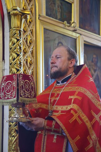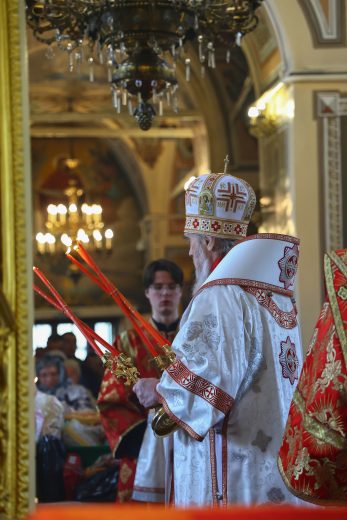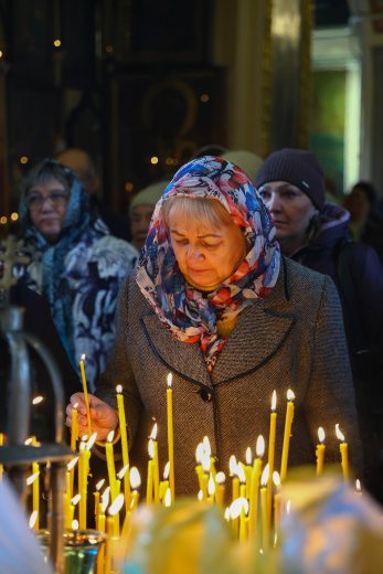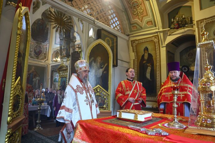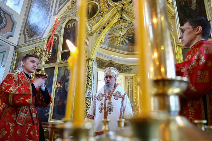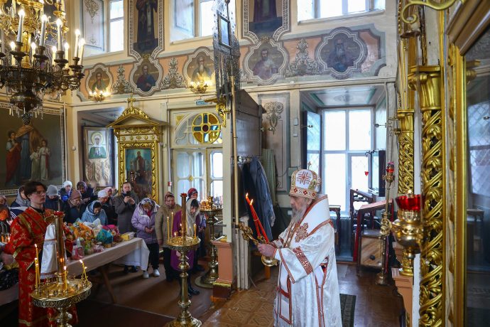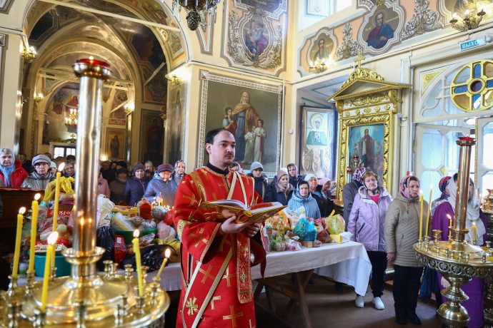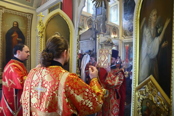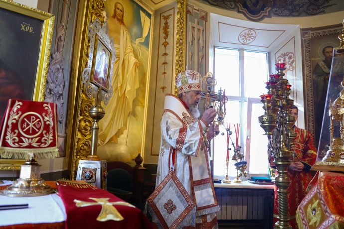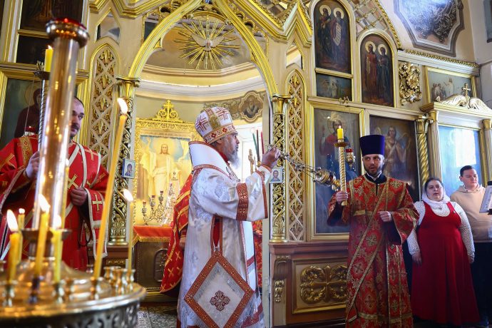 На сугубой ектении вознесены молитвы о благопоспешении христолюбивому Российскому воинству в установлении мира в сию лихую годину, на Святую Русь нашедшую, о мире на Украине, а также о сохранении единства святого Православия.