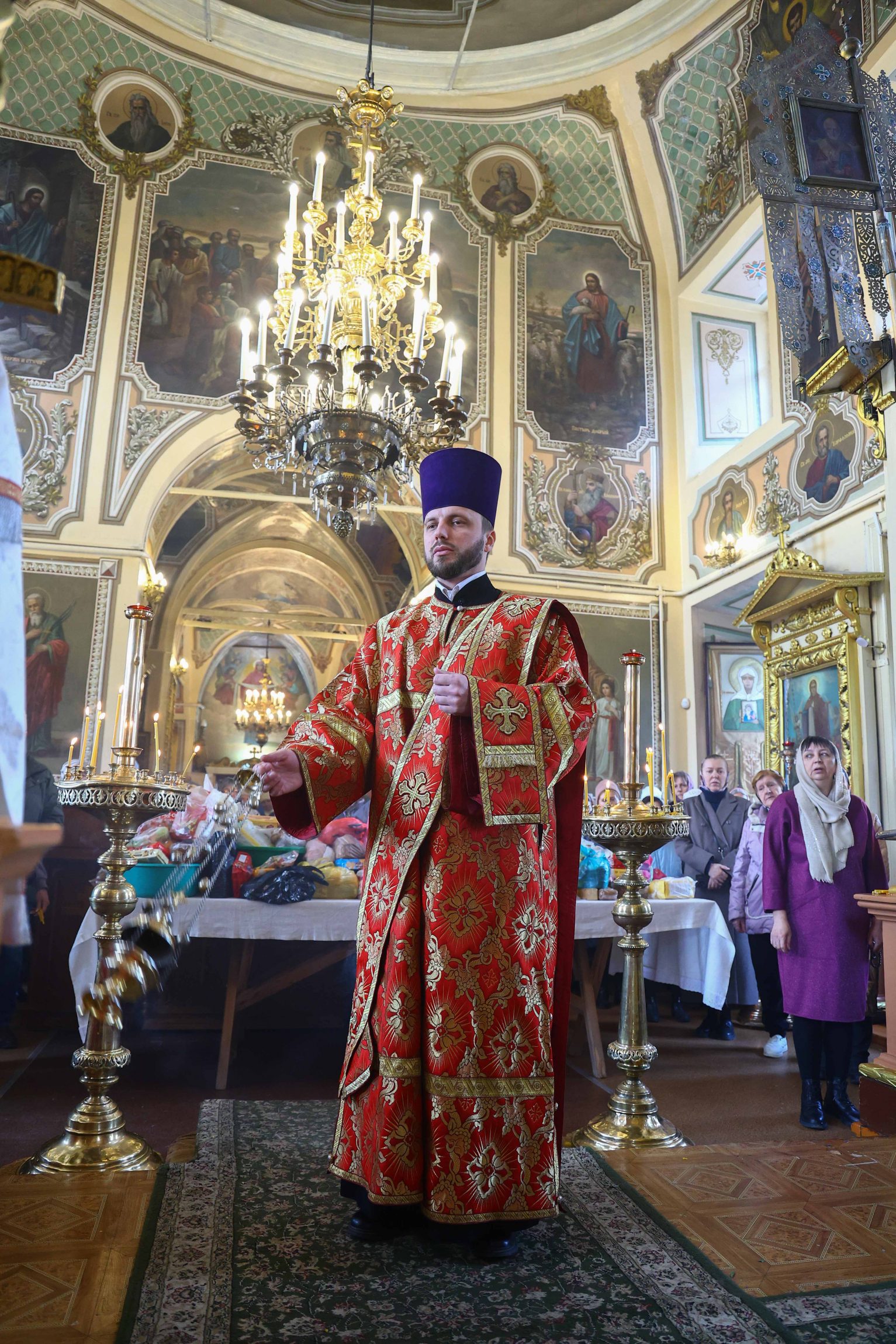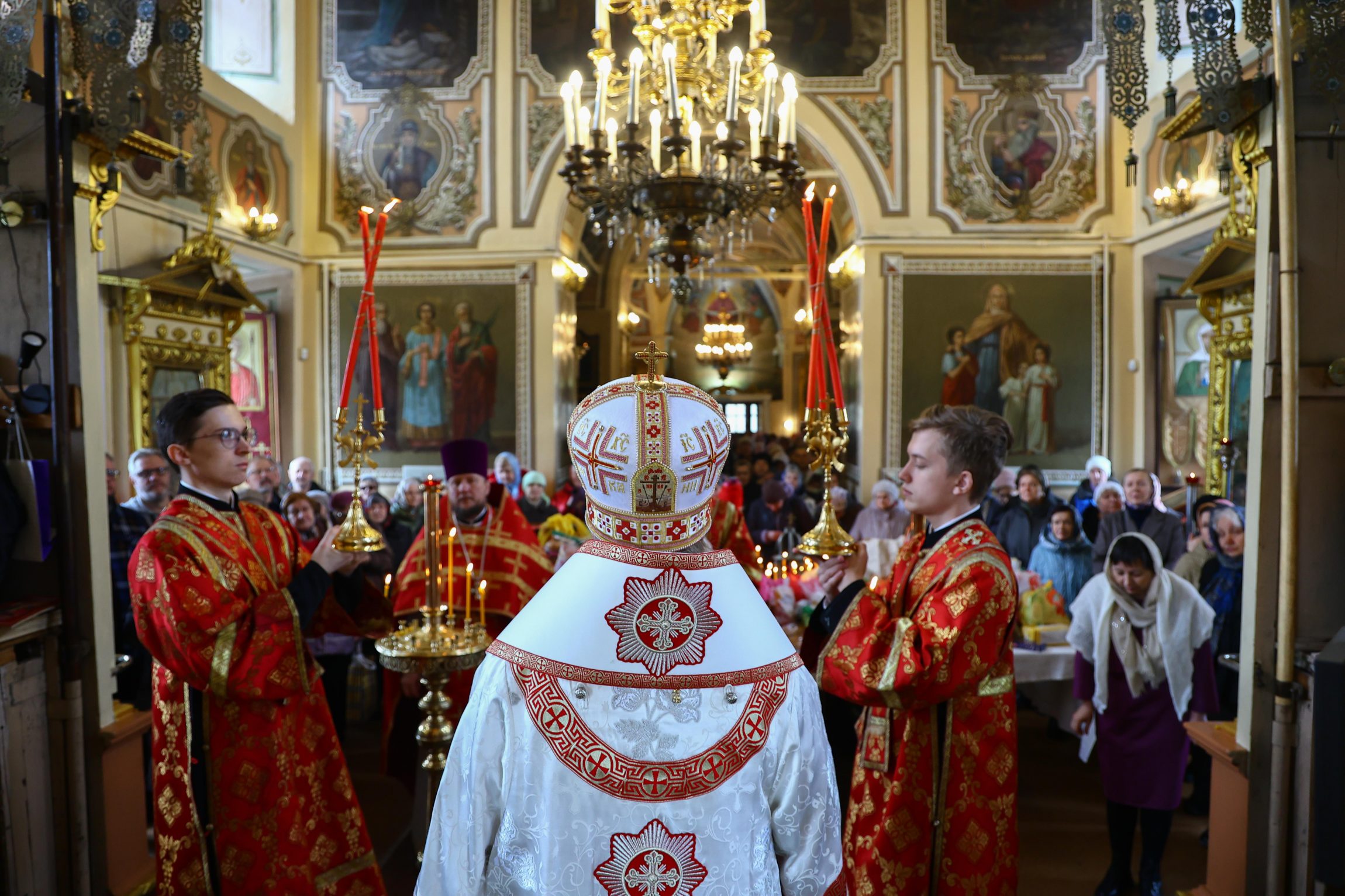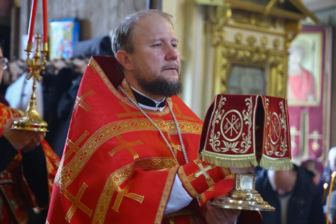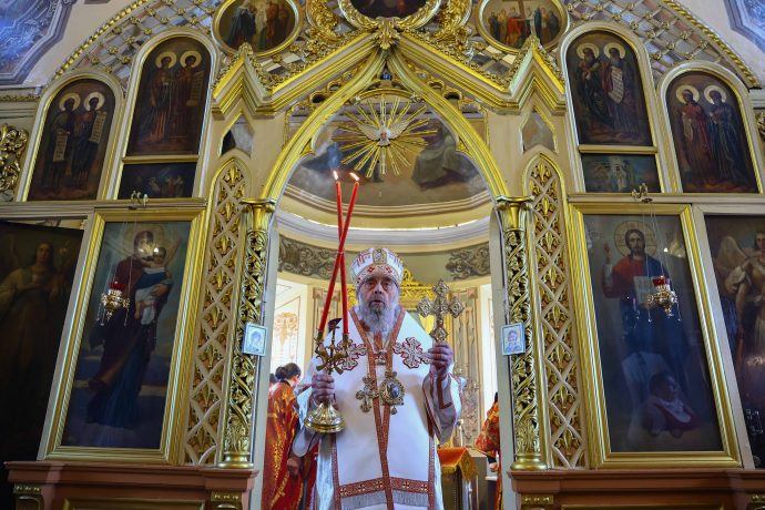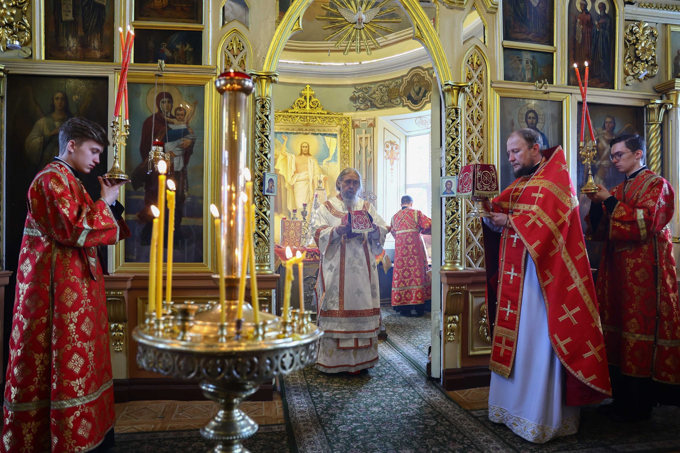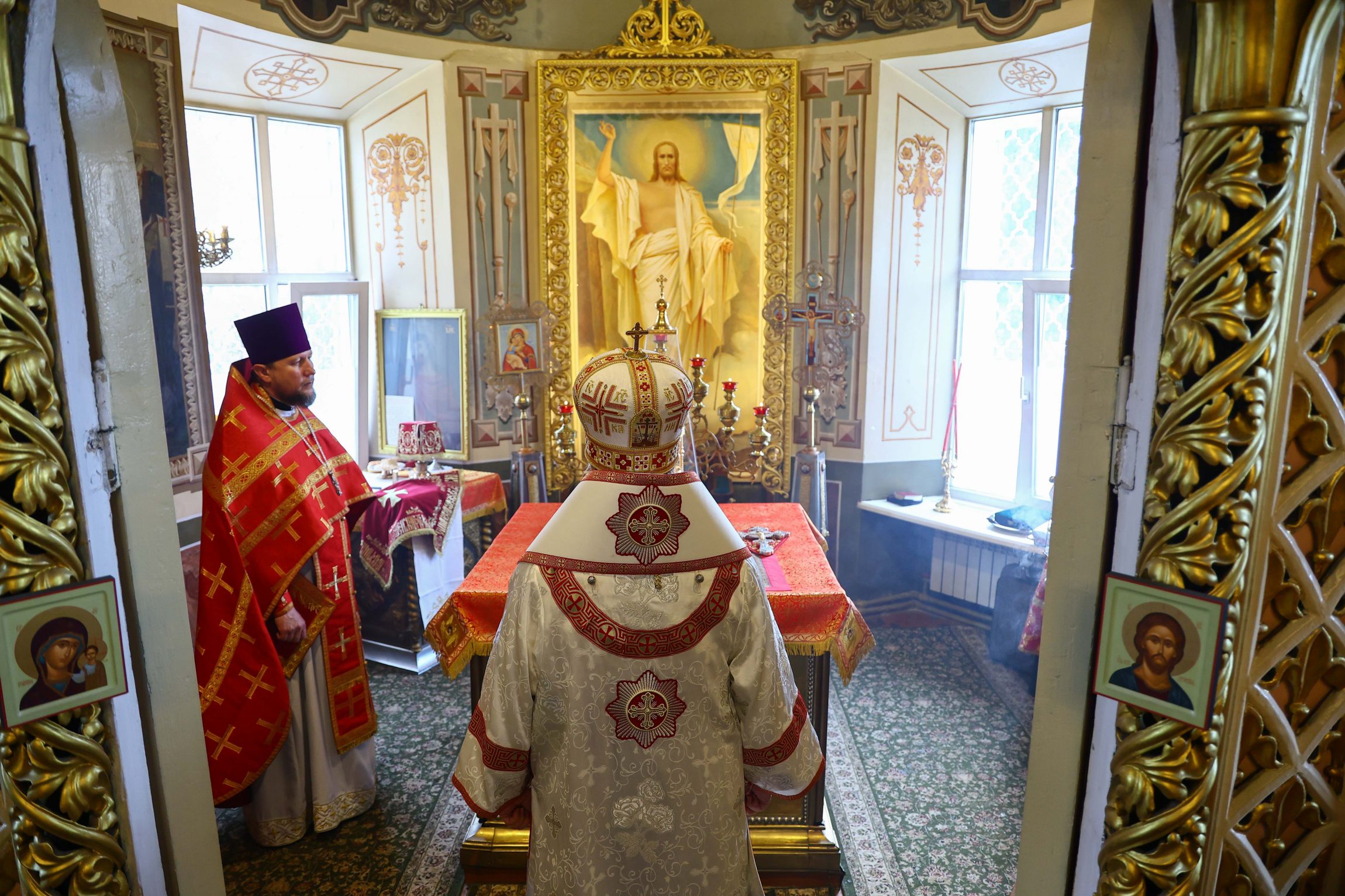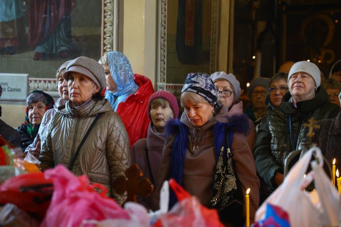 На сугубой ектении вознесены молитвы о благопоспешении христолюбивому Российскому воинству в установлении мира в сию лихую годину, на Святую Русь нашедшую, о мире на Украине, а также о сохранении единства святого Православия.