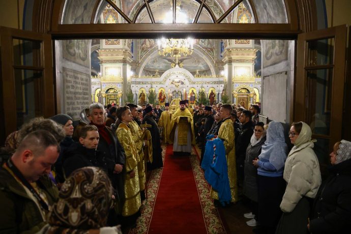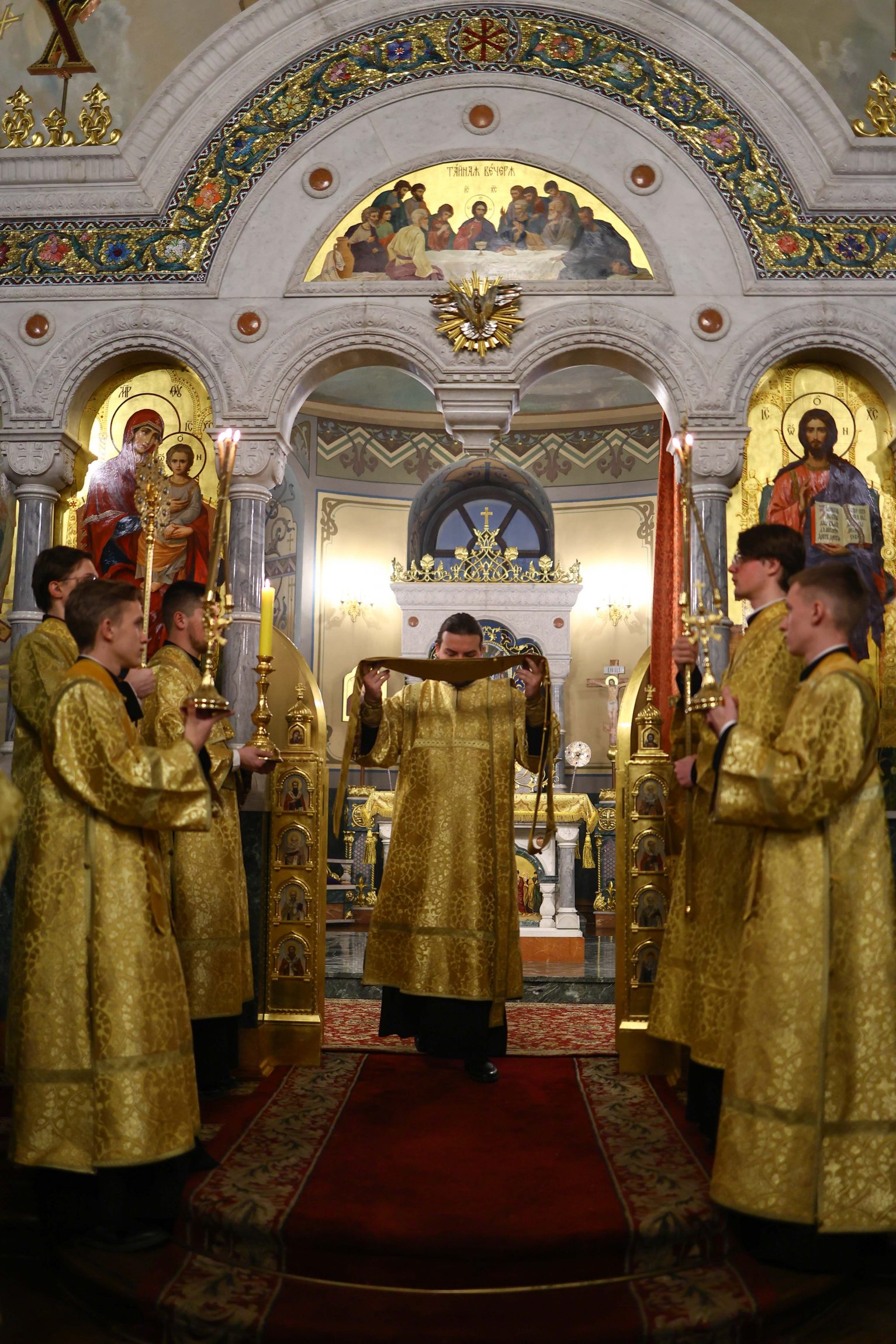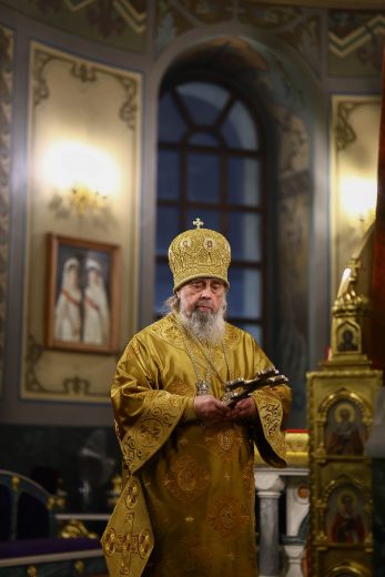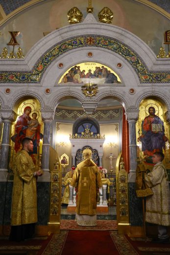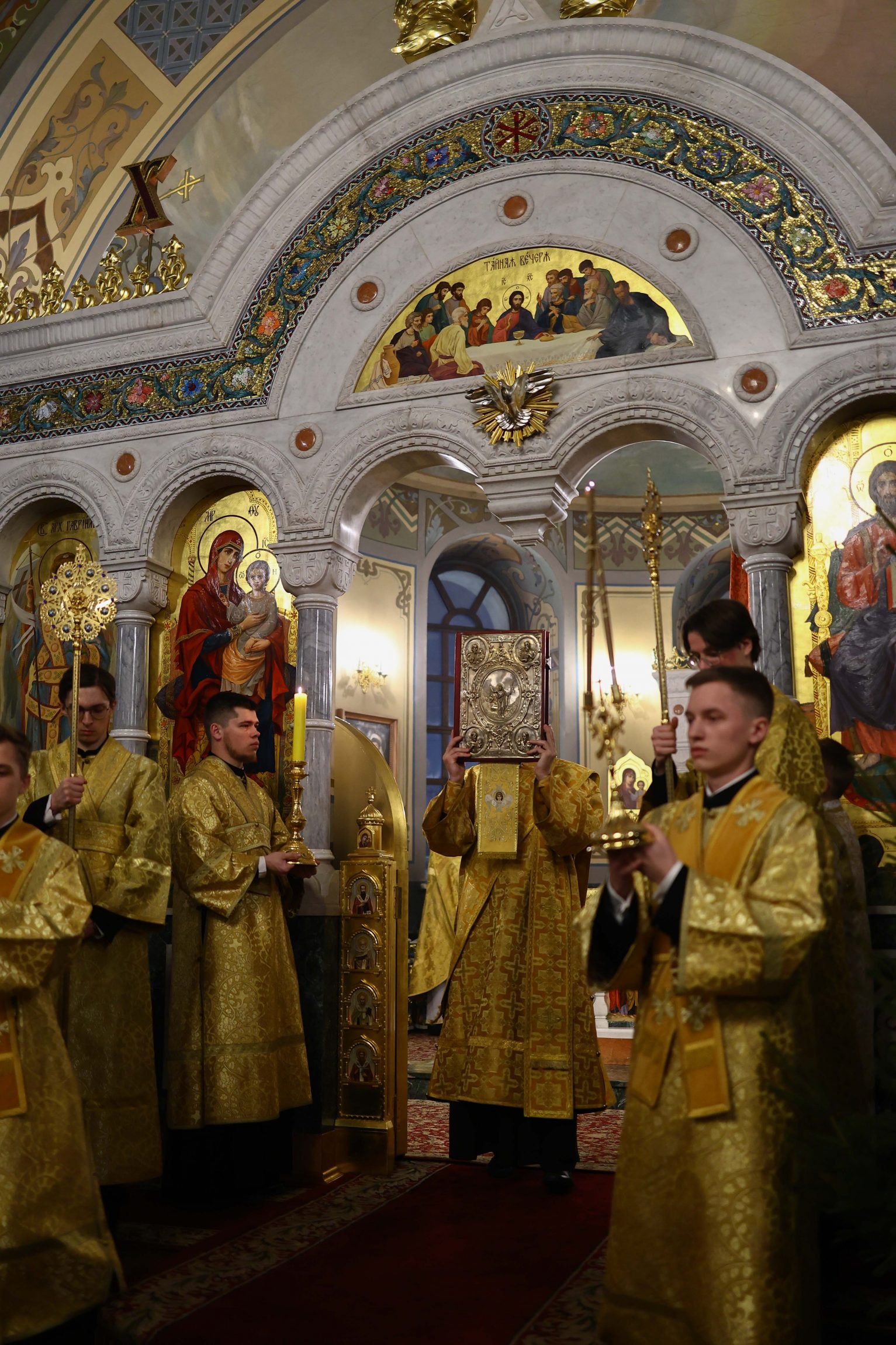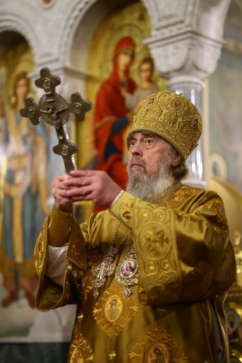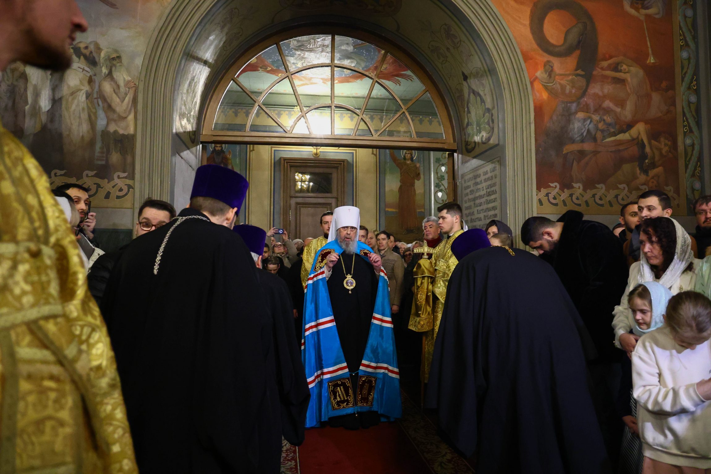 На сугубой ектении вознесены молитвы о благопоспешении христолюбивому Российскому воинству в установлении мира в сию лихую годину, на Святую Русь нашедшую, о мире на Украине, а также о сохранении единства святого Православия.