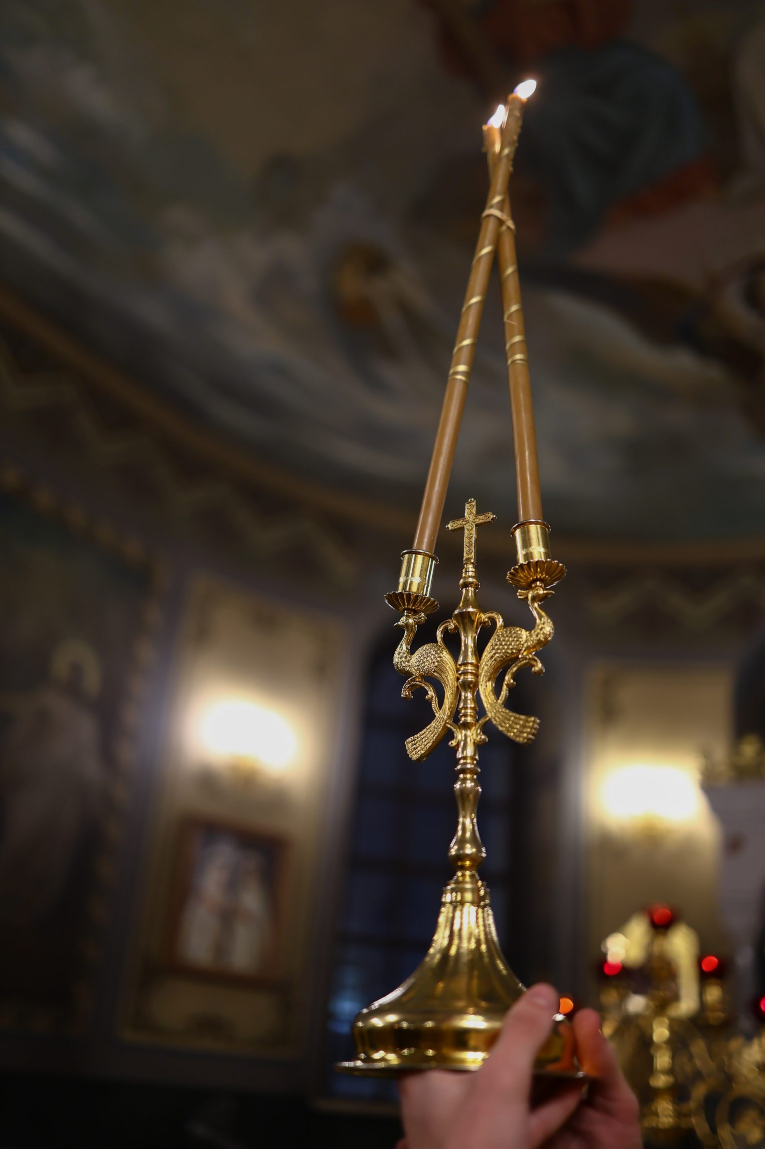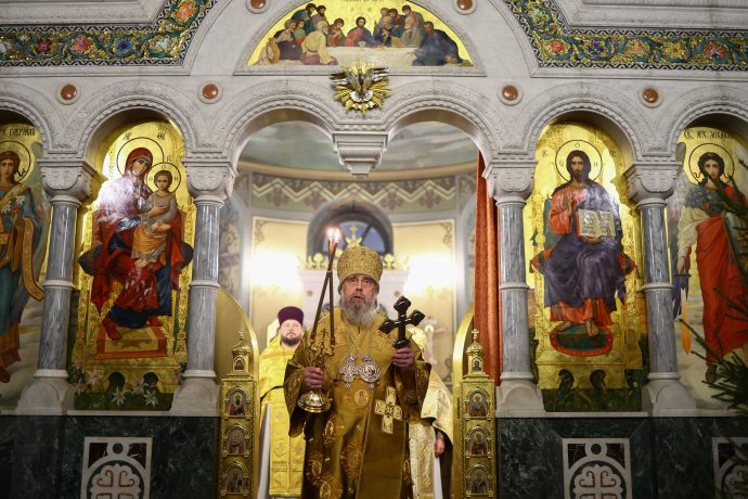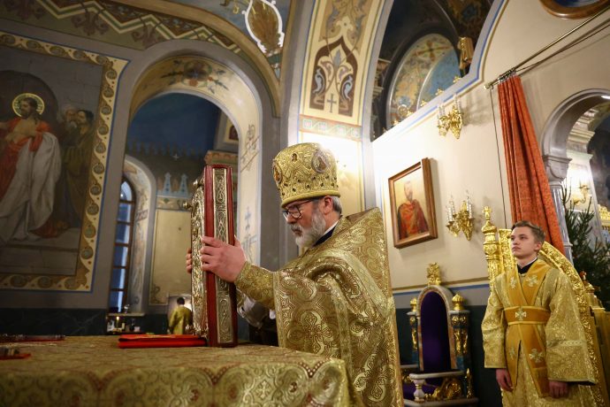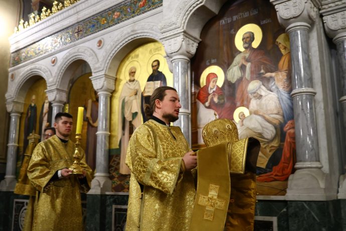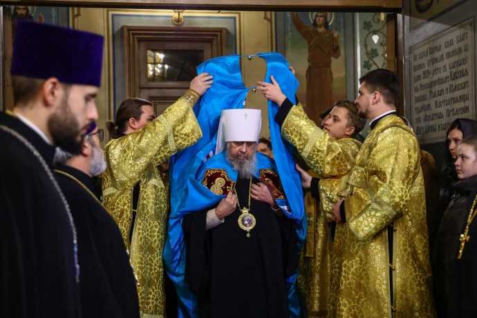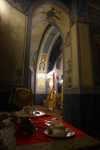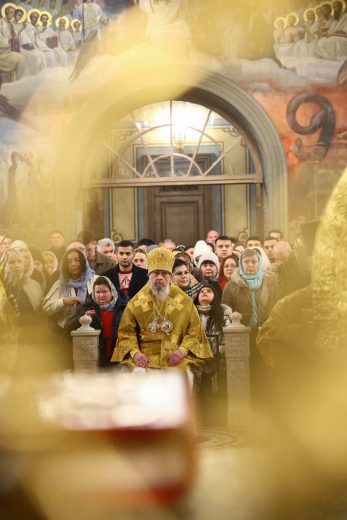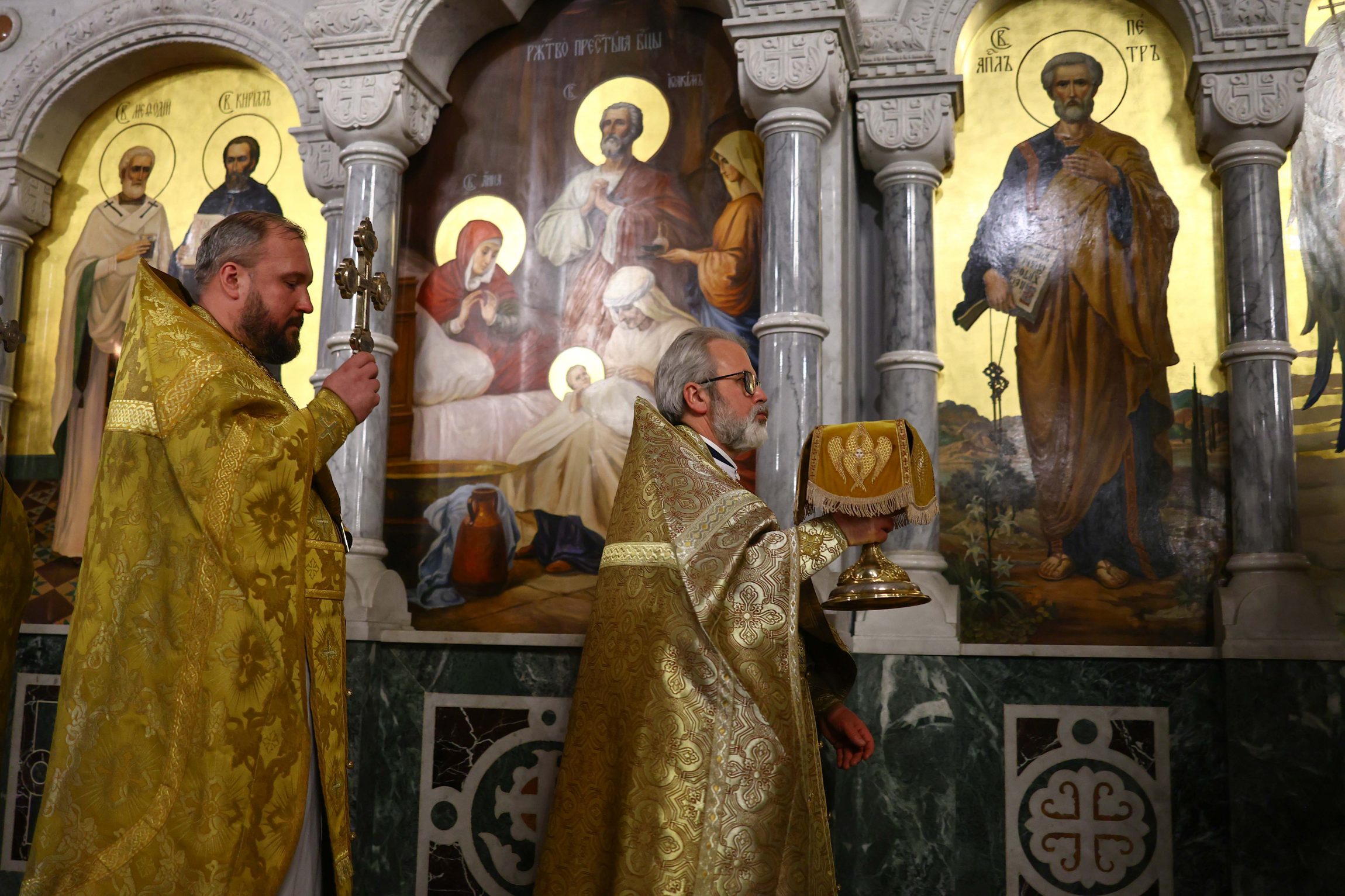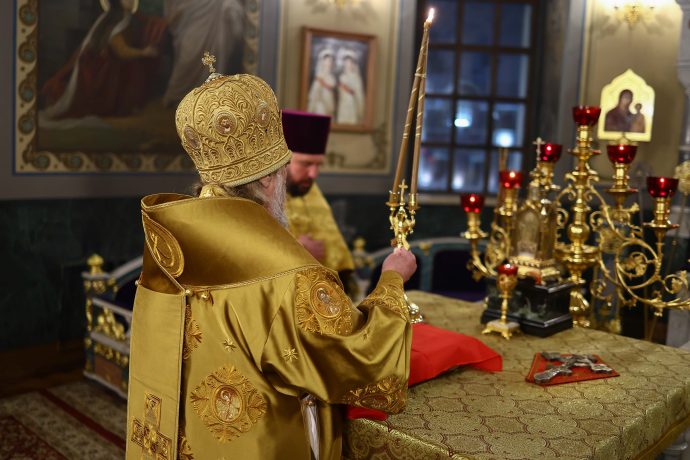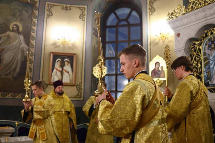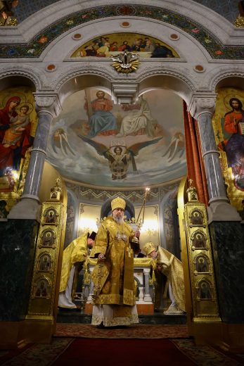 На сугубой ектении вознесены молитвы о благопоспешении христолюбивому Российскому воинству в установлении мира в сию лихую годину, на Святую Русь нашедшую, о мире на Украине, а также о сохранении единства святого Православия.