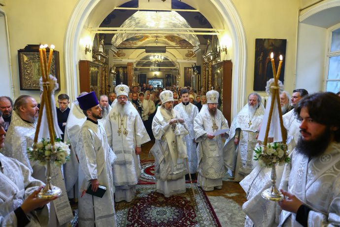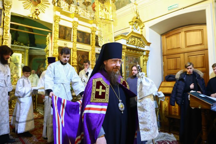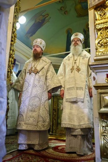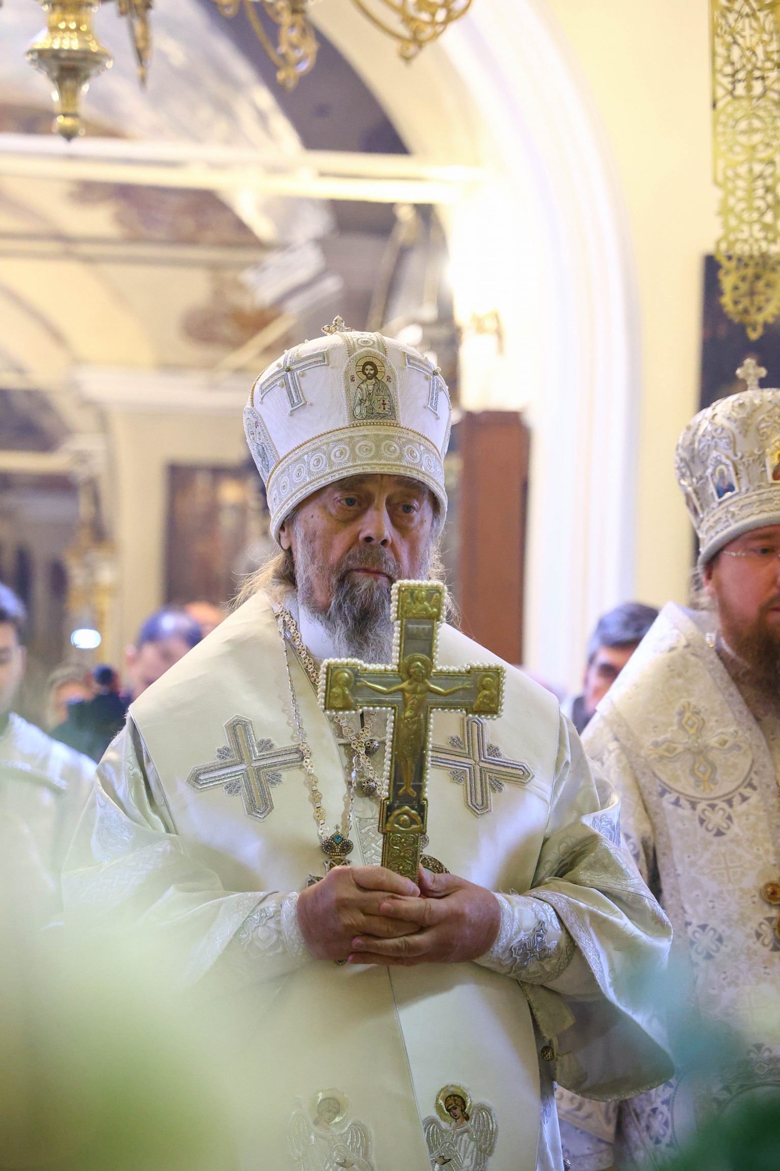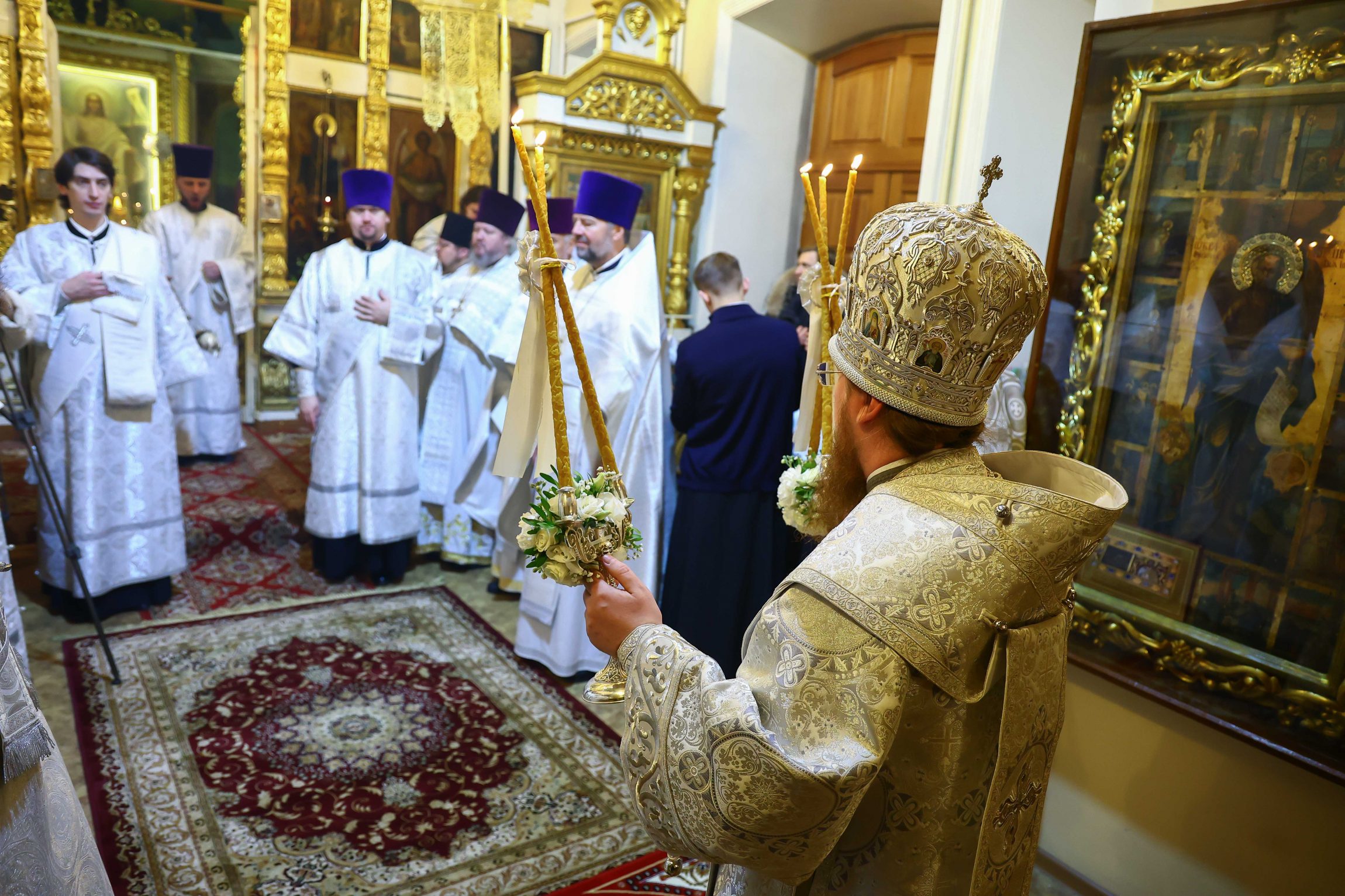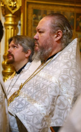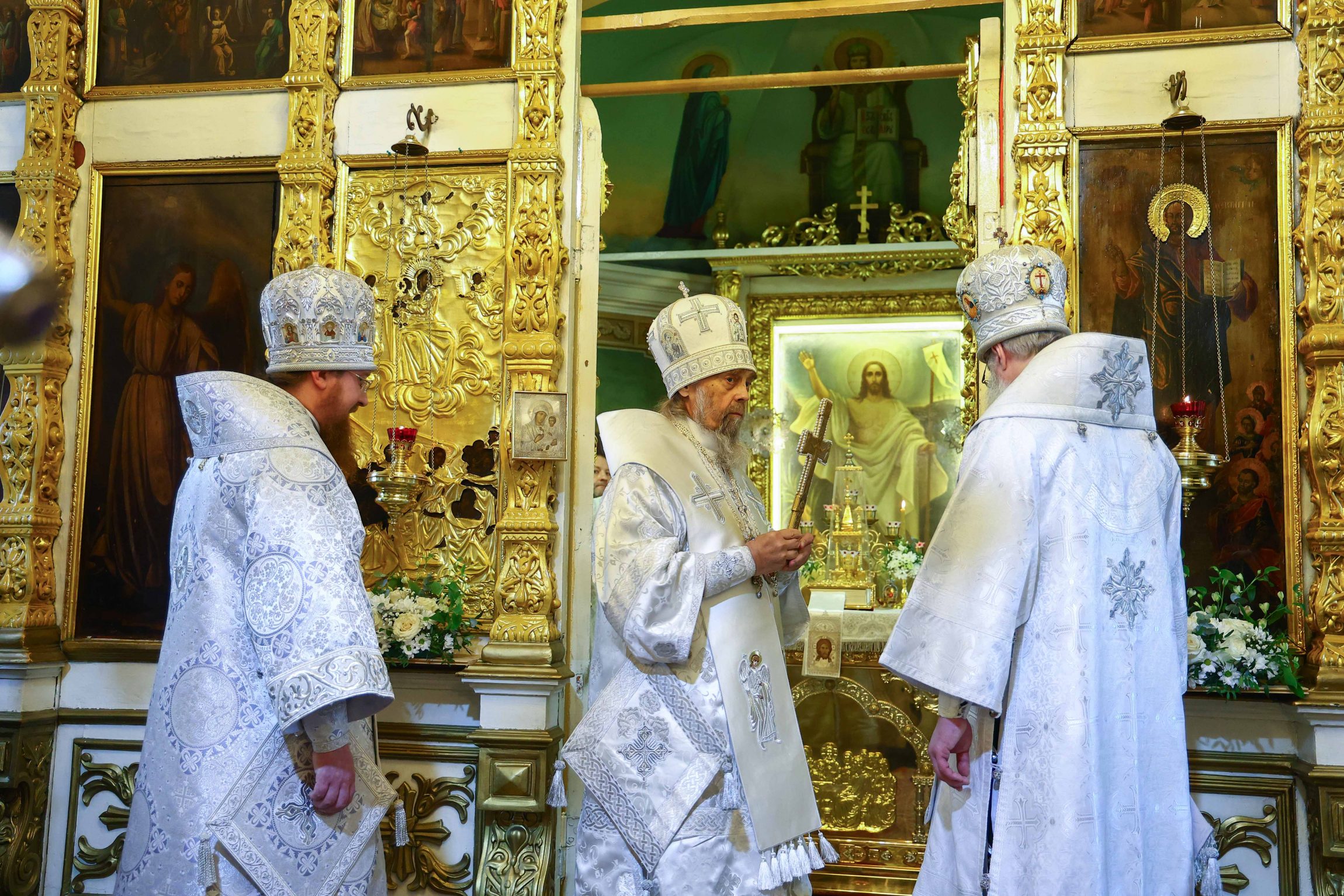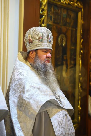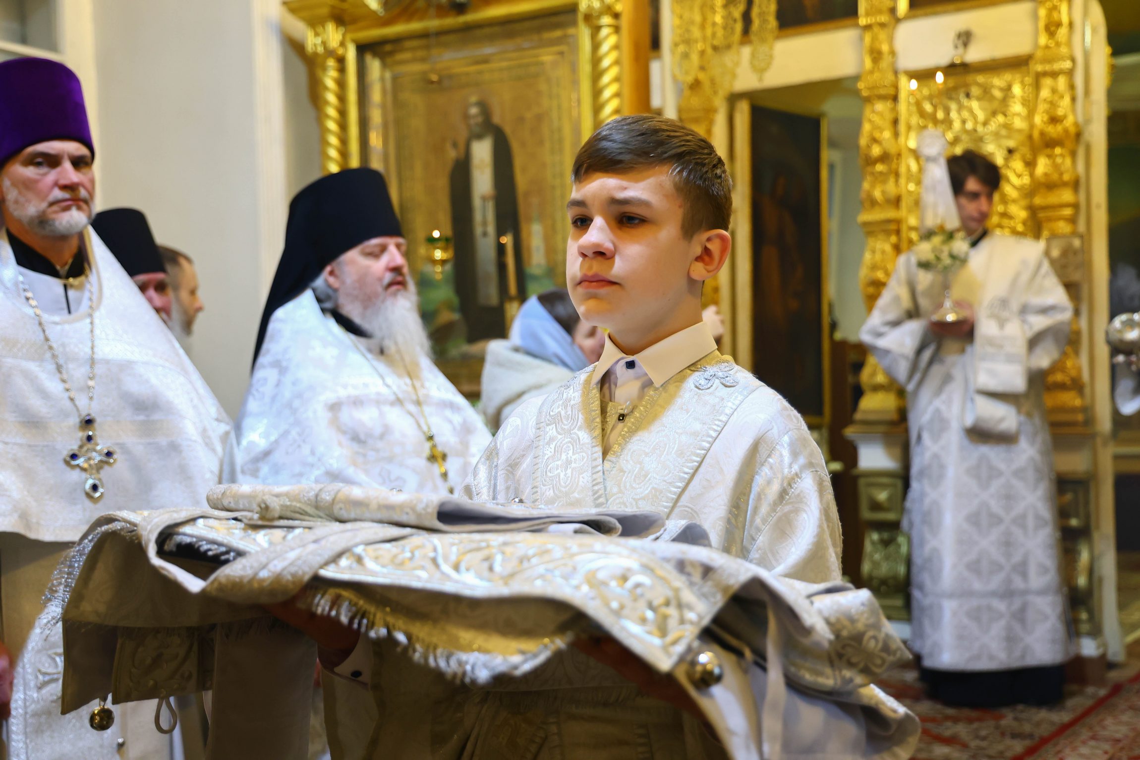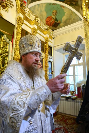 На сугубой ектении вознесены молитвы о благопоспешении христолюбивому Российскому воинству в установлении мира в сию лихую годину, на Святую Русь нашедшую, о мире на Украине, а также о сохранении единства святого Православия.
