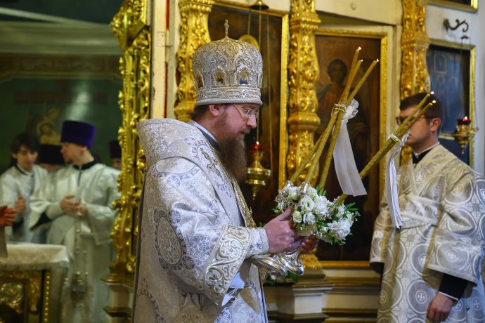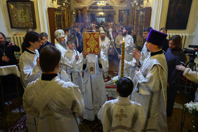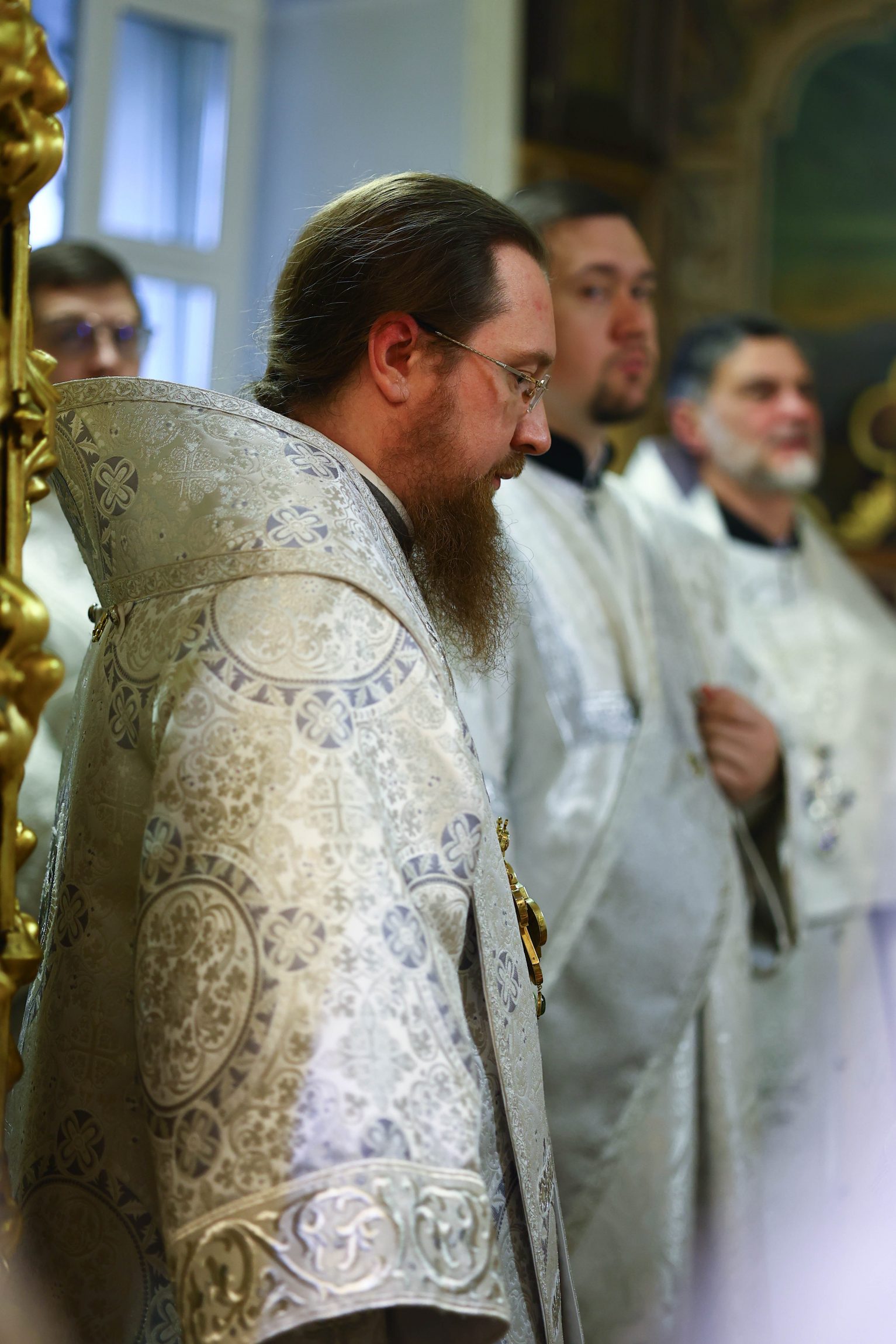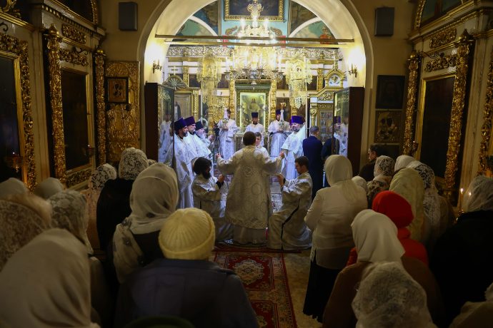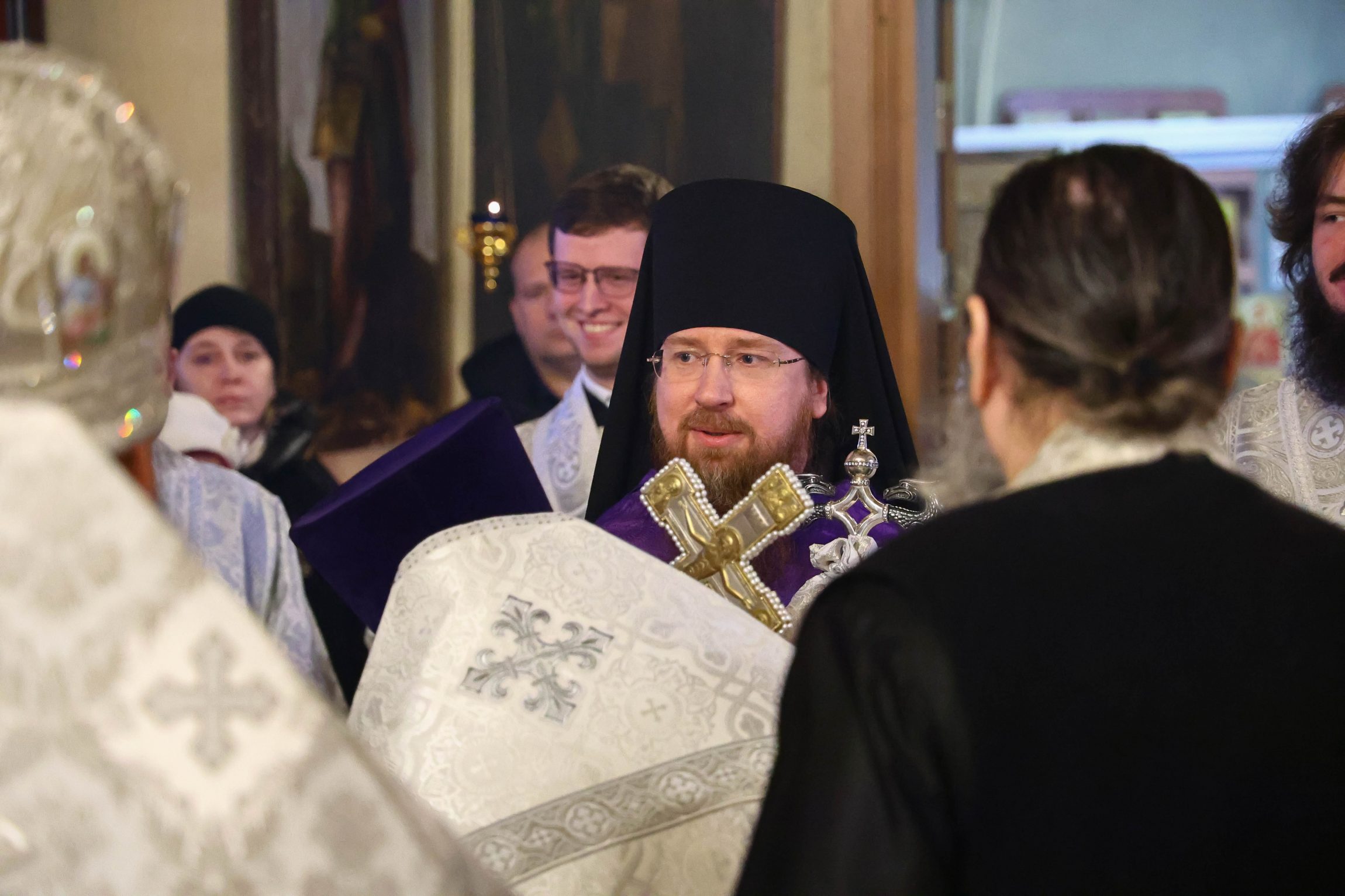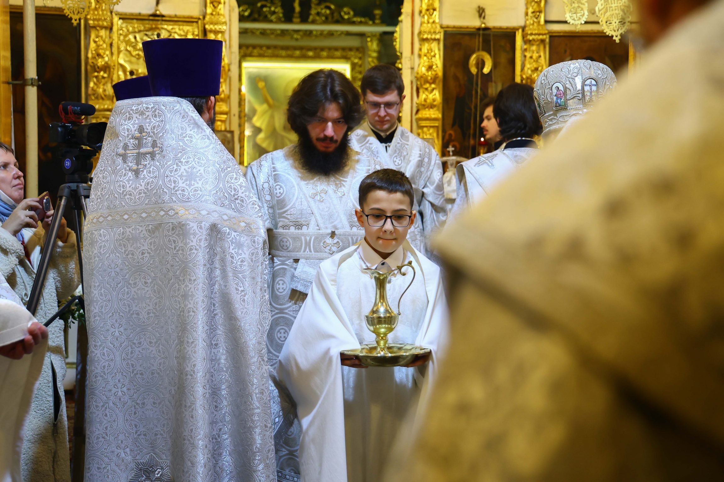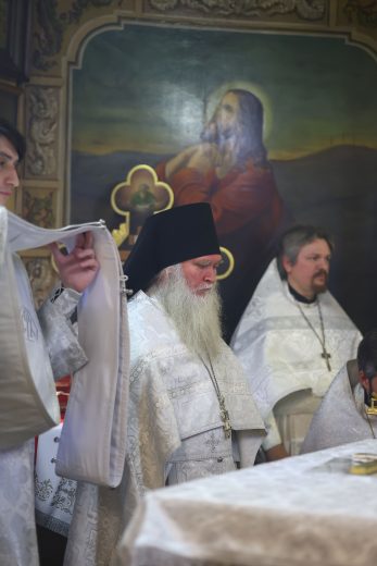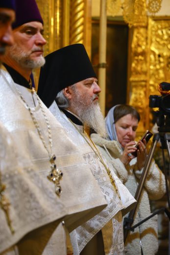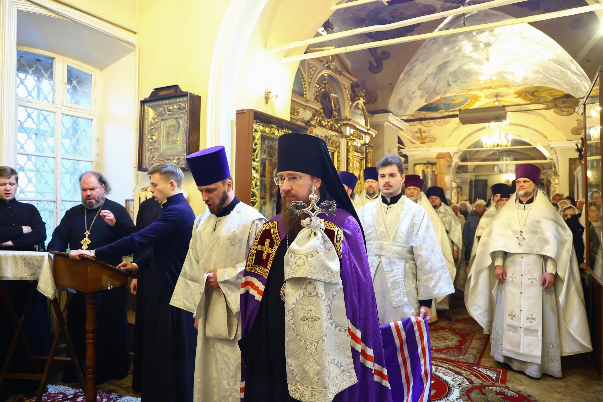 На сугубой ектении вознесены молитвы о благопоспешении христолюбивому Российскому воинству в установлении мира в сию лихую годину, на Святую Русь нашедшую, о мире на Украине, а также о сохранении единства святого Православия.