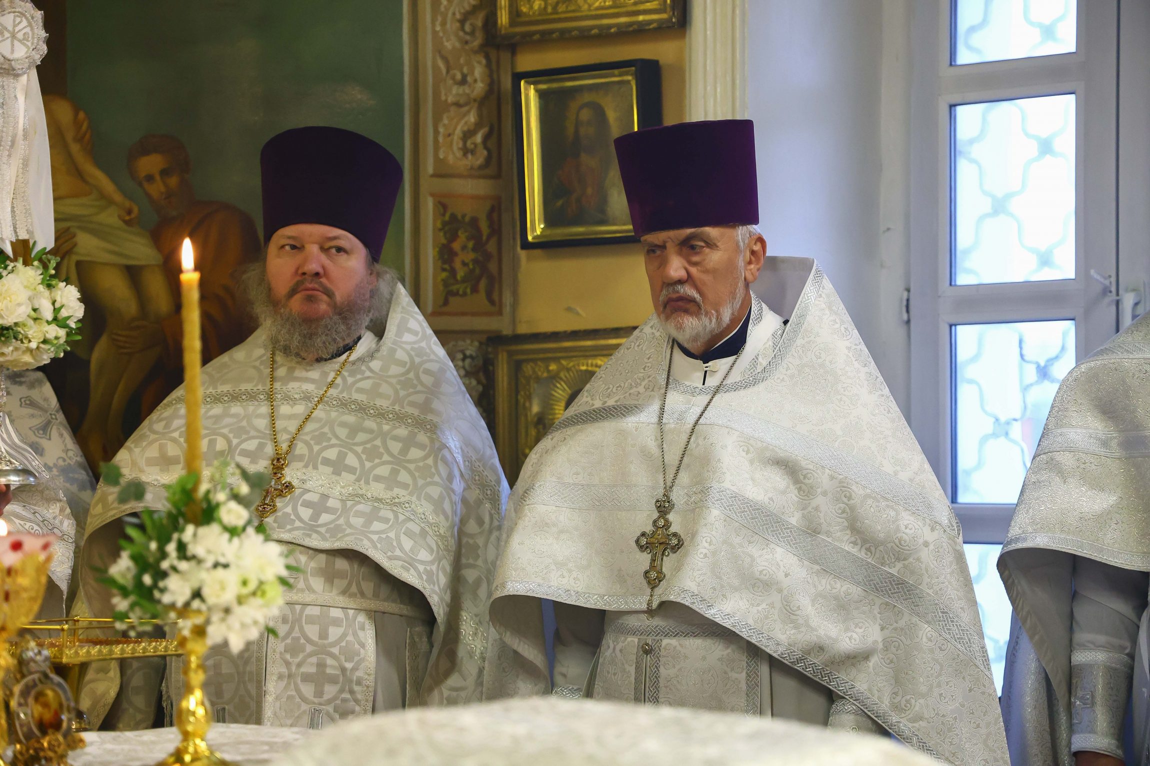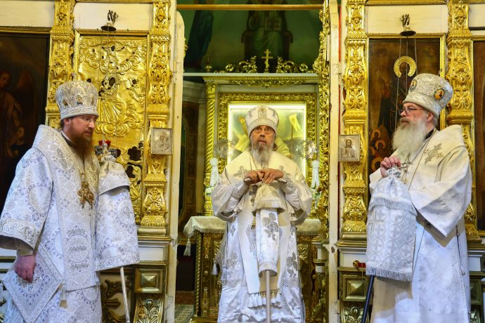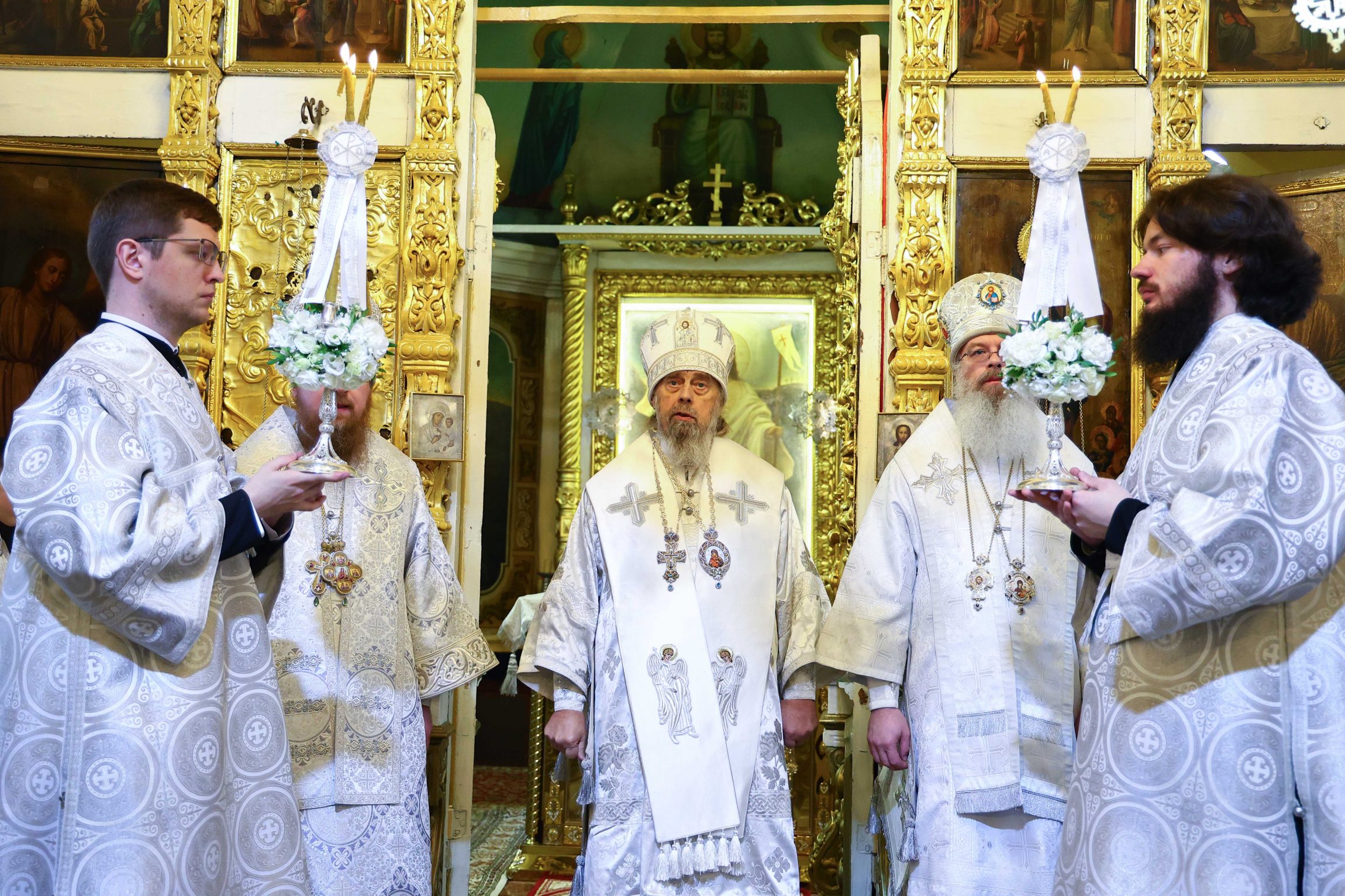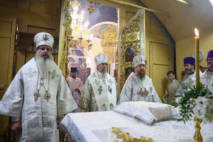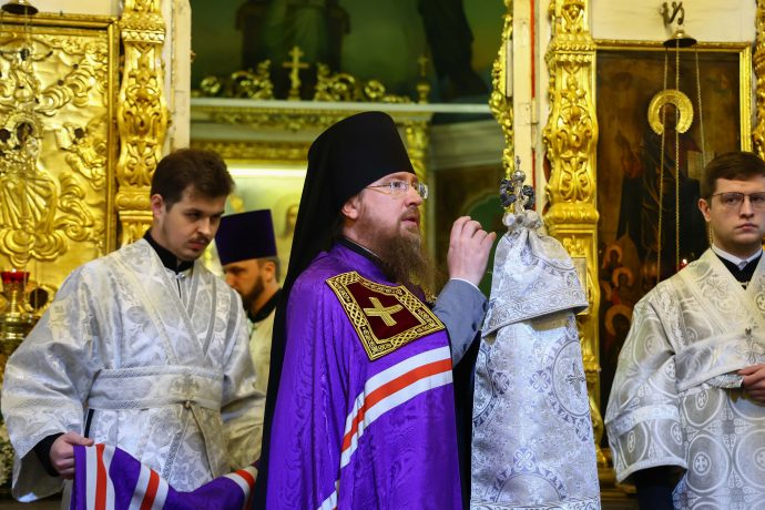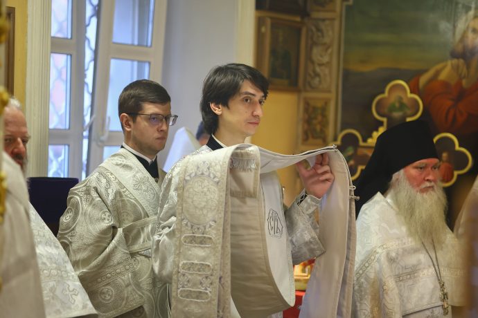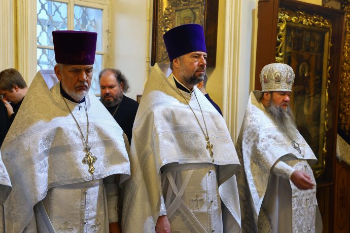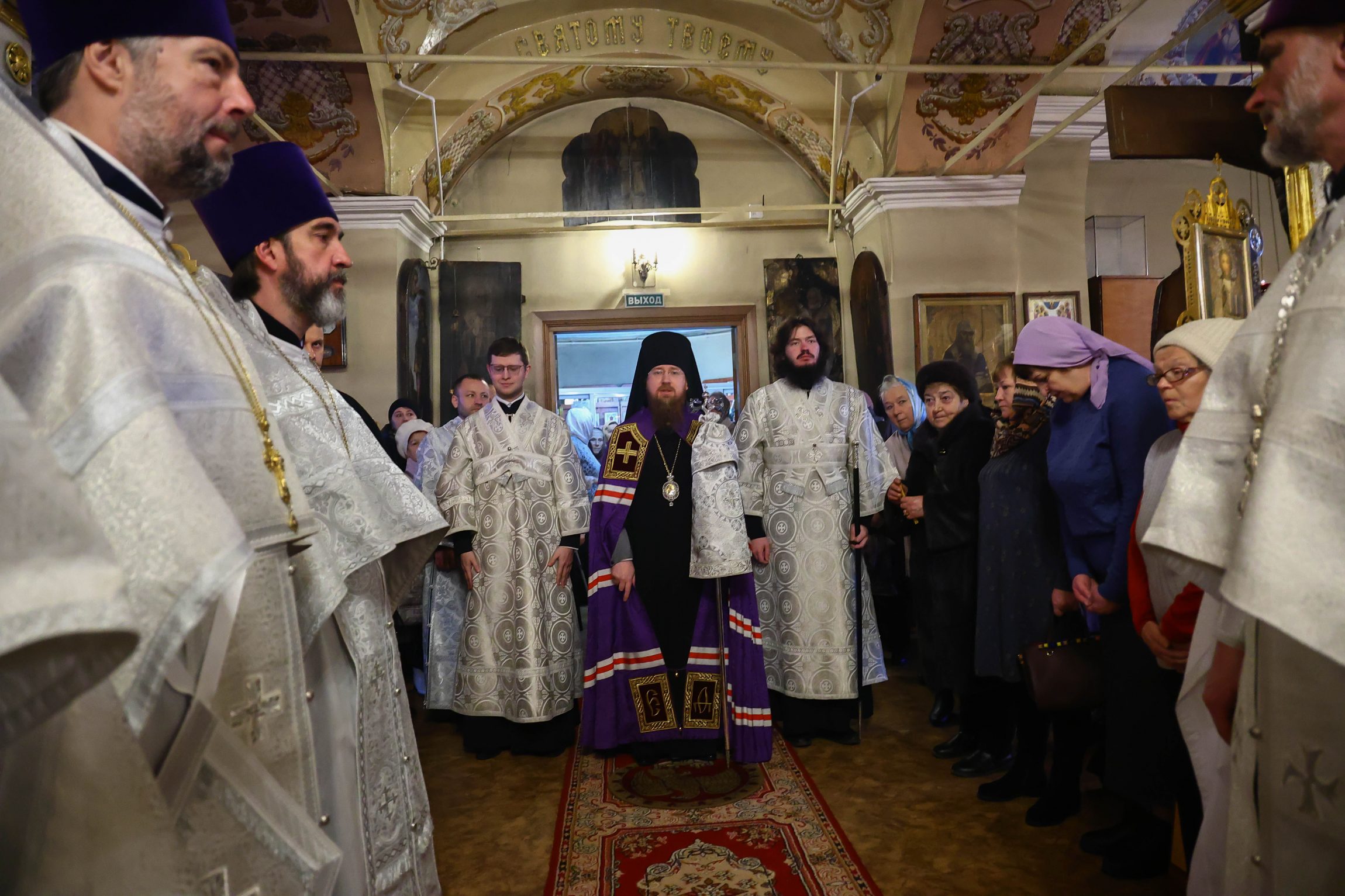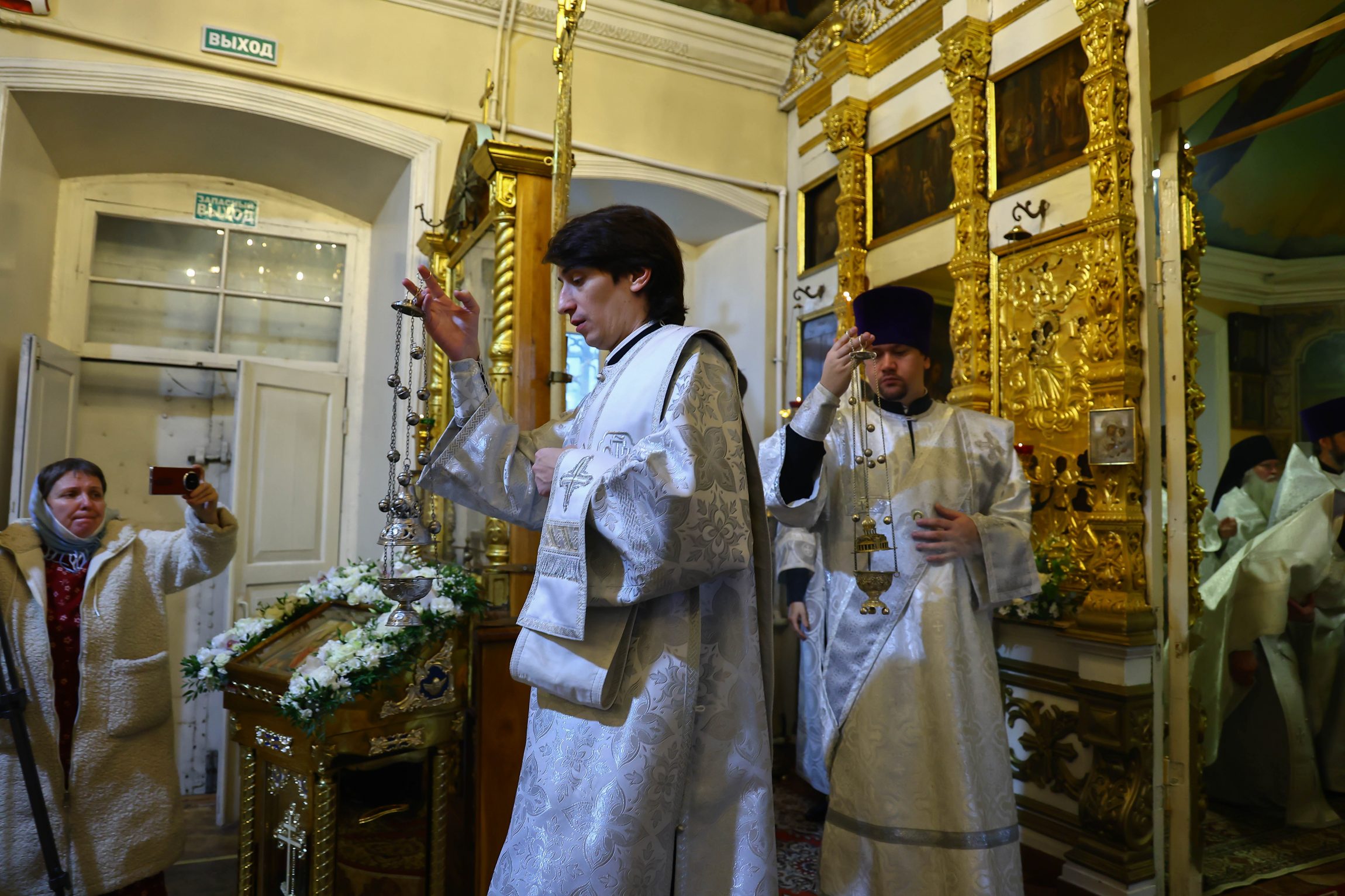 На сугубой ектении вознесены молитвы о благопоспешении христолюбивому Российскому воинству в установлении мира в сию лихую годину, на Святую Русь нашедшую, о мире на Украине, а также о сохранении единства святого Православия.
