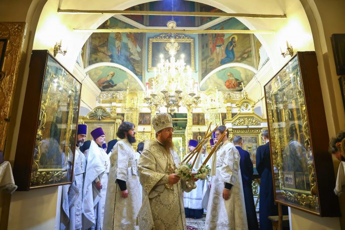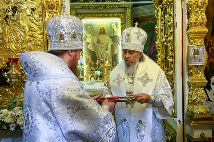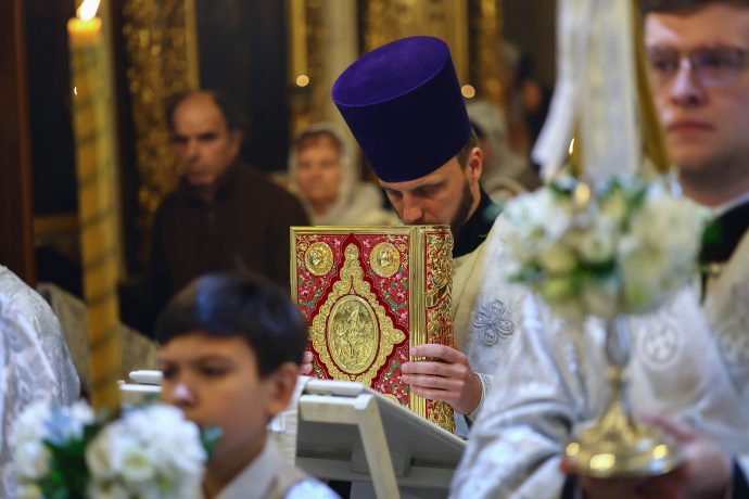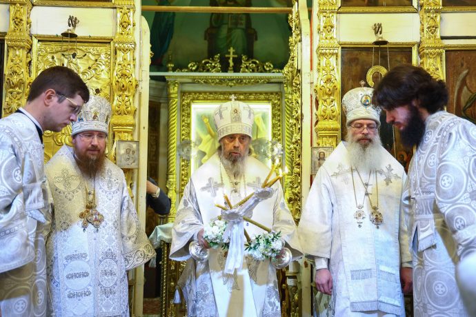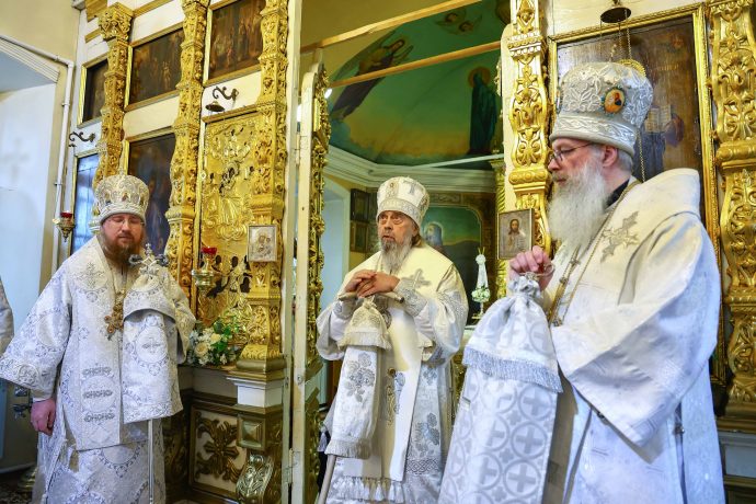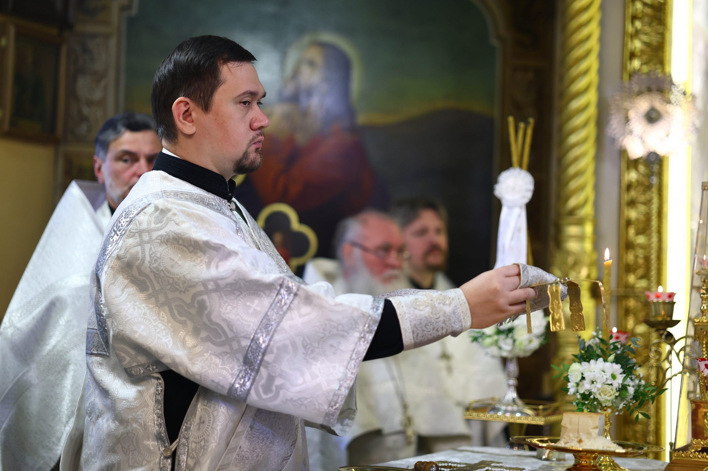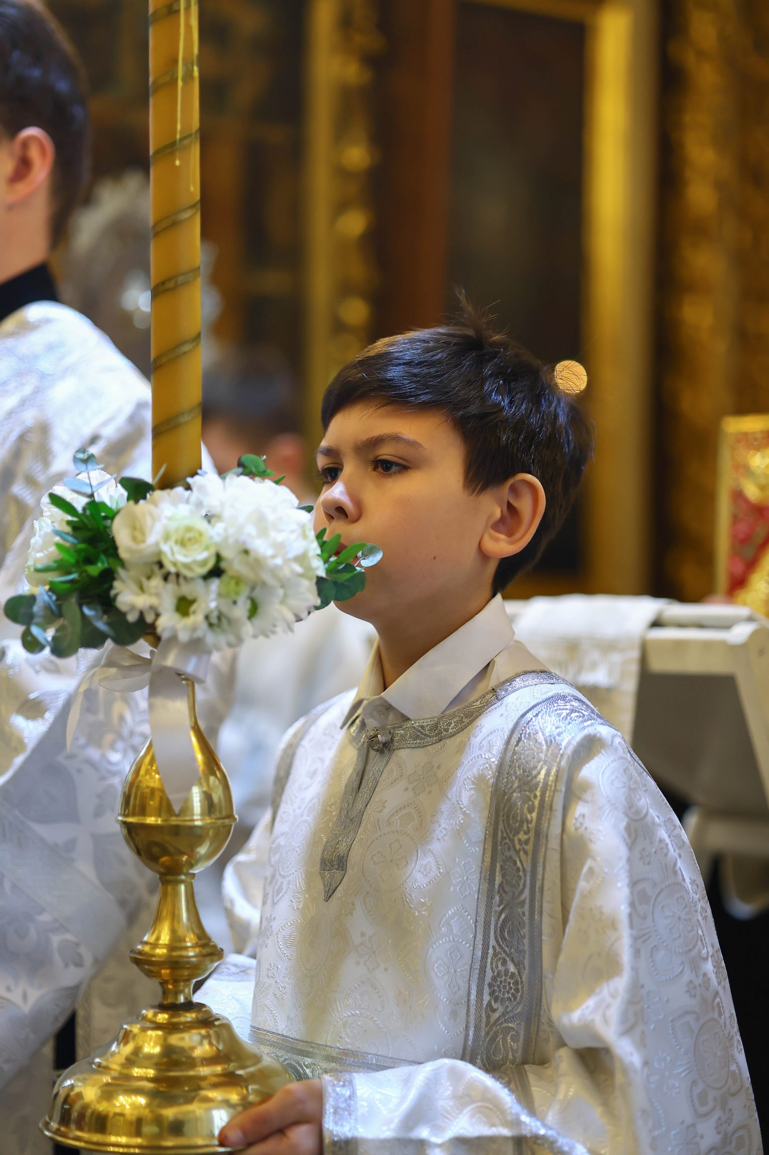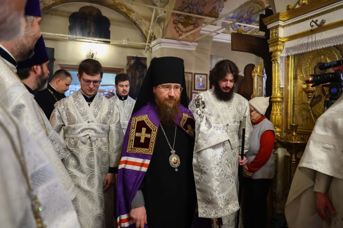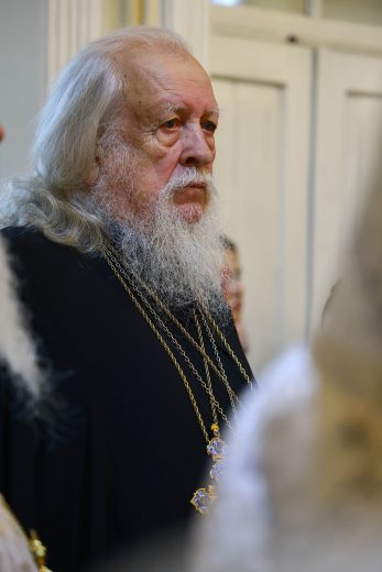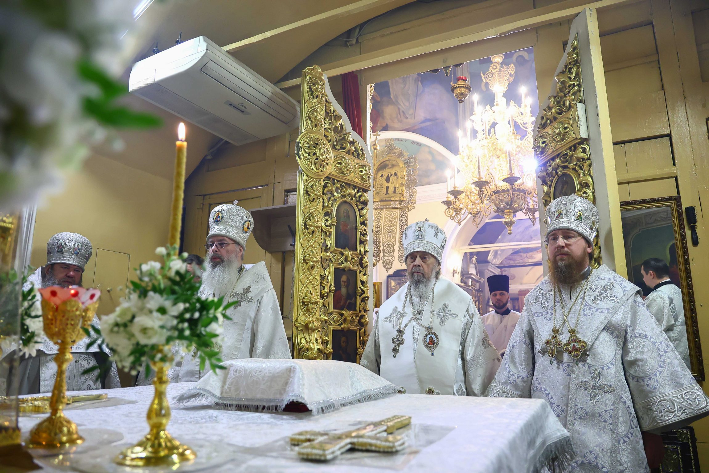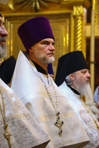 На сугубой ектении вознесены молитвы о благопоспешении христолюбивому Российскому воинству в установлении мира в сию лихую годину, на Святую Русь нашедшую, о мире на Украине, а также о сохранении единства святого Православия.