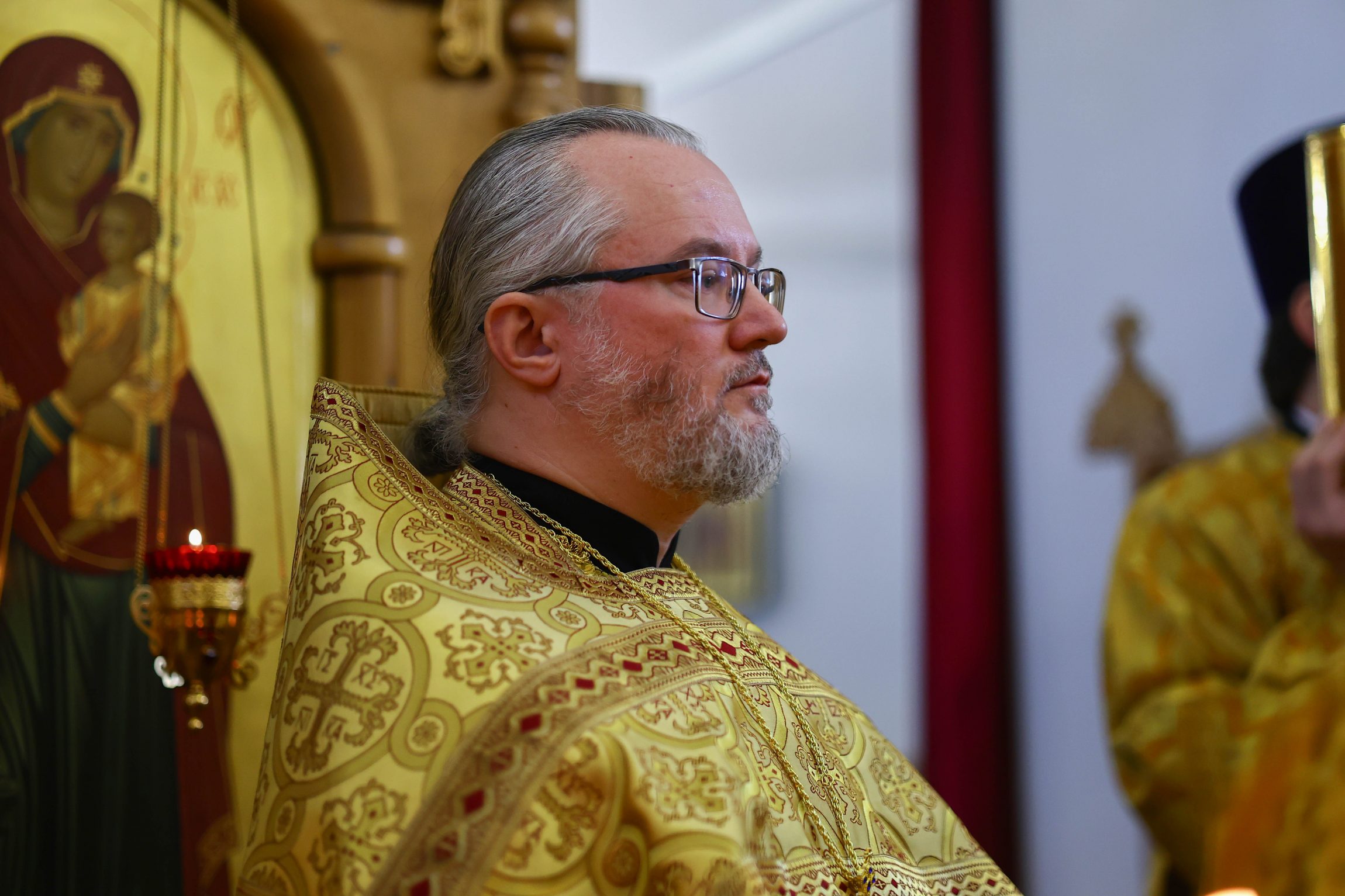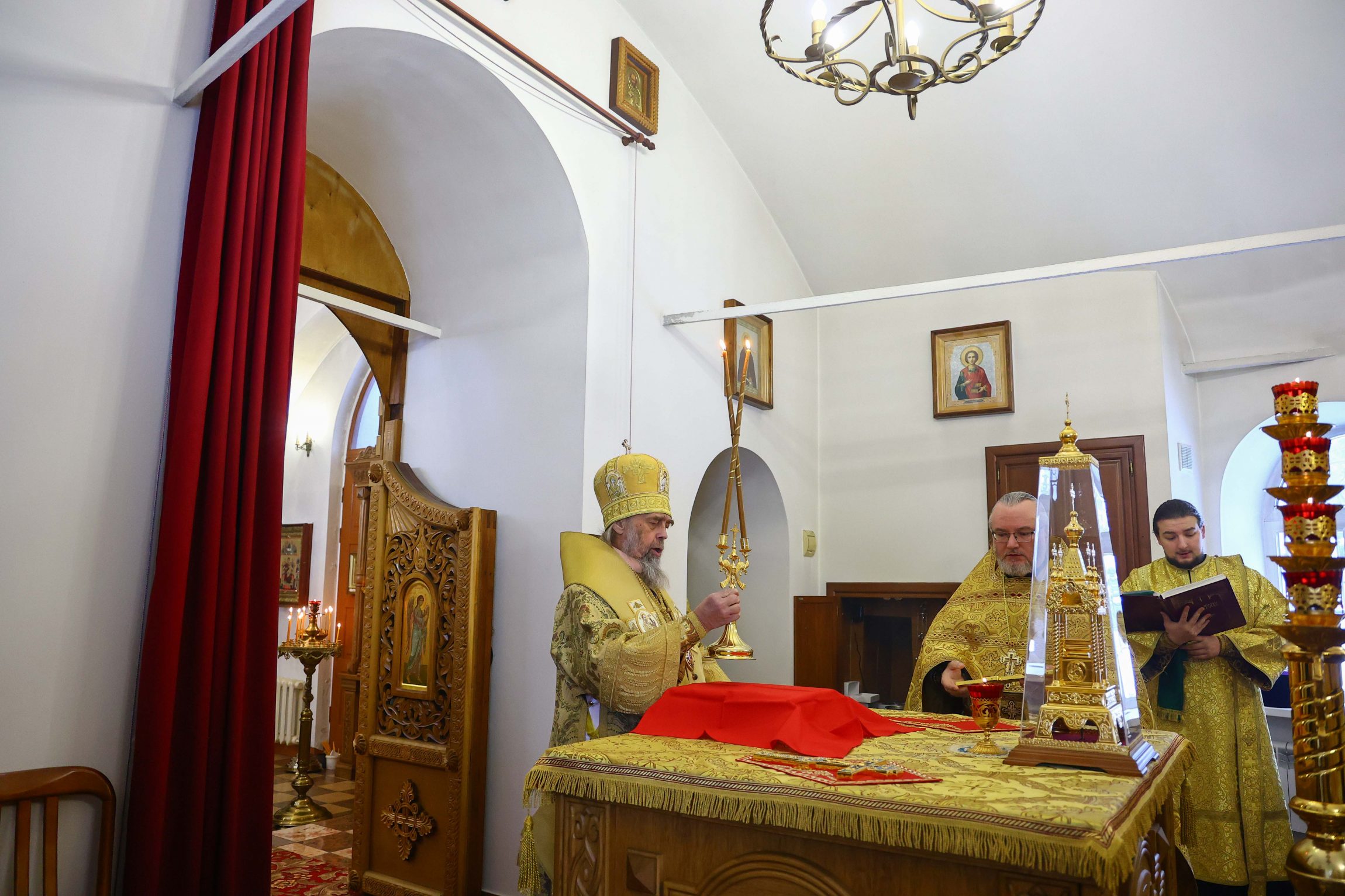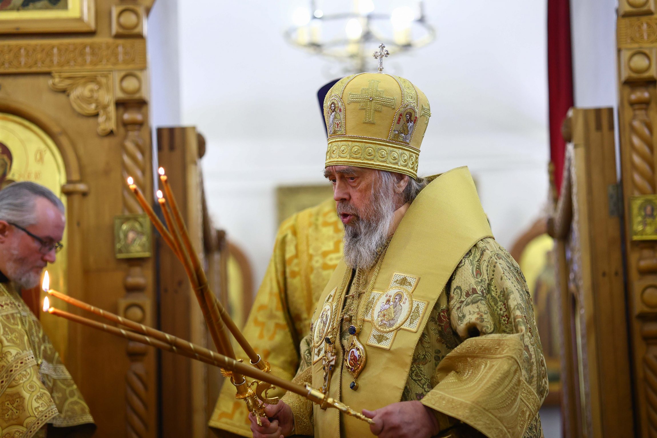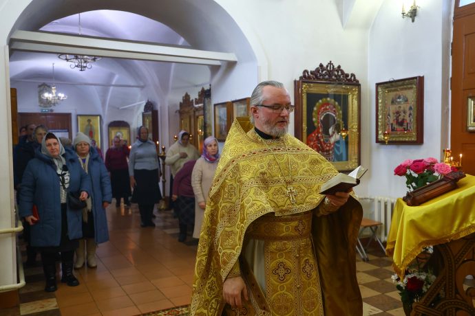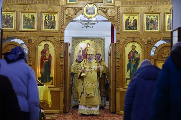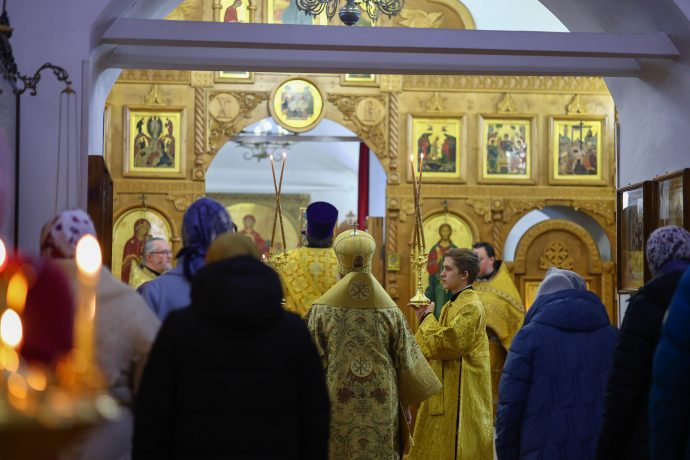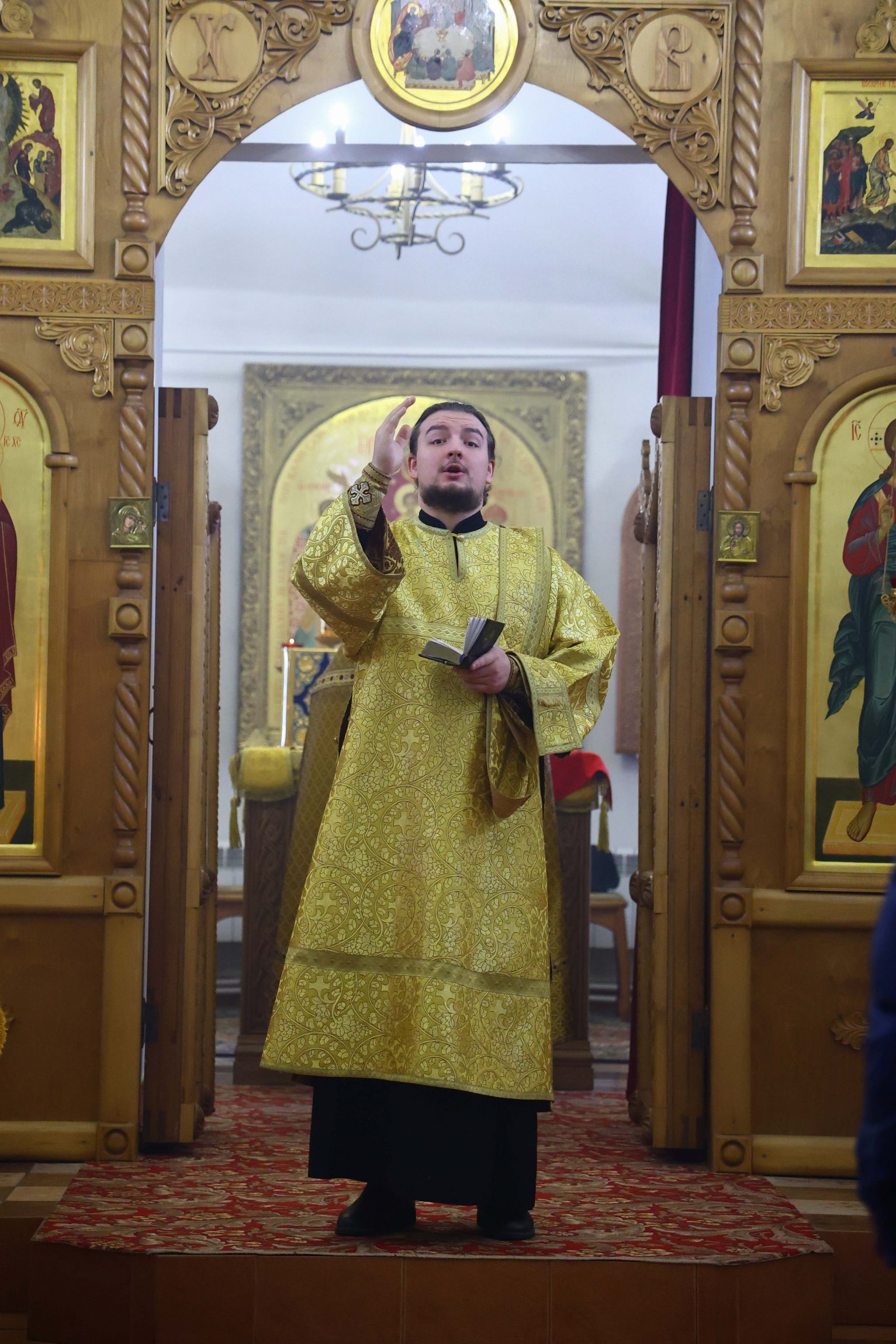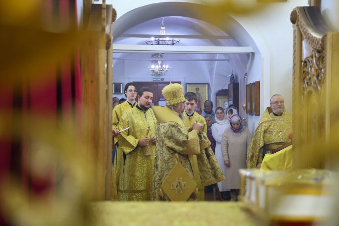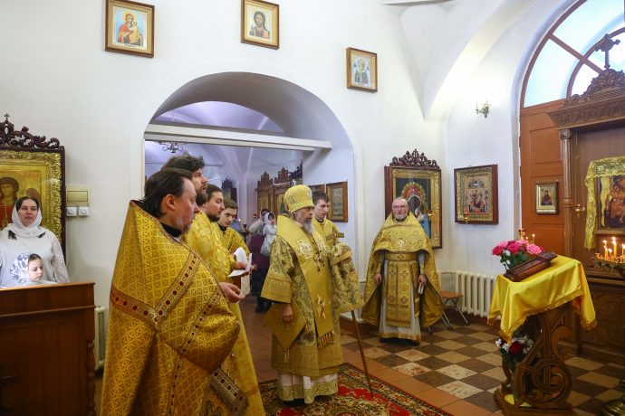 На сугубой ектении вознесены молитвы о благопоспешении христолюбивому Российскому воинству в установлении мира в сию лихую годину, на Святую Русь нашедшую, о мире на Украине, а также о сохранении единства святого Православия.