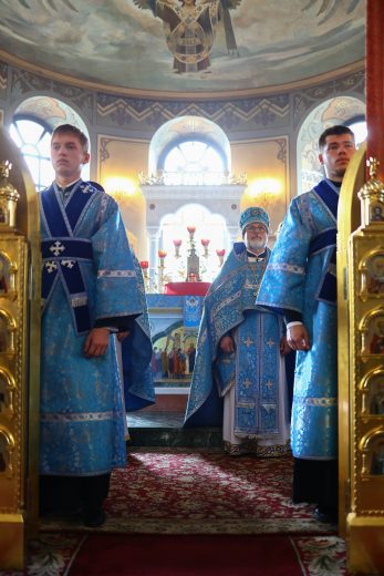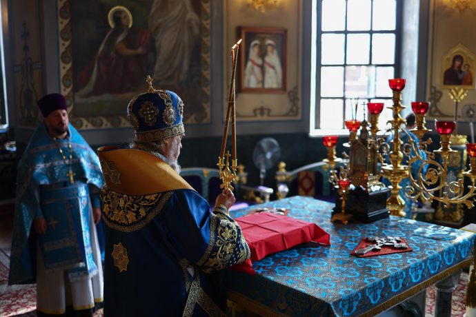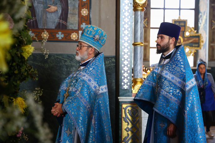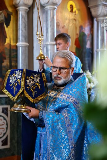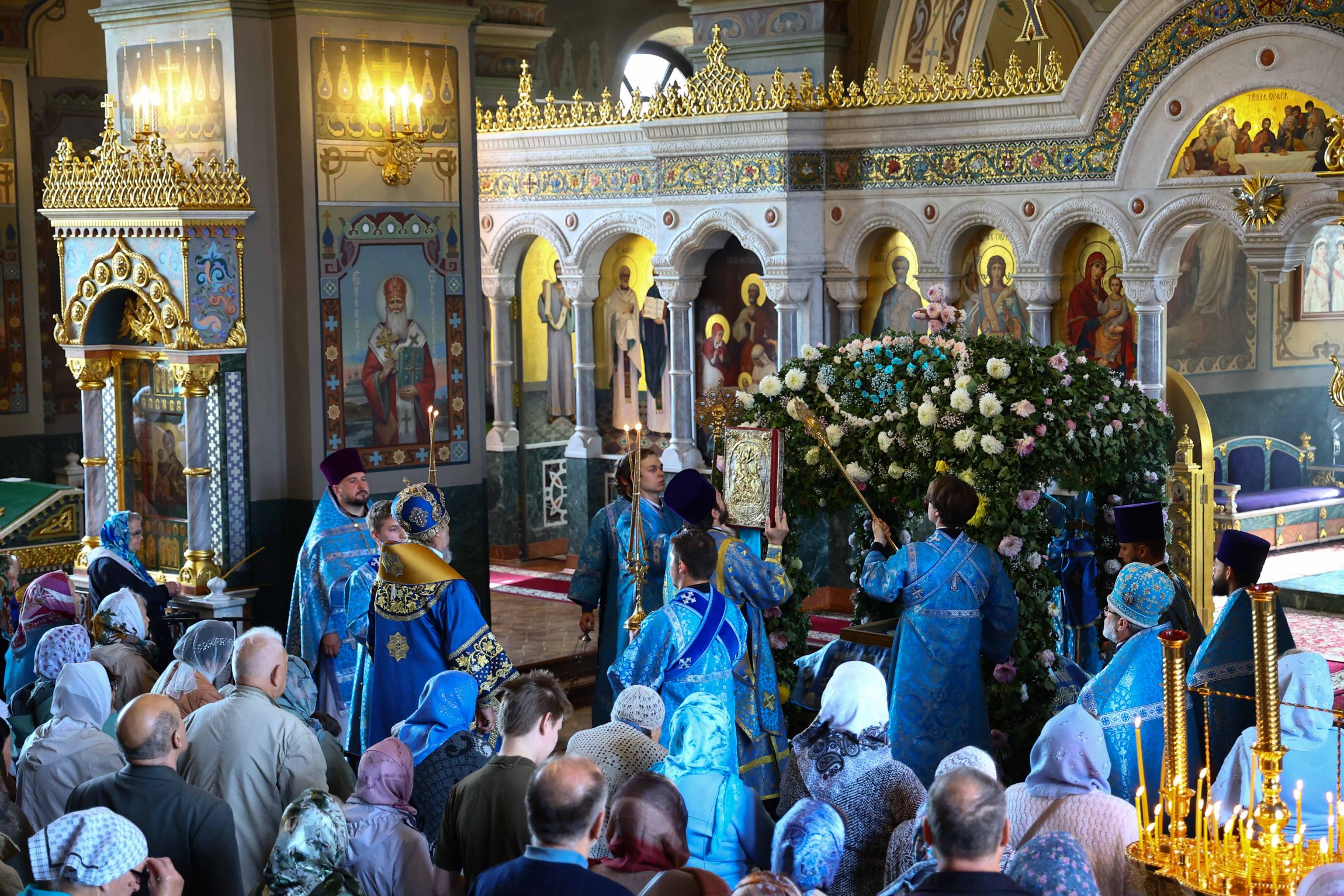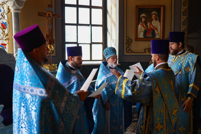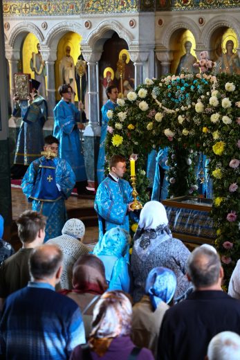 По окончании богослужения совершено славление Божией Матери с окроплением молящихся святой водой и возглашением уставного многолетия.