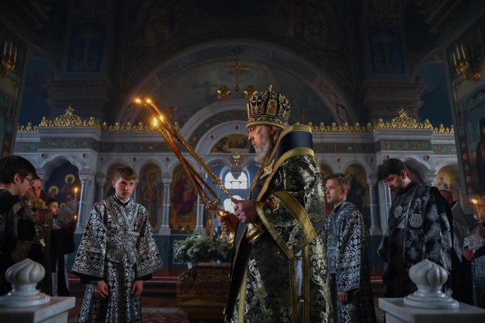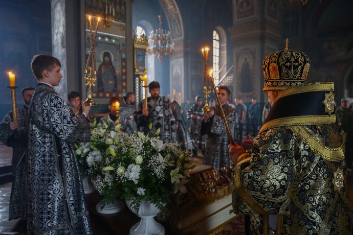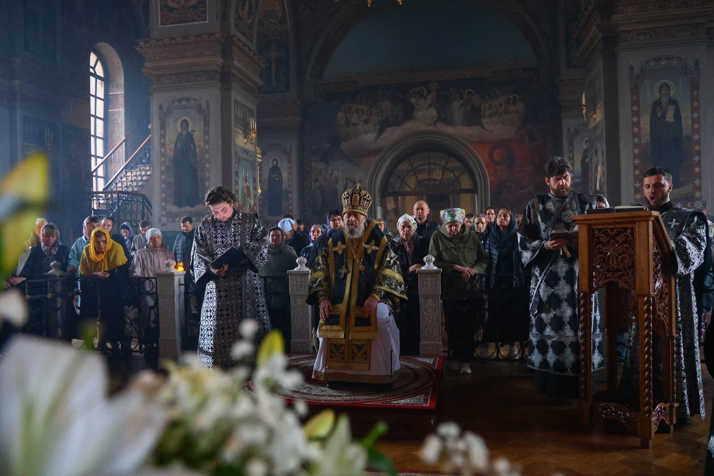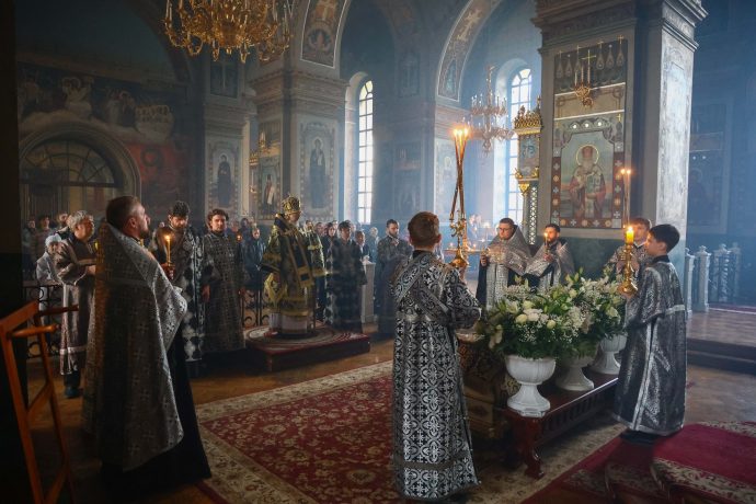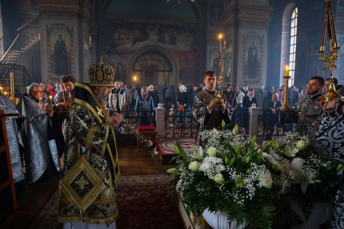 Митрополит Тульский и Ефремовский Алексий совершил утреню Великой Субботы с чином погребения Плащаницы Господа нашего Иисуса Христа во Успенскои кафедральном соборе города Тула в сослужении соборного духовенства.