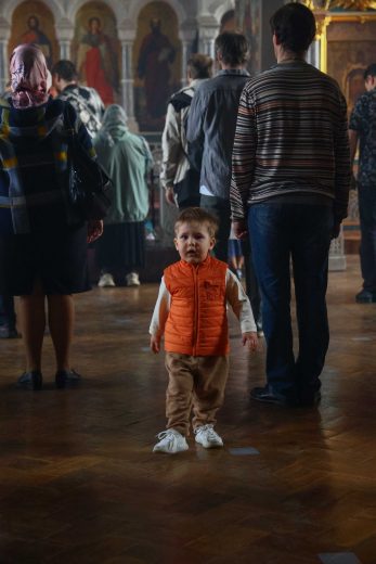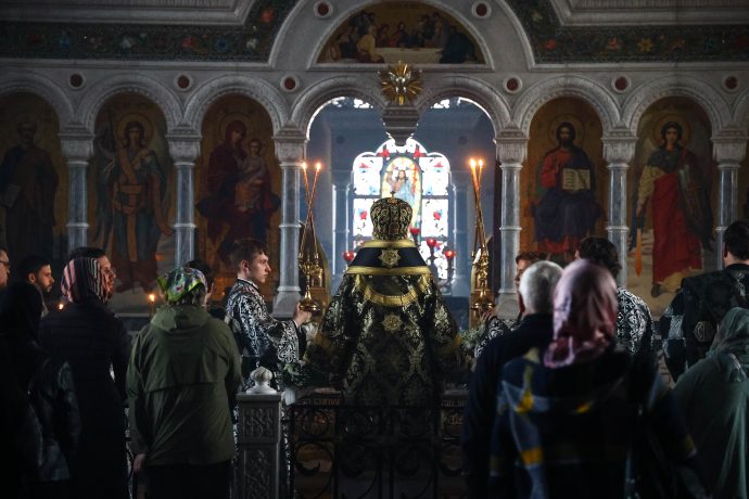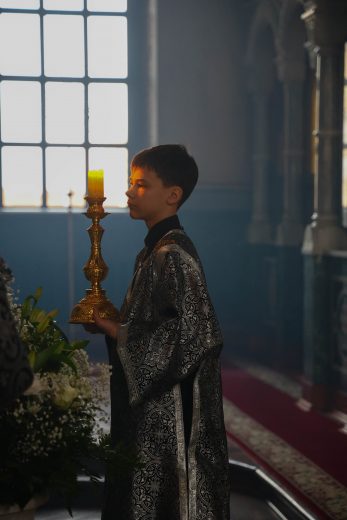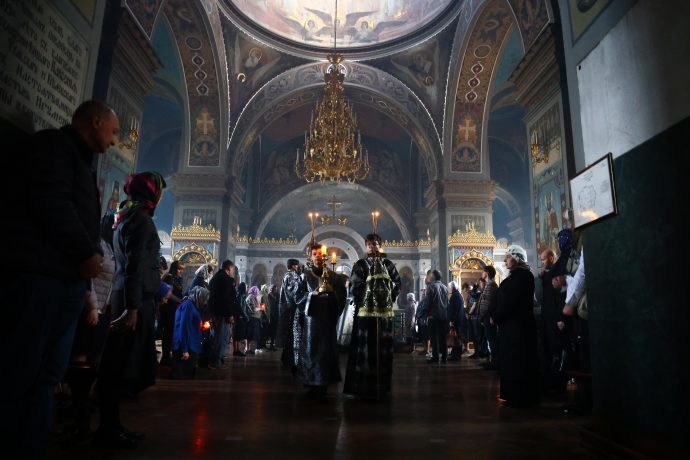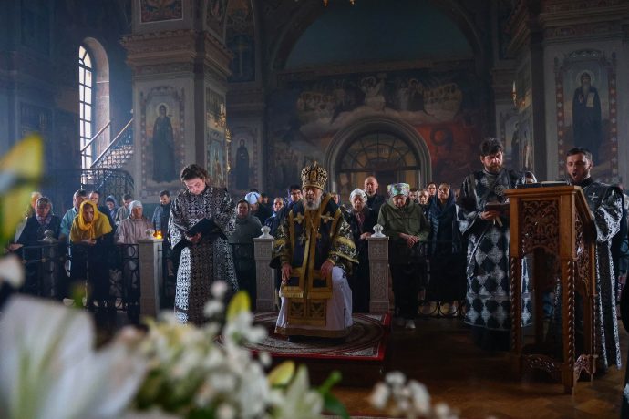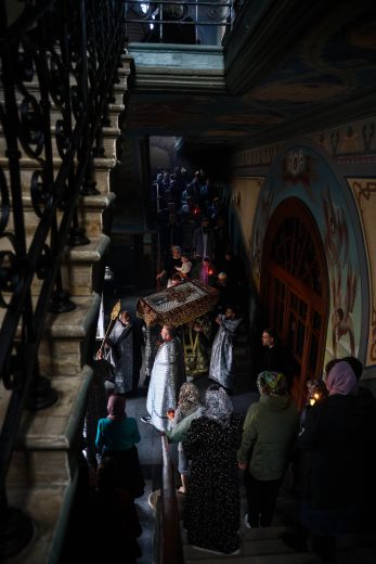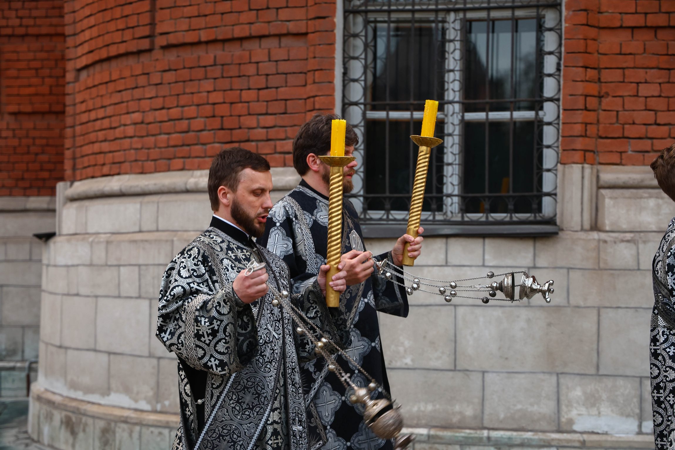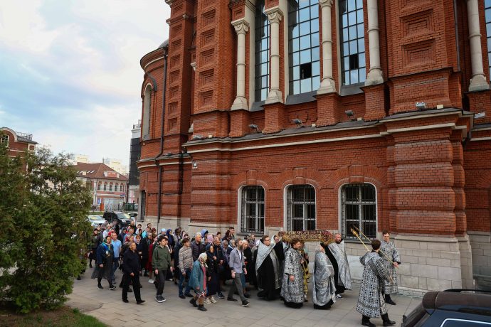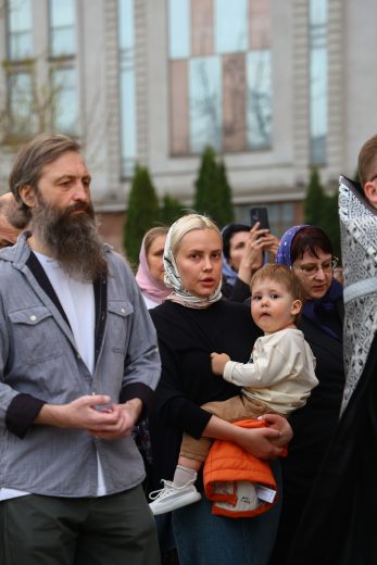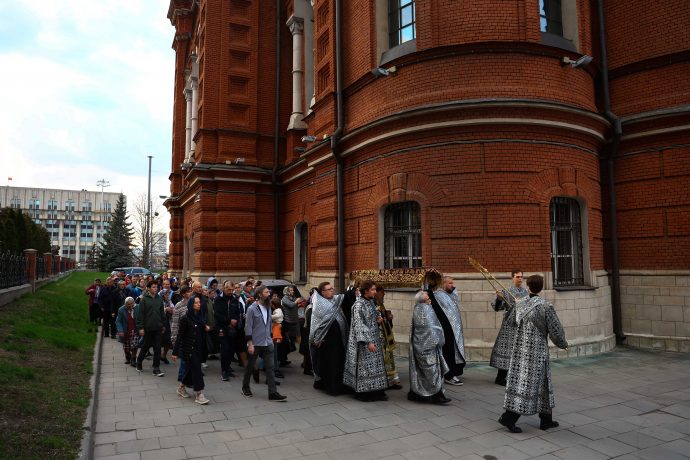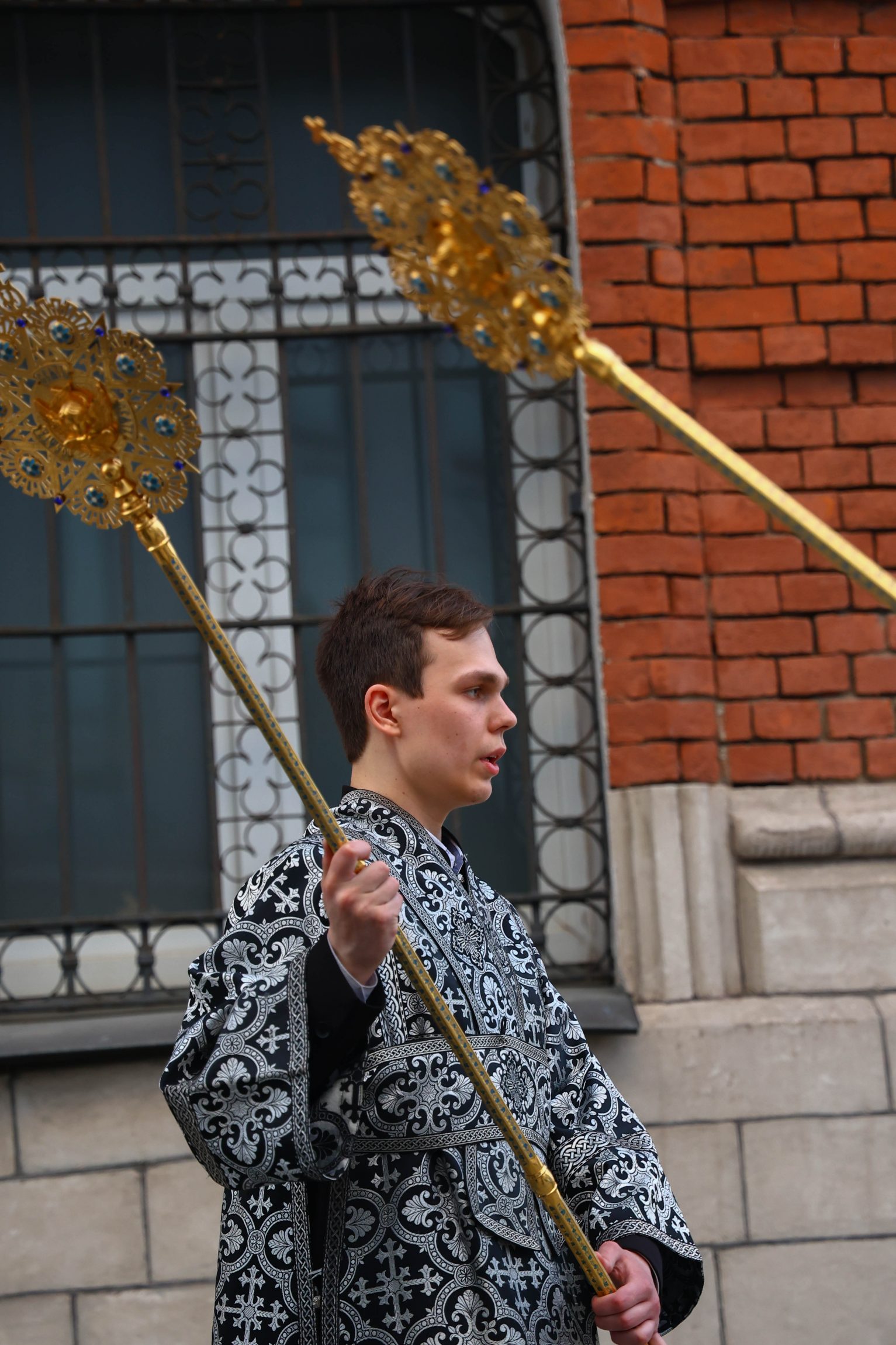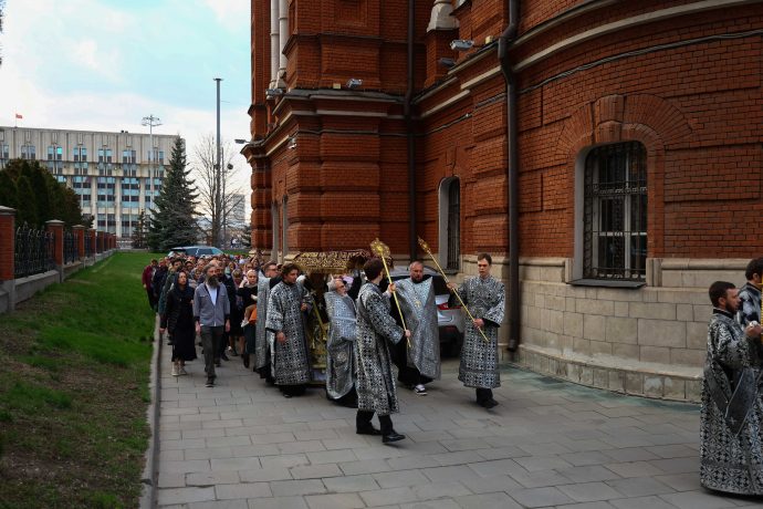 После великого славословия с пением погребального «Трисвятого» совершен крестный ход с Плащаницей вокруг храма.