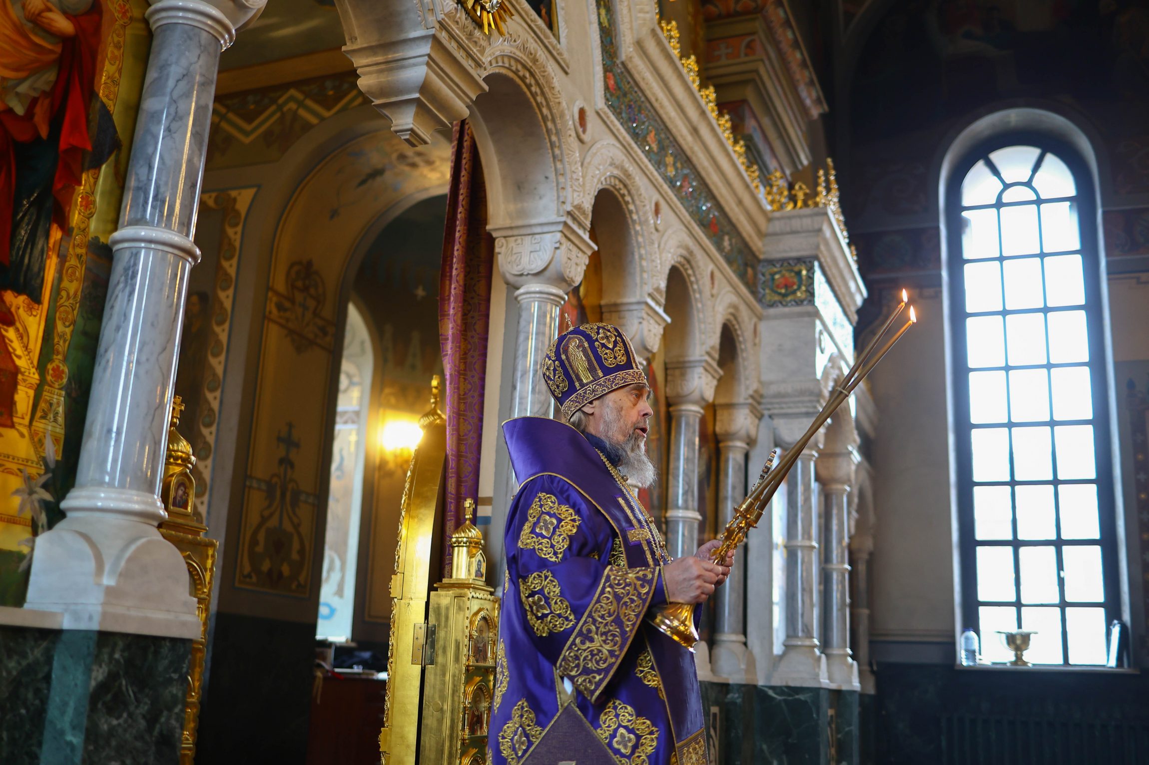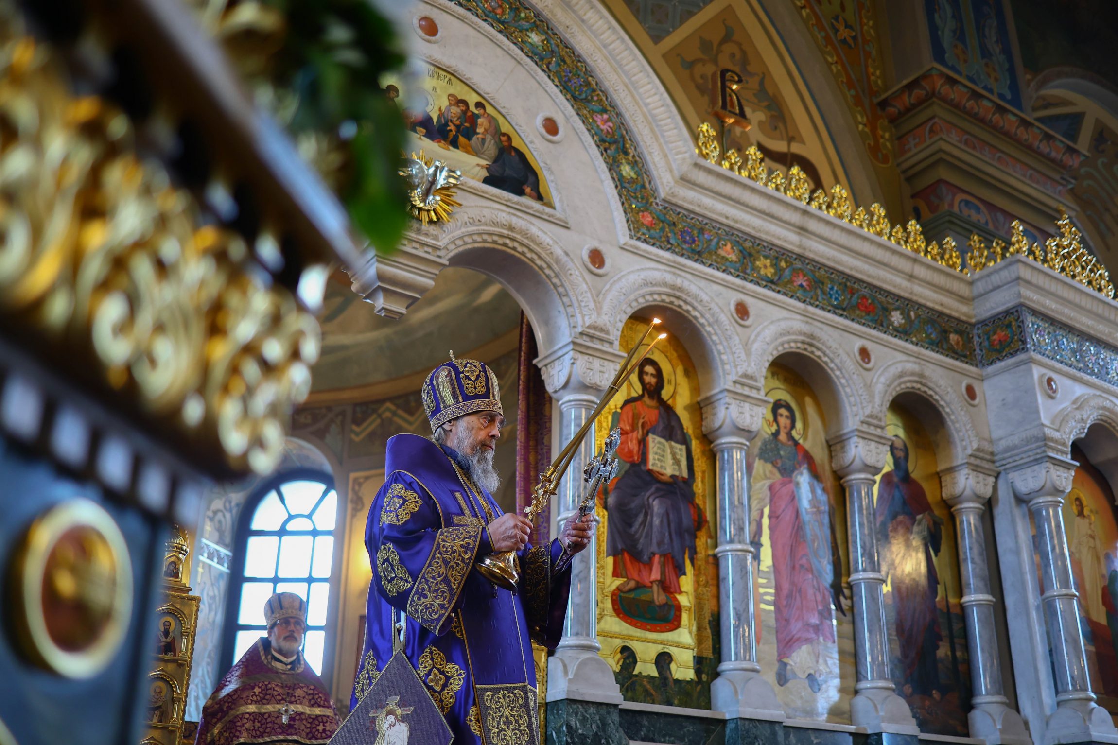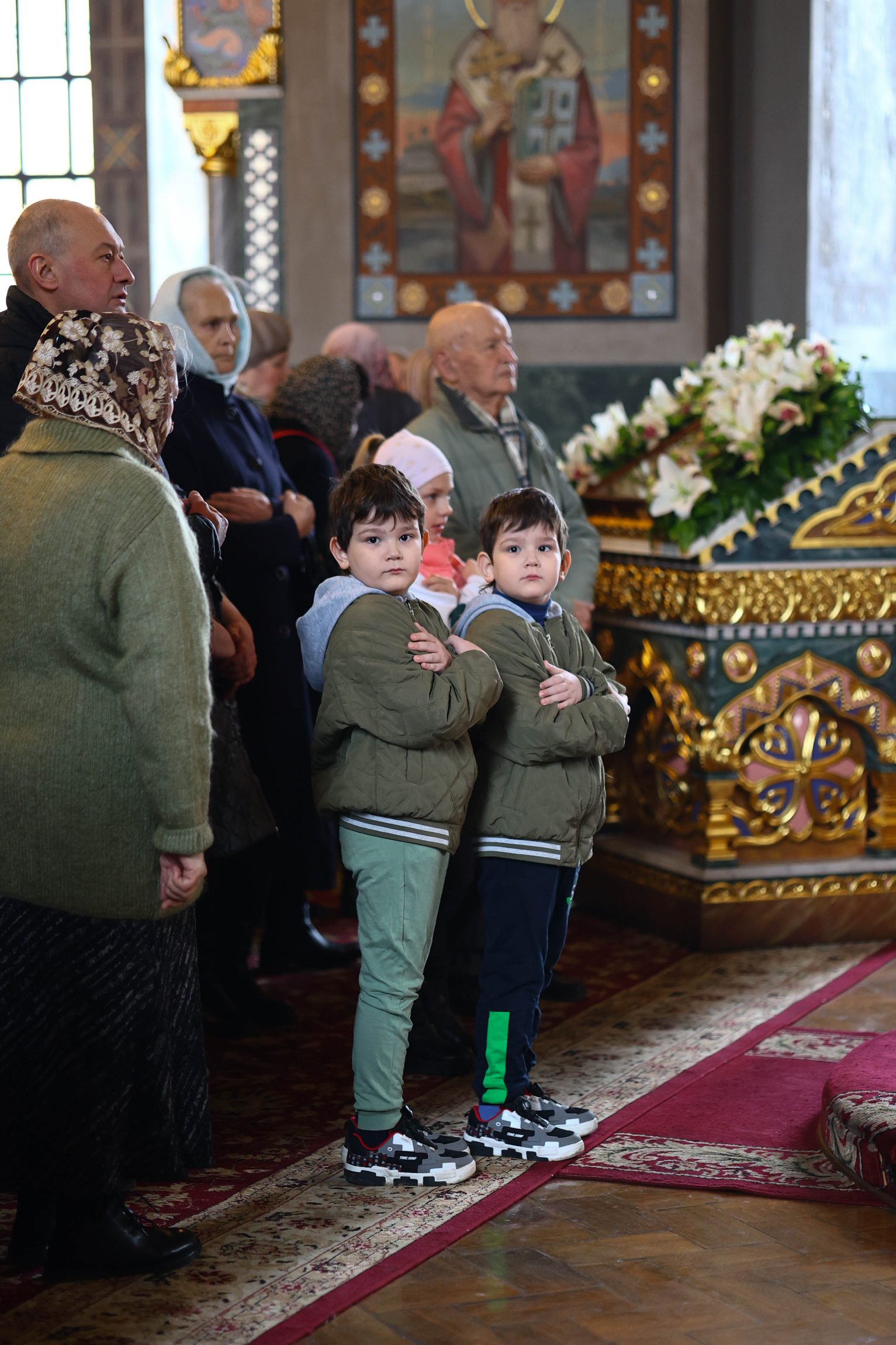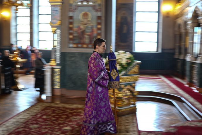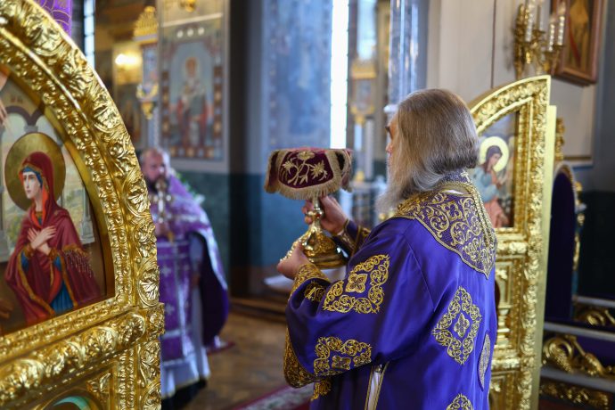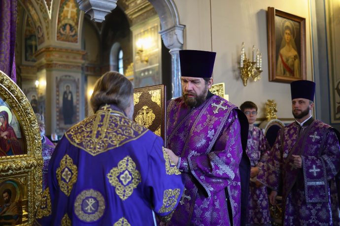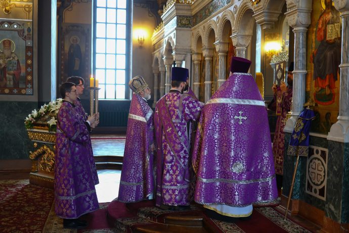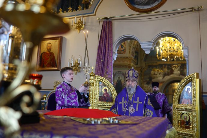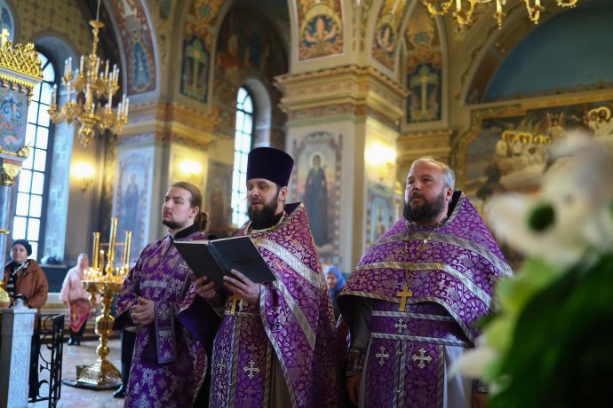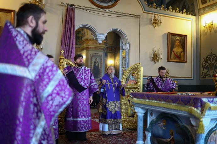 На сугубой ектении вознесены молитвы о благопоспешениихристолюбивому Российскому воинству в установлении мира в сию лихую годину, на Святую Русь нашедшую, о мире на Украине, а также о сохранении единства святого Православия.