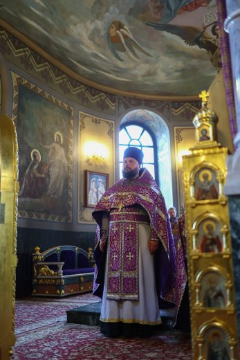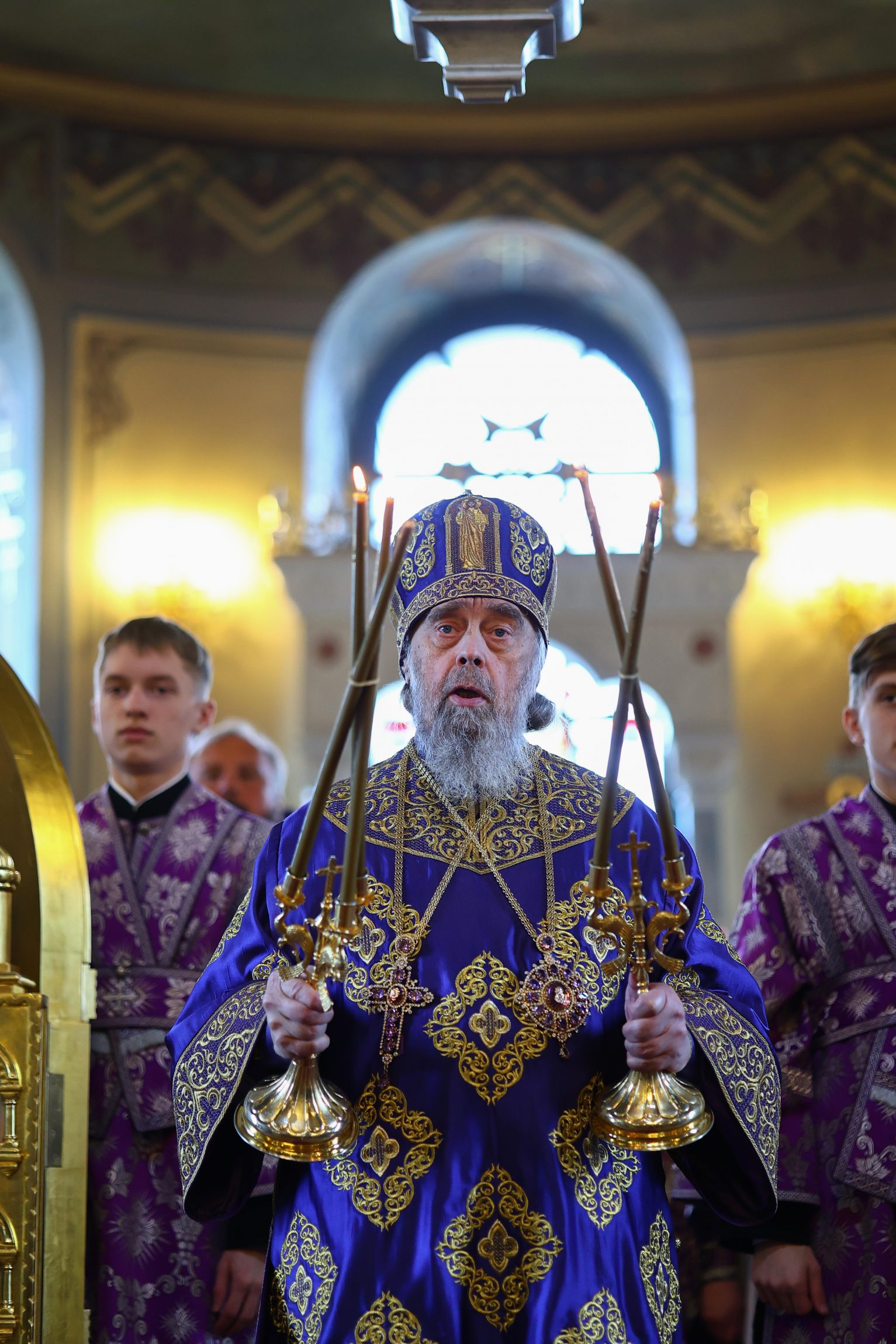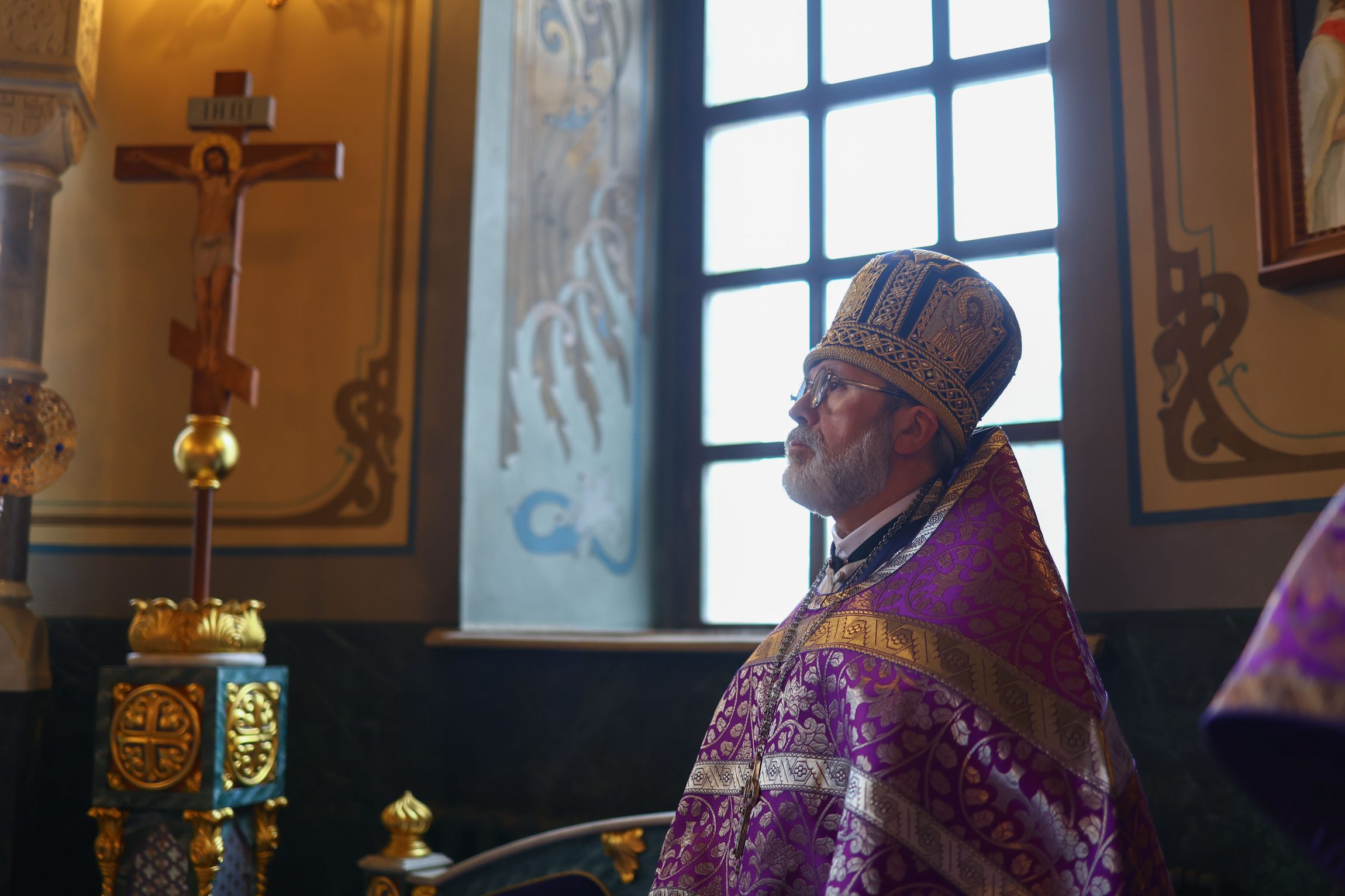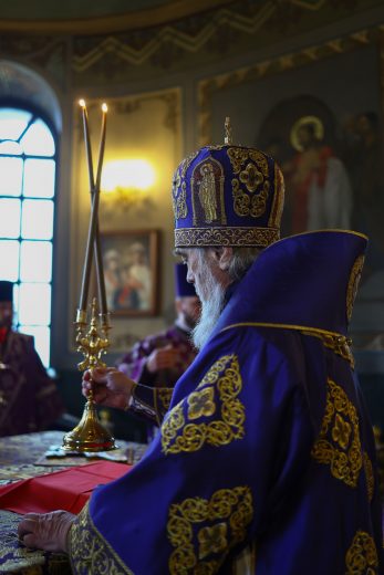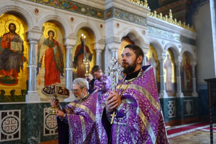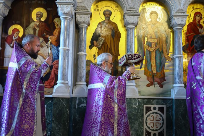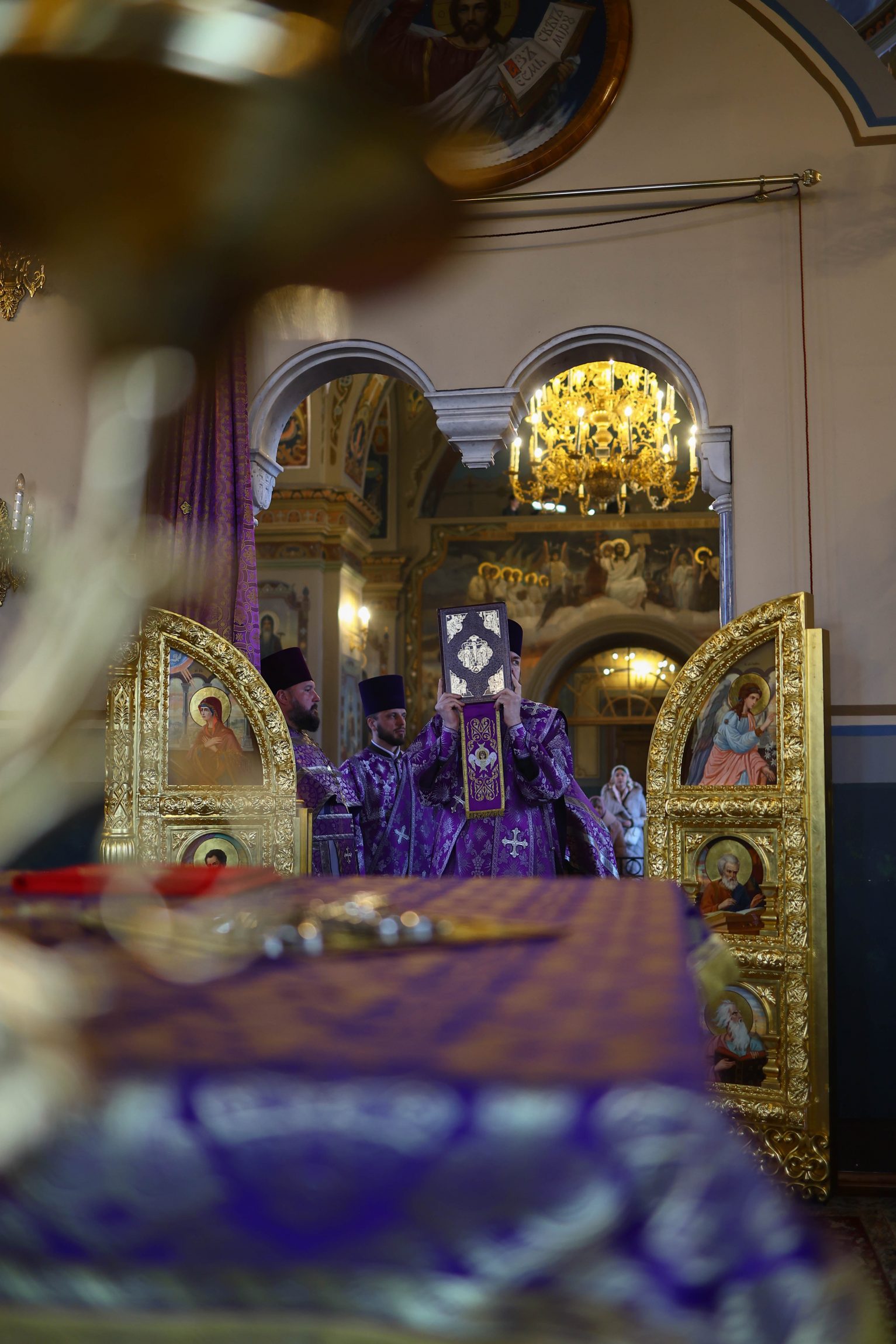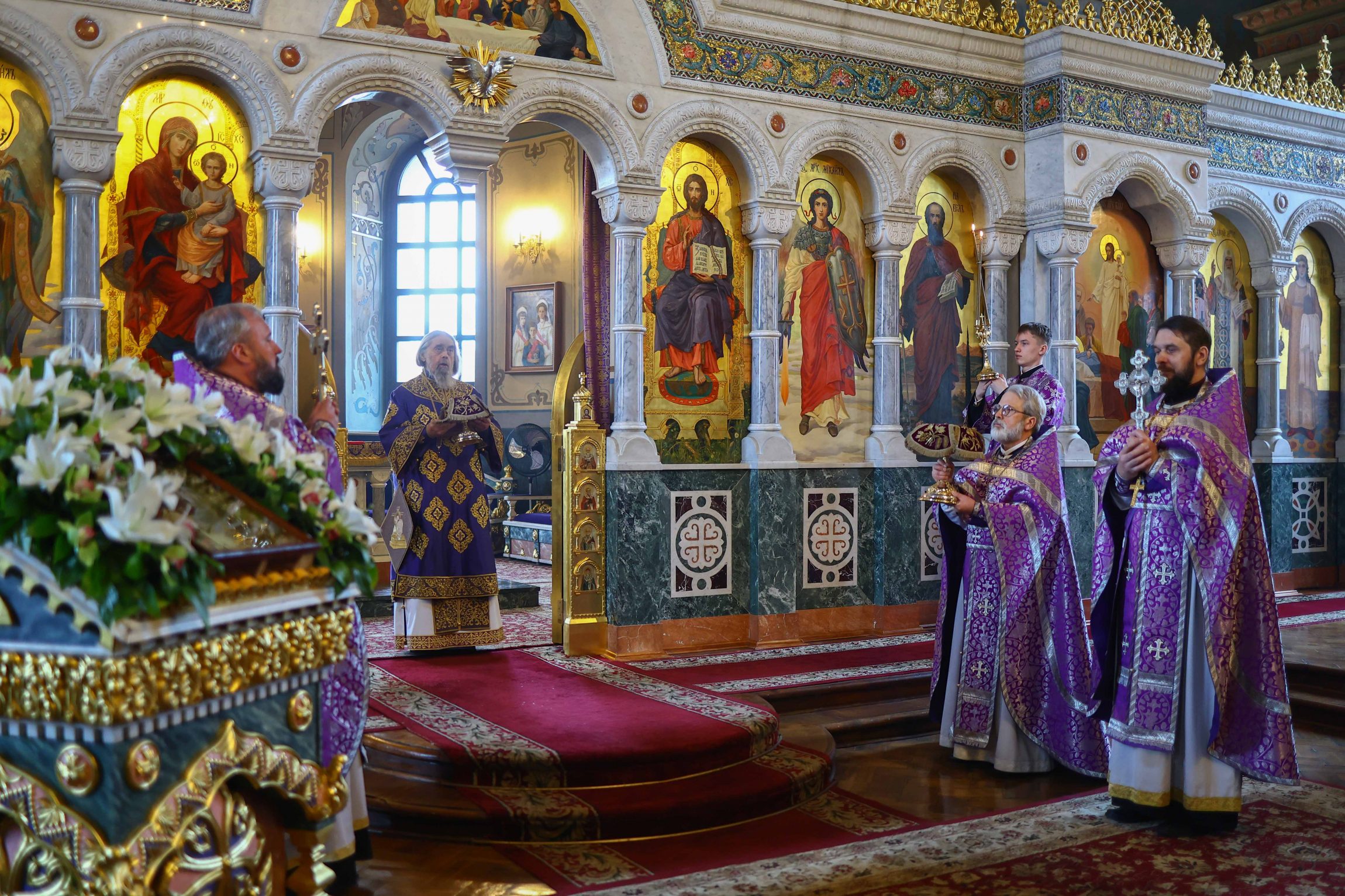 На сугубой ектении вознесены молитвы о благопоспешениихристолюбивому Российскому воинству в установлении мира в сию лихую годину, на Святую Русь нашедшую, о мире на Украине, а также о сохранении единства святого Православия.