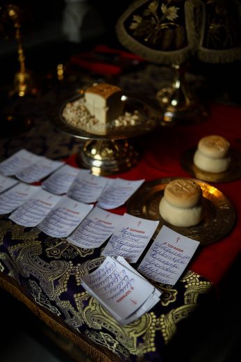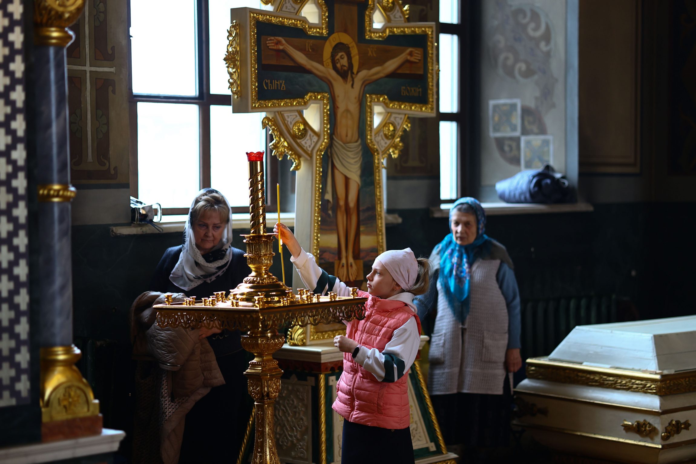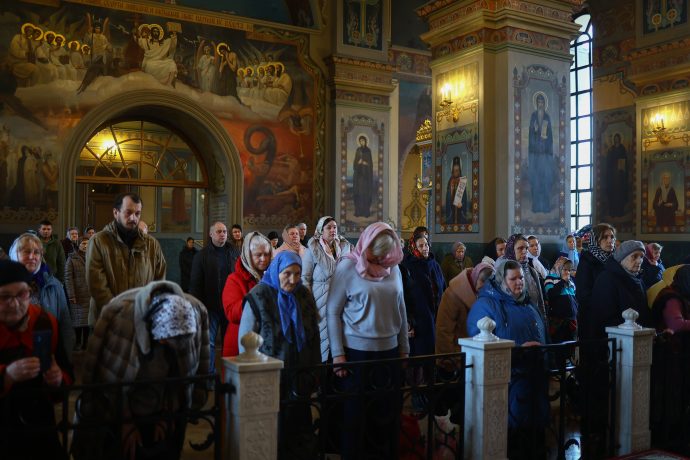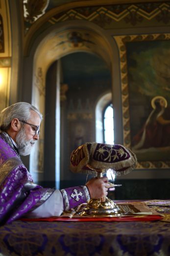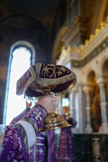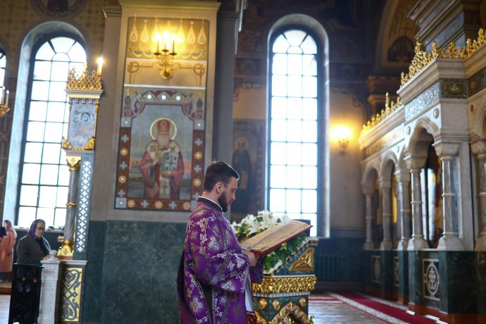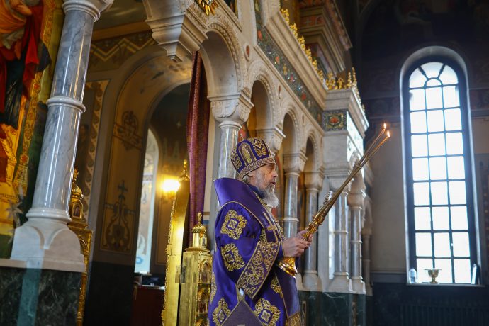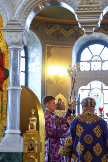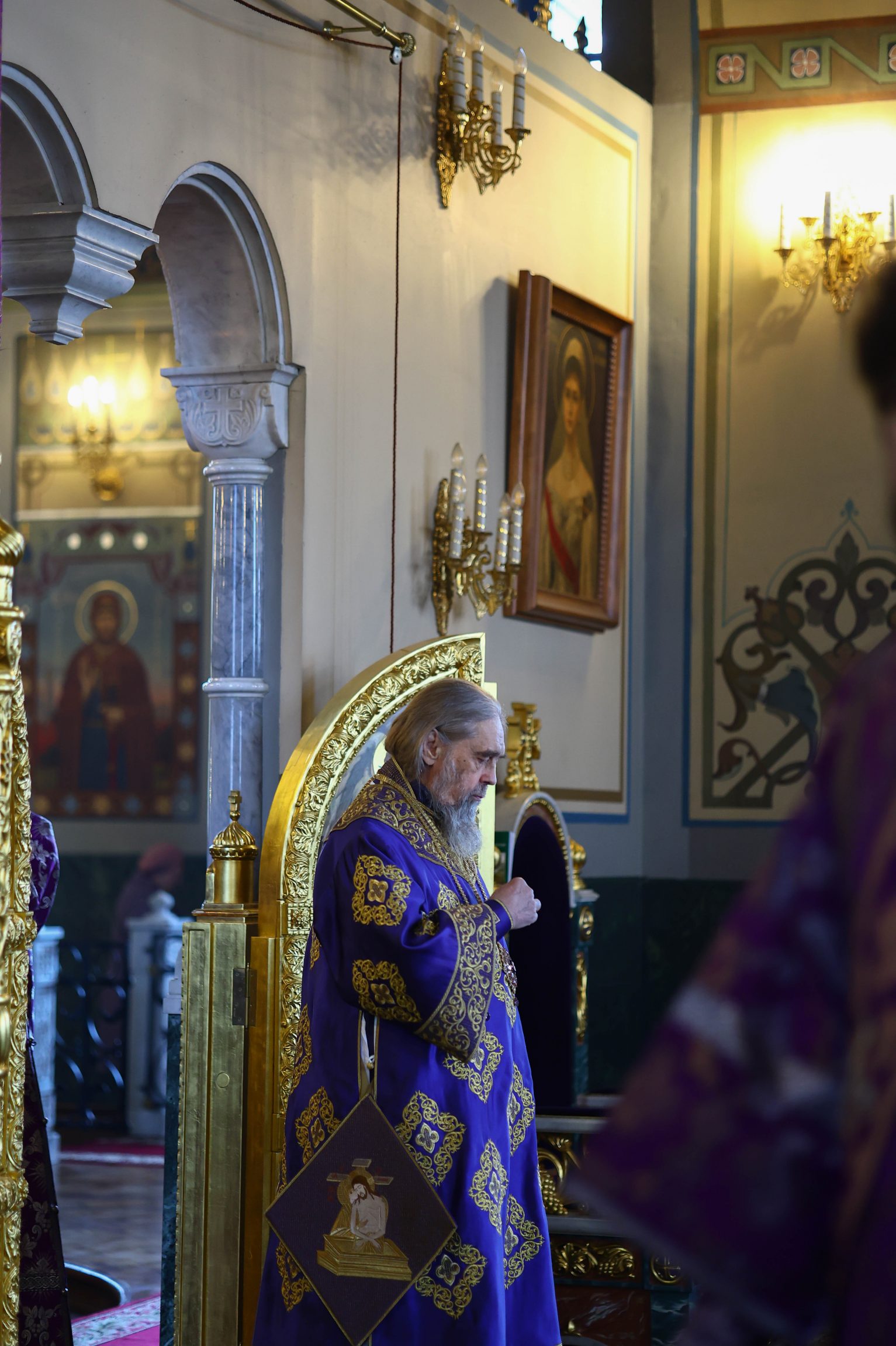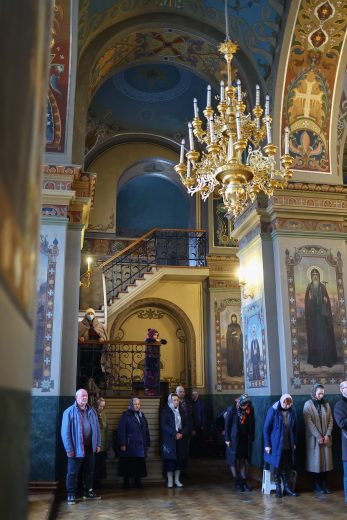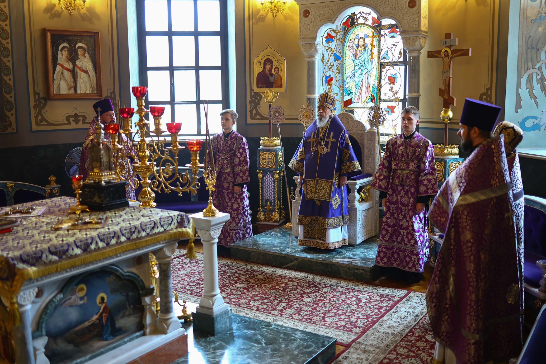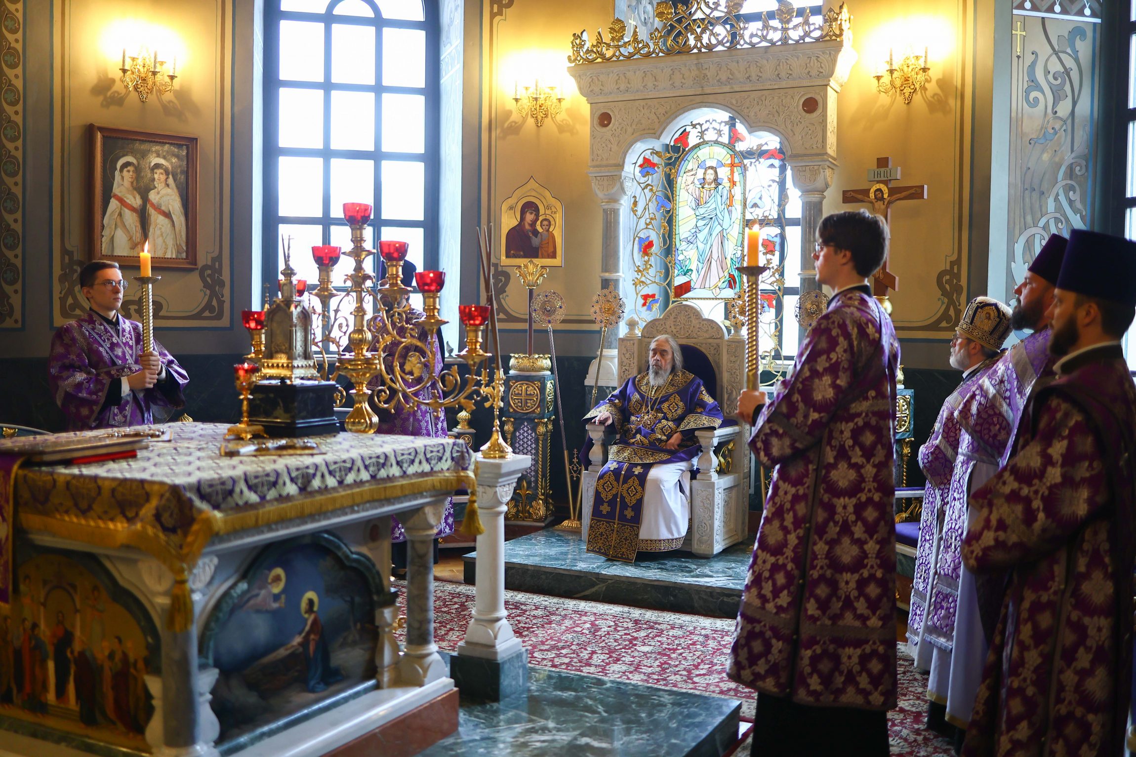 На сугубой ектении вознесены молитвы о благопоспешениихристолюбивому Российскому воинству в установлении мира в сию лихую годину, на Святую Русь нашедшую, о мире на Украине, а также о сохранении единства святого Православия.