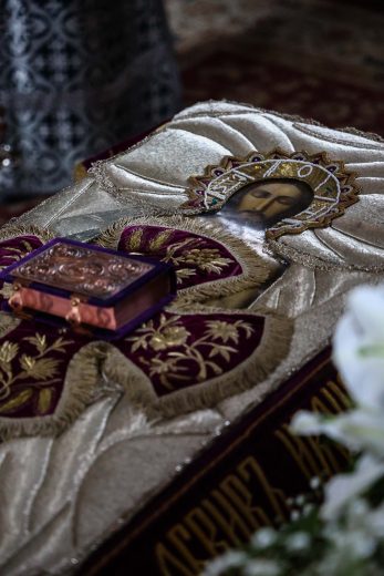 В конце вечерни, при пении тропаря «Благообразный Иосиф, с древа снем Пречистое Тело Твое», из алтаря на середину храма перенесена Святая Плащаница с изображением положения во гроб Тела Христова.