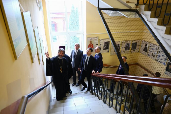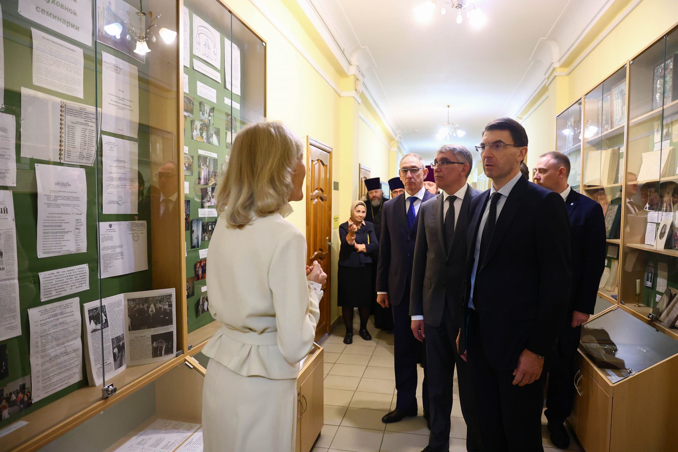 Затем для гостей была проведена краткая экскурсия по семинарии, во время которой они ознакомились с экспозициями, рассказывающими об истории самой духовной школы, ее выдающихся выпускниках, а также о становлении и развитии Тульской епархии и жизни Русской Православной Церкви в разные периоды.