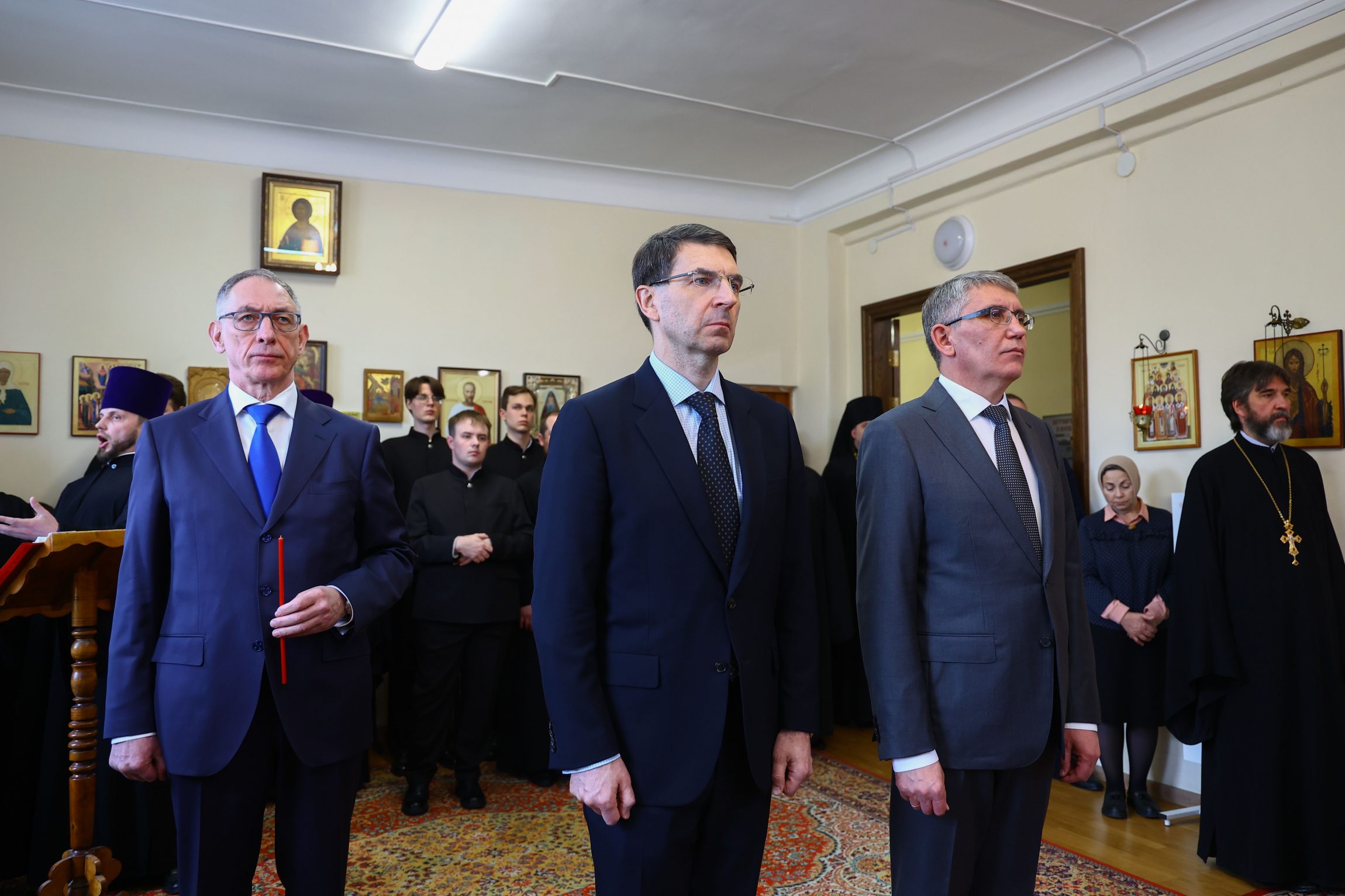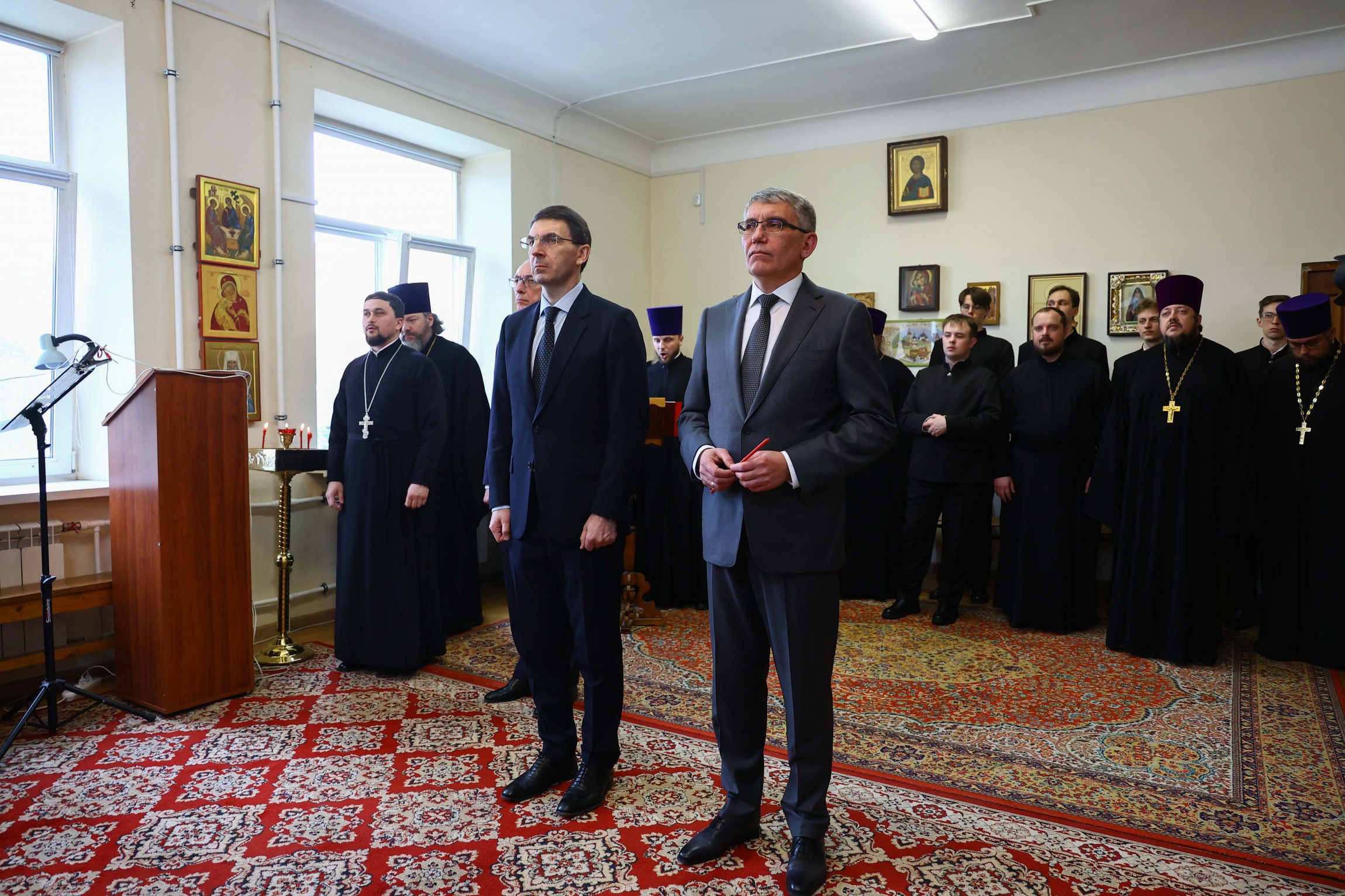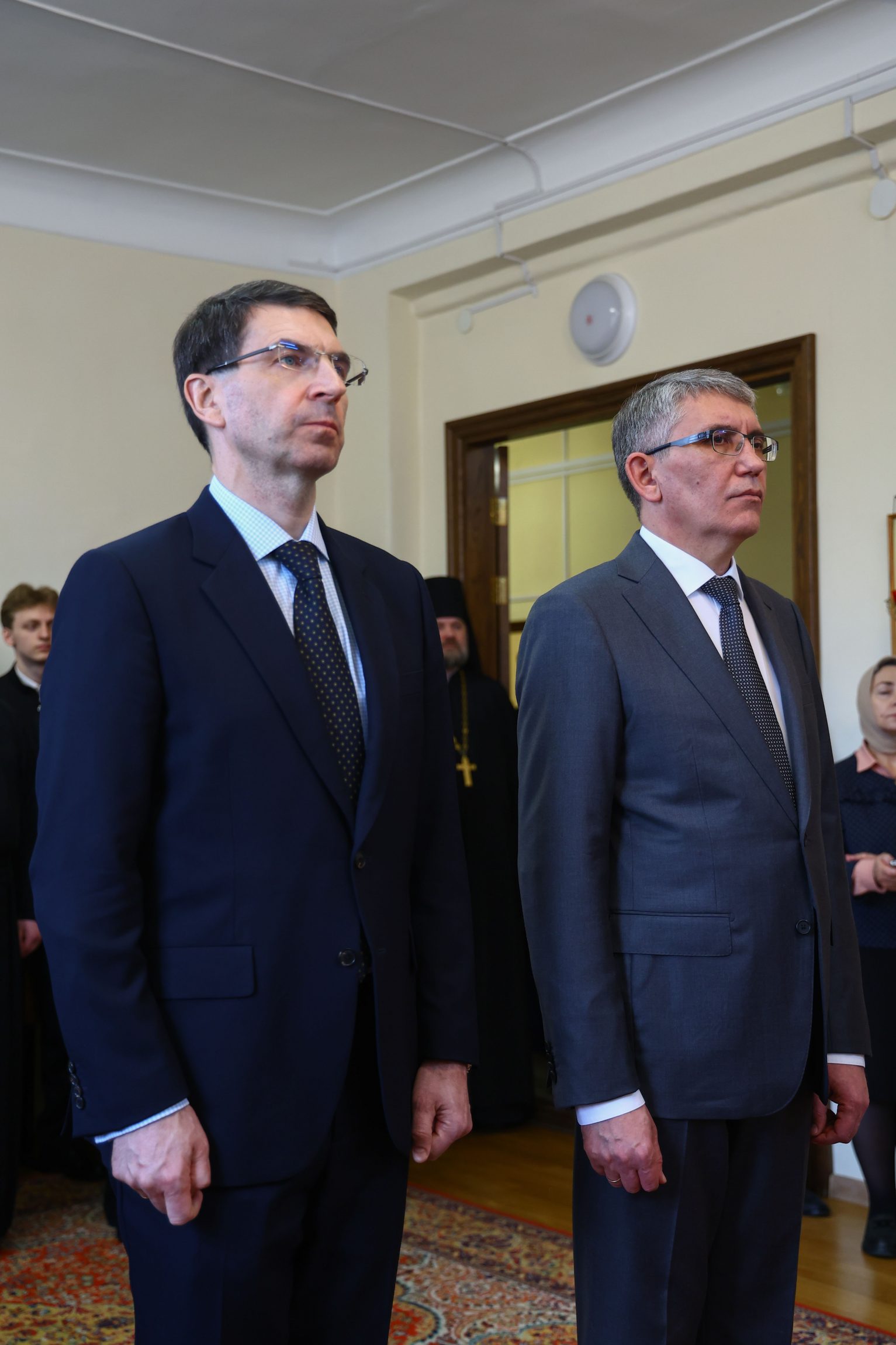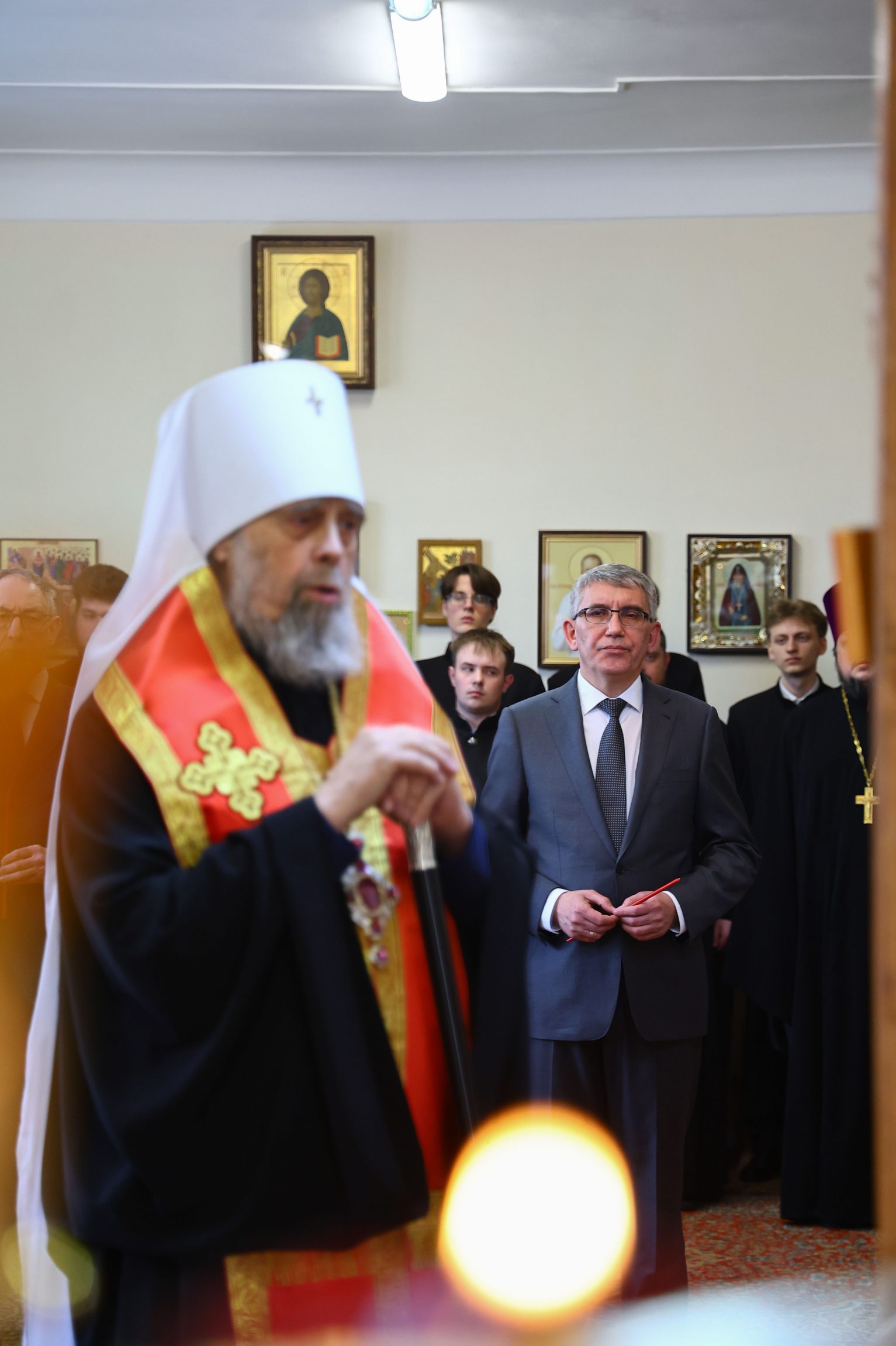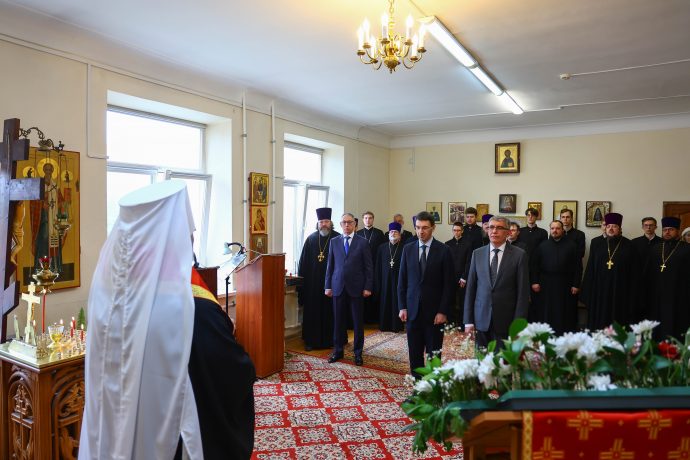 Общение главы Тульской митрополии с Игорем Щеголевым, полномочным представителем Президента Российской Федерации в Центральном федеральном округе, и сопровождавшим его Дмитрием Миляевым, губернатором Тульской области, предварила совместная молитва в семинарском храме в честь Святой Живоначальной Троицы. После торжественных пасхальных песнопений были вознесены молитвенные прошения о помощи Божией и благопоспешении в ответственном служении высоких гостей на благо страны и ее народа.