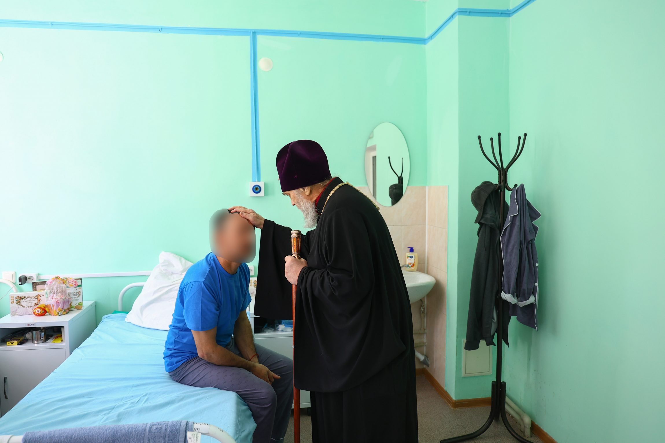 Сопровождавшие правящего архиерея протоиерей Сергий Резухин, председатель епархиального отдела по социальному служению и благотворительности, и Нина Зеленская, старшая сестра милосердия Тульского сестричества во имя святых Жен-мироносиц, прошли по палатам и под пение праздничного тропаря вручили каждому пациенту символический подарок — сладкое красное пасхальное яйцо.