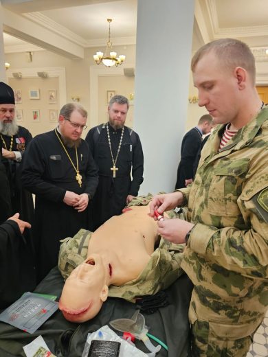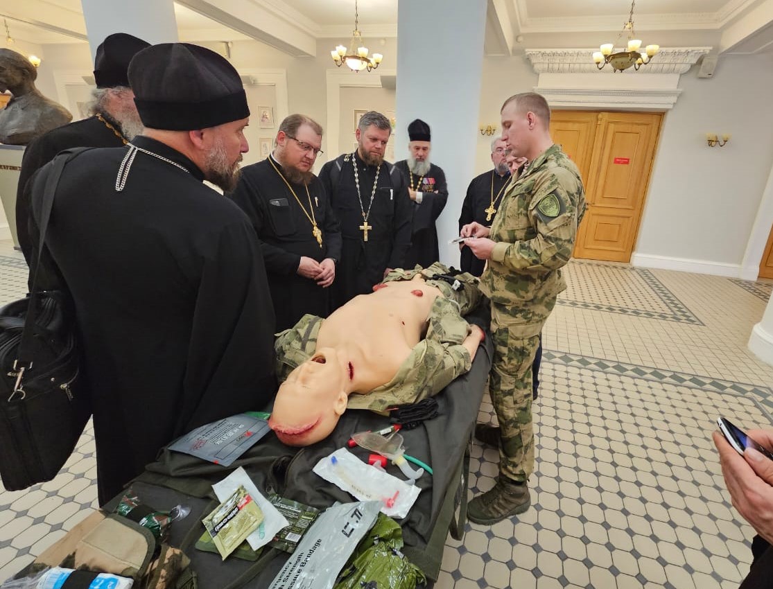 Помощник главного священника в зоне СВО по работе с Рогсвардией протоиерей Святослав Чурканов поделился: «Я служу в Курской митрополии. На фронте нахожусь с 2022 года. Уже 26 февраля 2022 года благословлял бойцов, уходивших на Киевское направление. То, что мы получали на курсах тактической медицины, дало большой результат. Был бой, военнослужащего ранило, пришлось помогать, перевязывать, жгутовать, эвакуировать его в безопасное место».