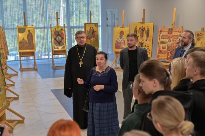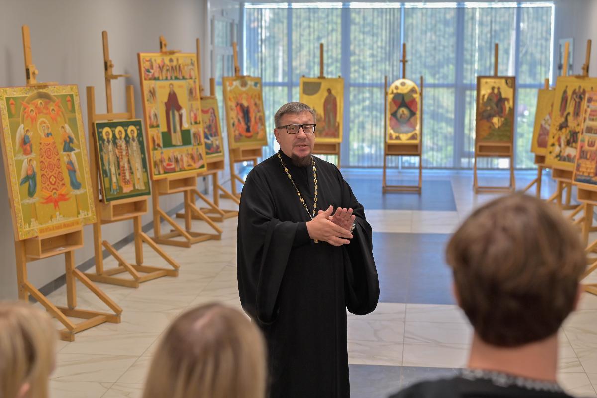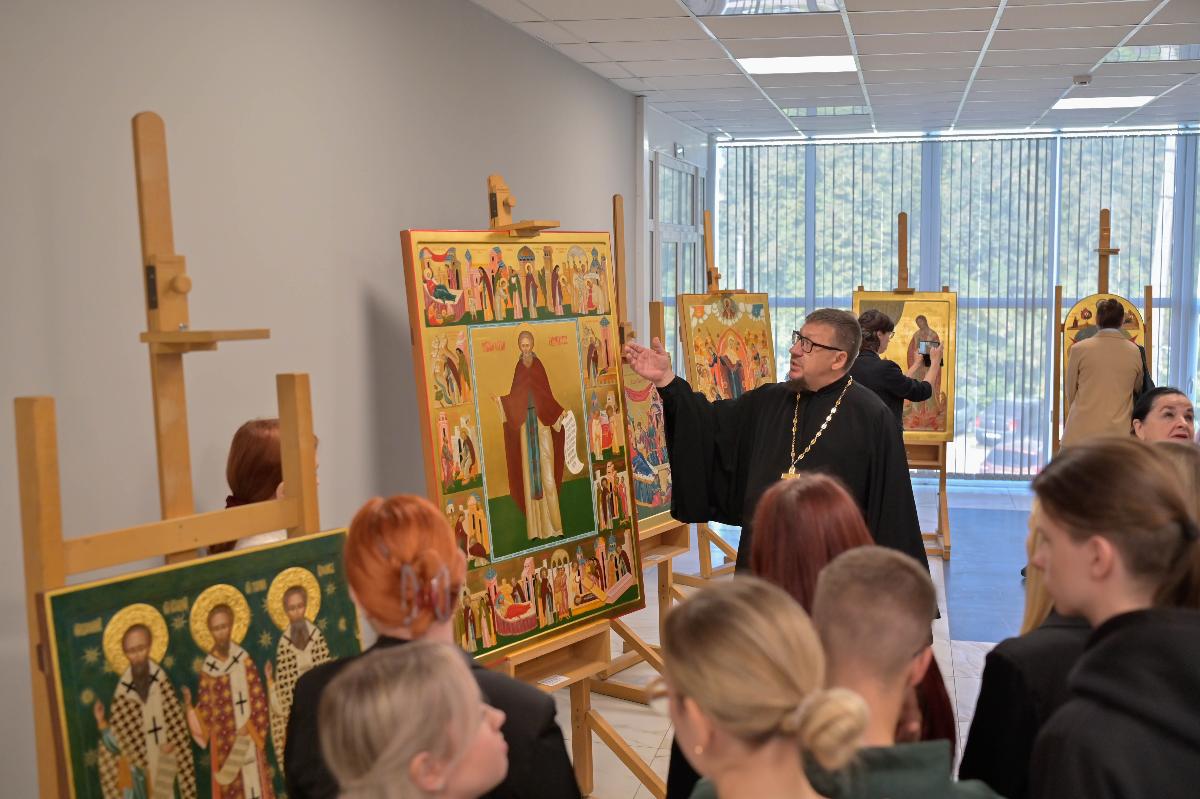 Иерей Алексий отметил, что изображенные на иконах святые являются образом истинного служения Богу и людям в чистоте совести, напомнил, что в этот день празднуется память новомучеников и исповедников Тульских, благодаря подвигу которых сохранялась православная вера и культура, и пожелал, чтобы выставка легла на души и сердца студентов, освятила их и помогла знаниям, полученным в университете стать фундаментом их счастливой жизни в служении людям и Отечеству.