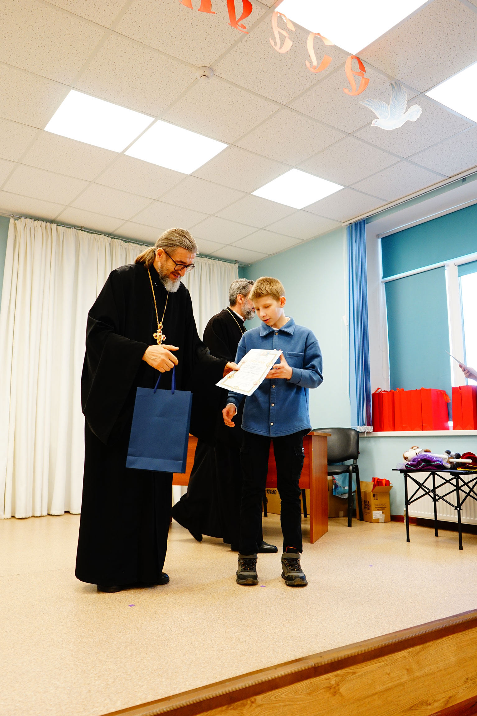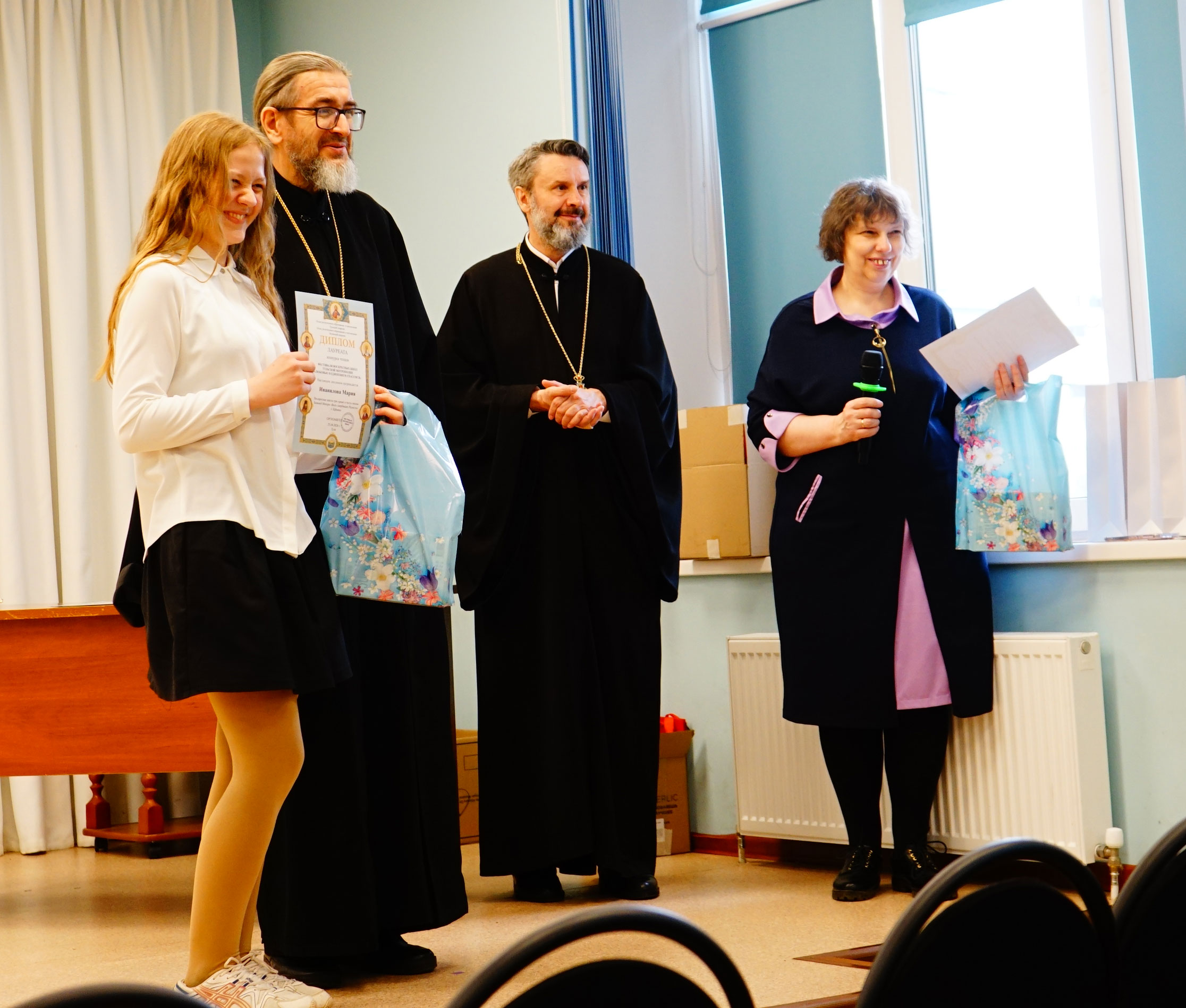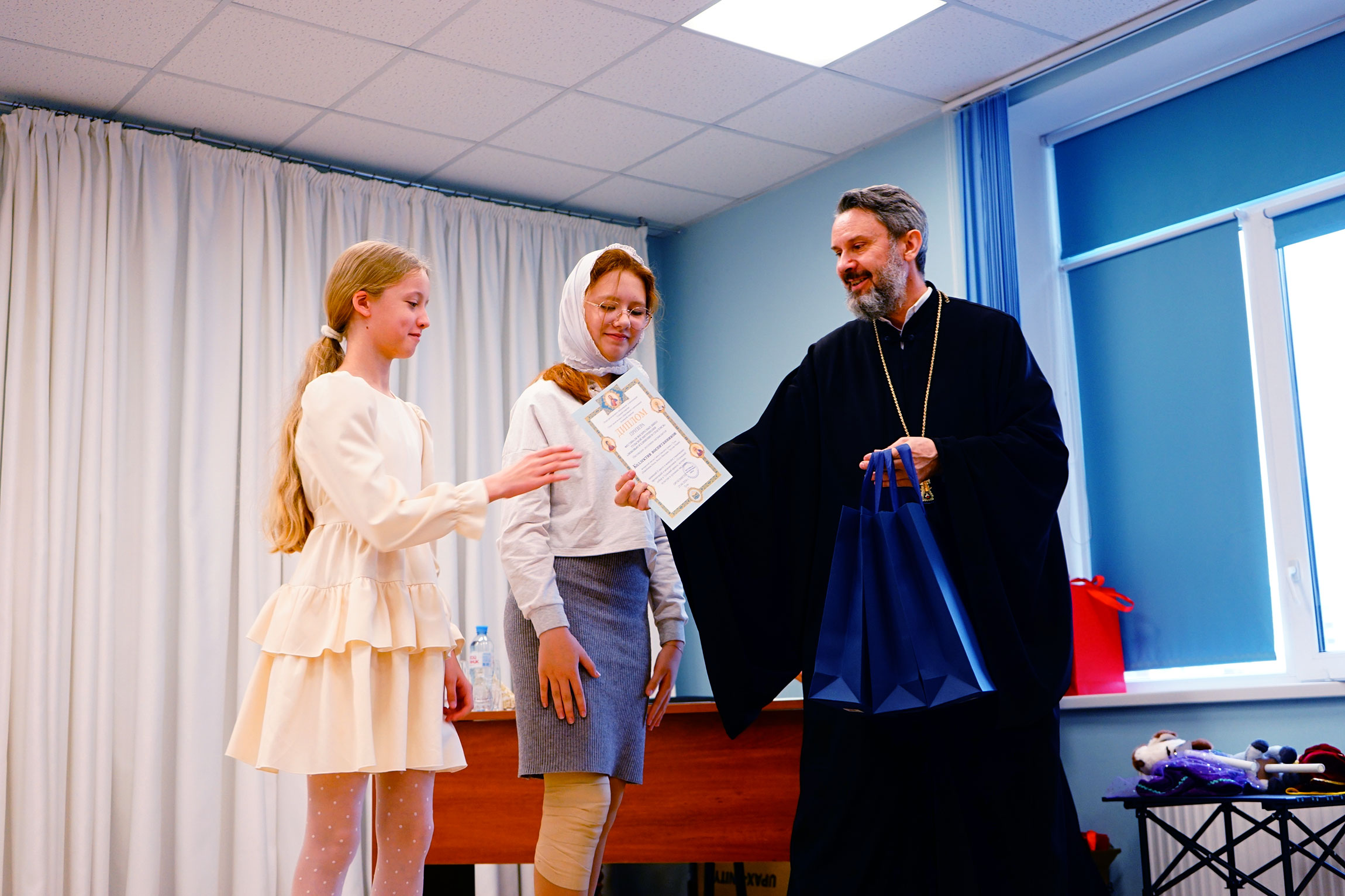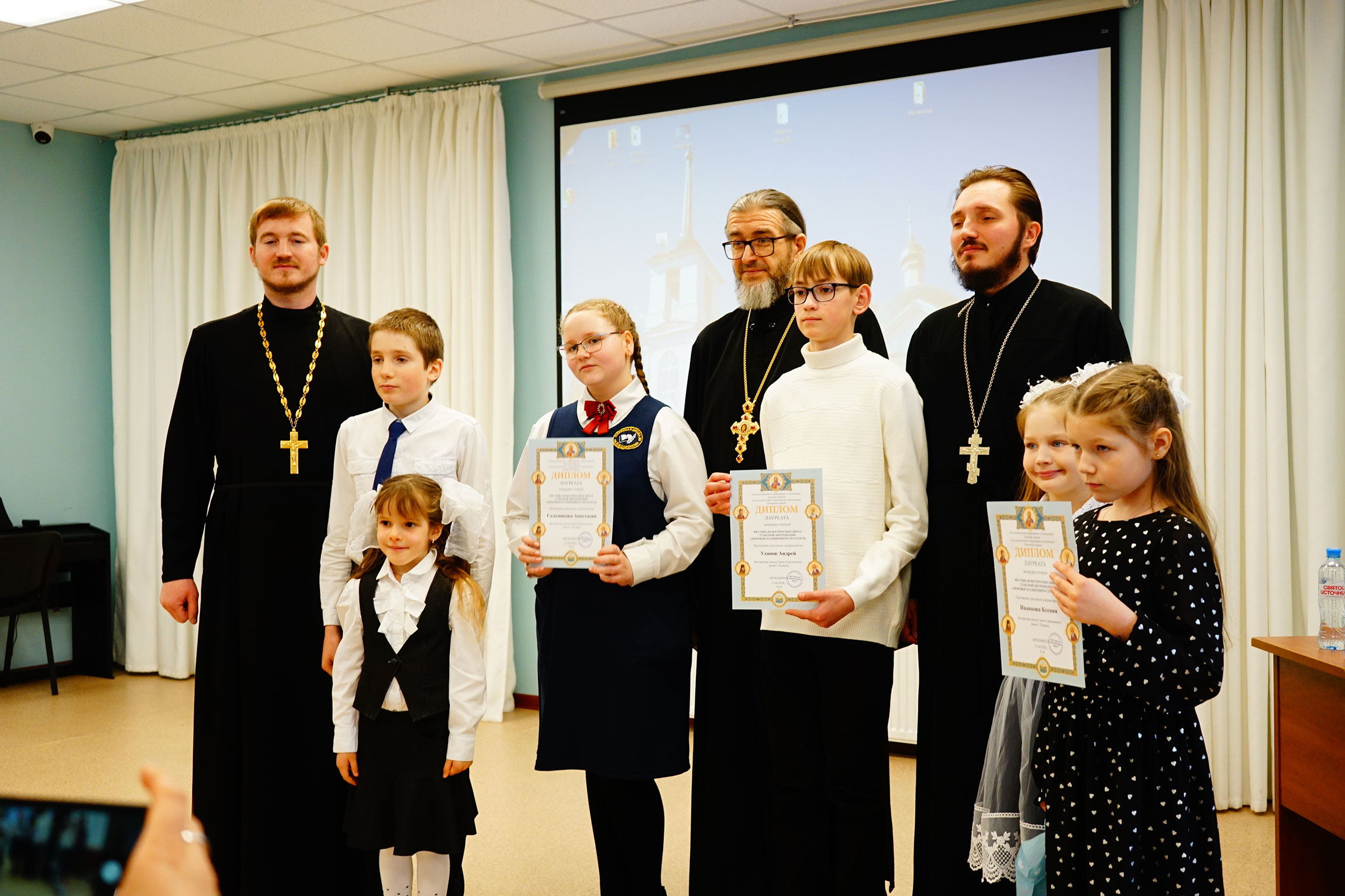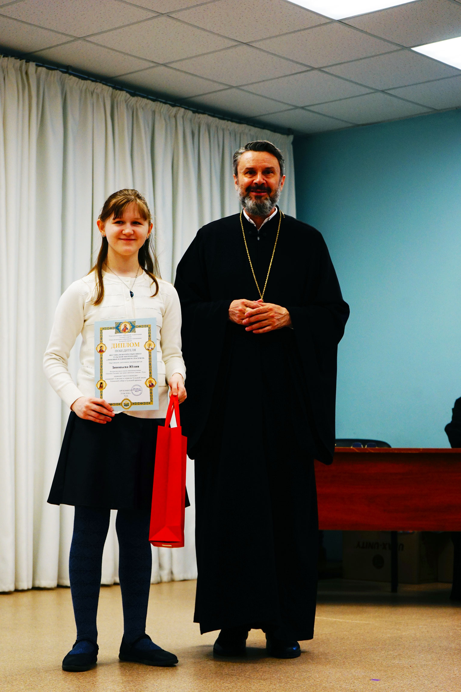 Затем прошло награждение дипломами и подарками победителей и призеров фестиваля воскресных школ Тульской митрополии «Любовью и единением спасёмся» по 3 конкурсам: сочинений «Святыни и символы Тульской земли: Успенский собор и Тульский кремль», рисунков «Символы Тульского края: Успенский собор и Тульский кремль», ученических презентаций и видеороликов «Успенский собор и Тульский кремль: история, культура и духовное наследие».
