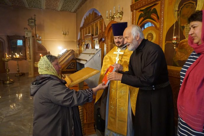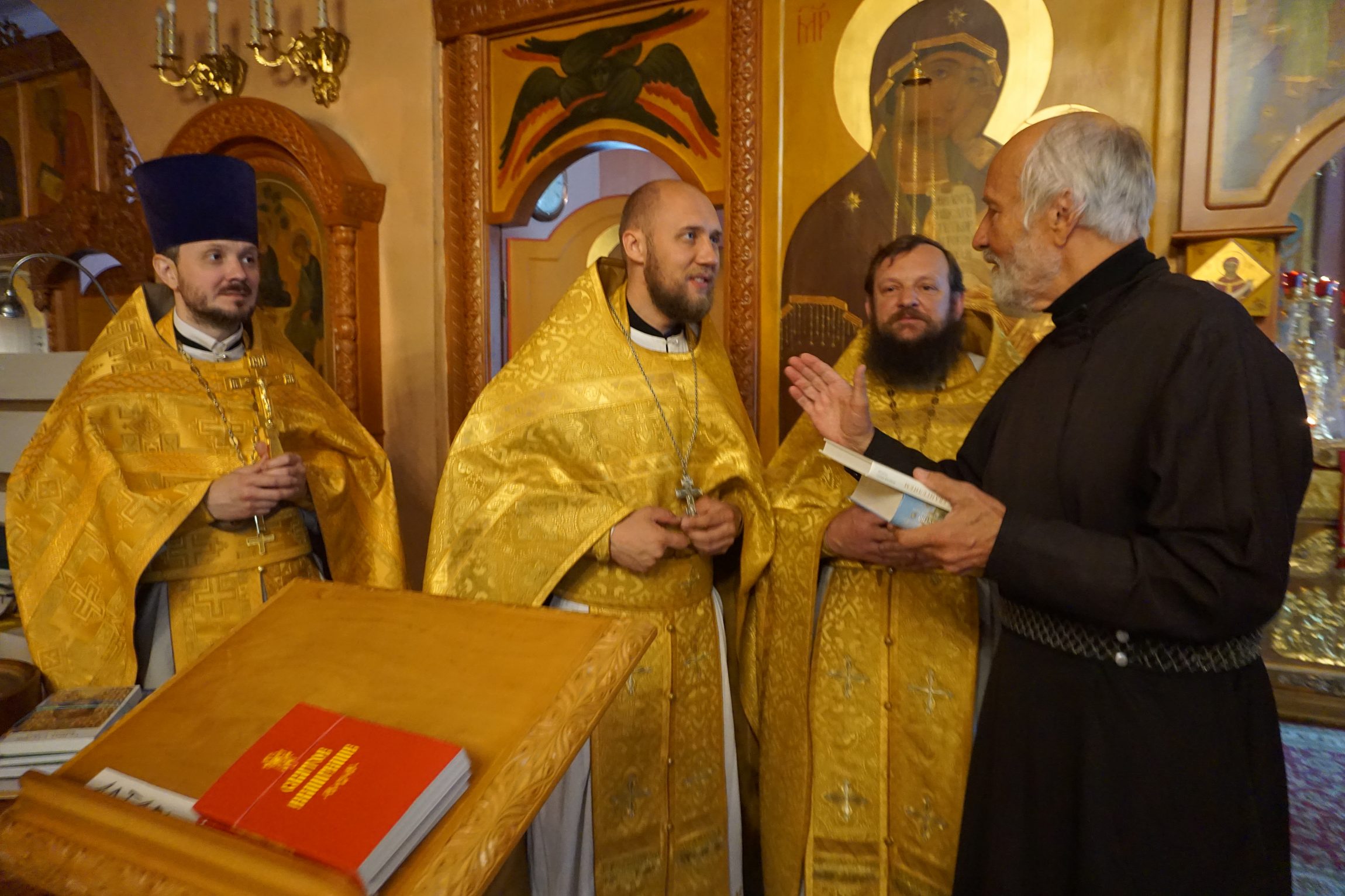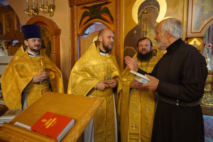Иерей Илия Семёнов, настоятель храма, поблагодарил руководство и активистов Общества русской словесности за духовно-просветительскую литературу и выразил надежду на благоуспешное продолжение сотрудничества.