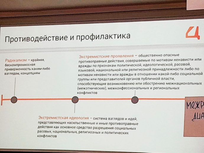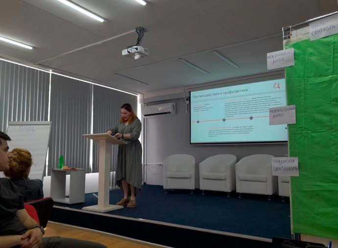 Сотрудники Центра выступили с докладами, в которых осветили теоретические аспекты и вопросы актуальности организации профилактики религиозного и этнического экстремизма в образовательных организациях высшего образования. Егорова Софья Алексеевна, начальник психолого-методического отдела Центра, представила ключевые проекты дорожной карты по результатам работы стратегической сессии по теме «Профилактика религиозного и этнического экстремизма» в образовательных организациях высшего образования Министерства просвещения Российской Федерации.