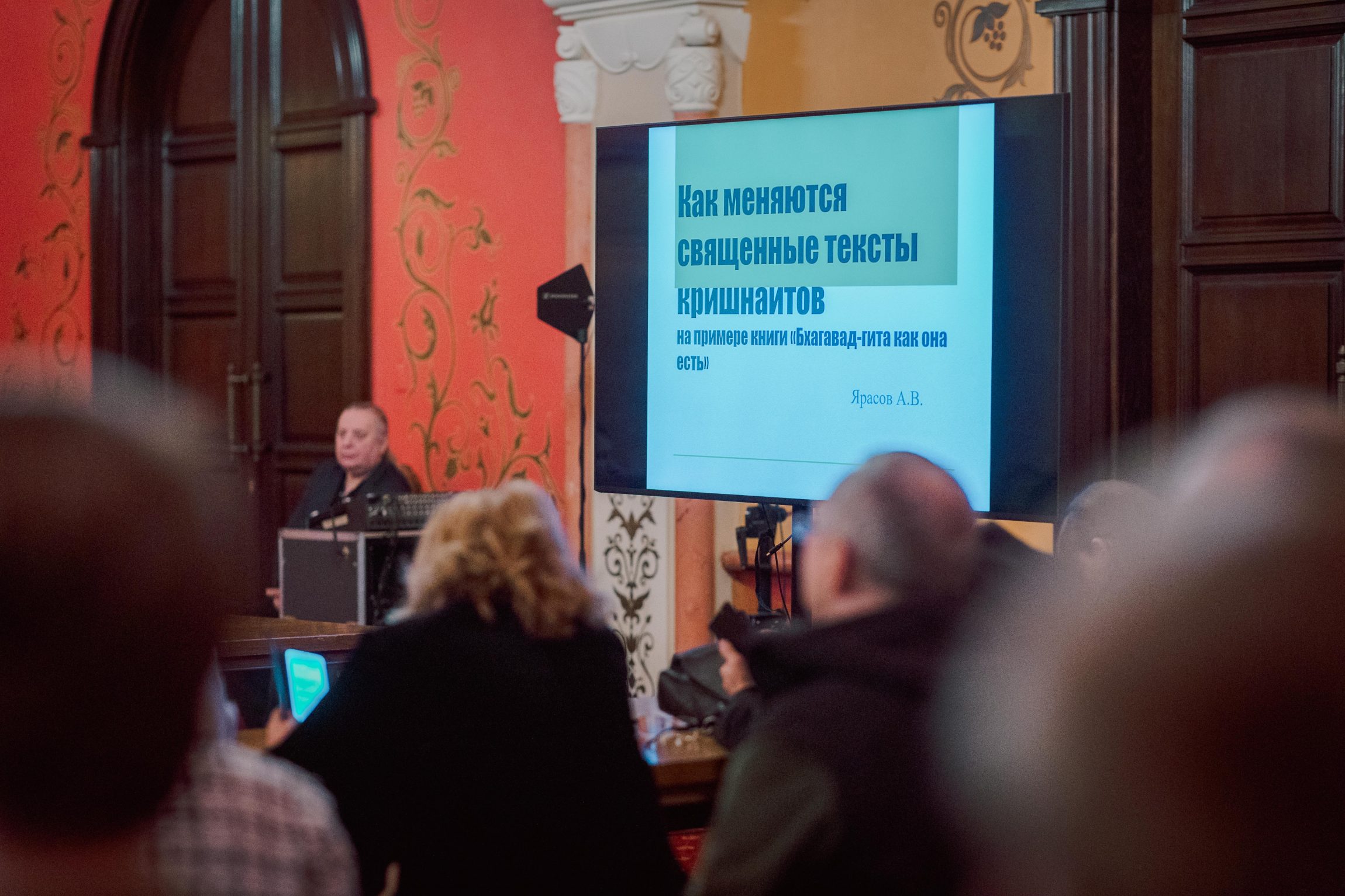 В своем докладе Алексей Ярасов коснулся темы изменений в тексте священной книги неоиндуистской секты «Международное Общество сознания Кришны» (МОСК) — «Бхагавад-гита как она есть». С момента первого издания книга претерпела несколько редакций, что существенно изменило ее содержание.