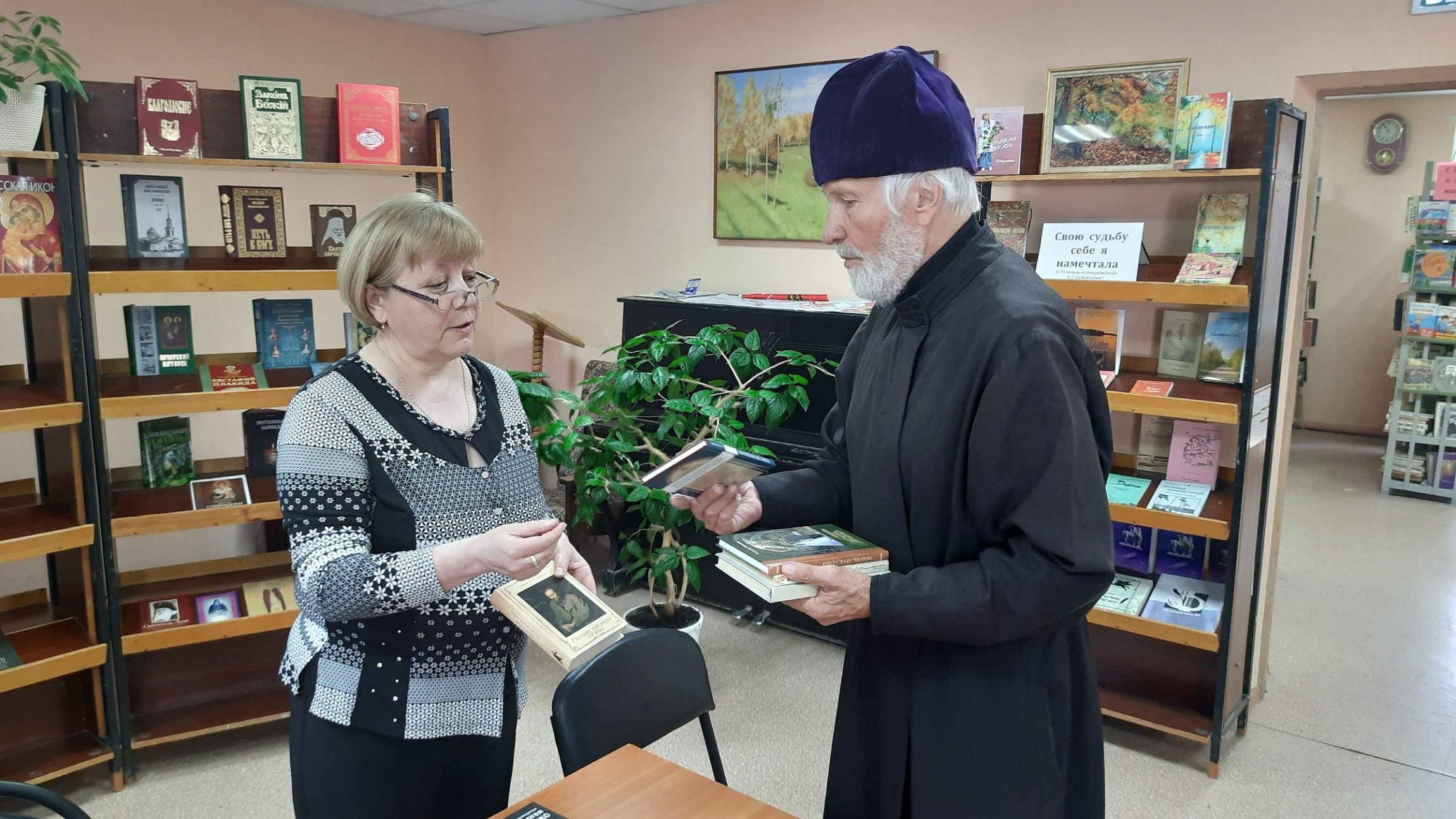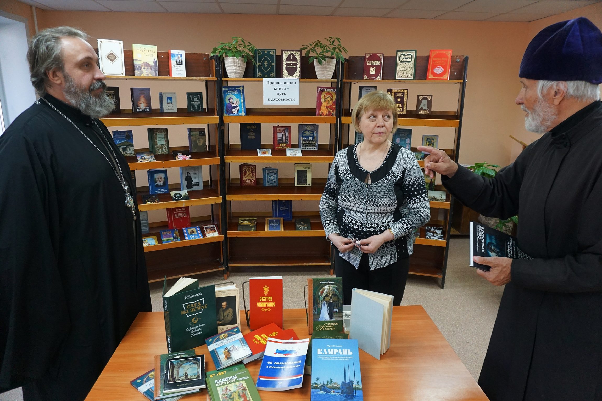 По окончании богослужения Олег Сенин вместе с иереем Андреем Жеребцовым, настоятелем храма Всех святых, в земле Российской просиявших, посетили городскую библиотеку, где их радушно встретила заведующая — Галина Кудряшова. Она рассказала о просветительских мероприятиях, которые проводятся с читателями и школьниками с участием духовенства.