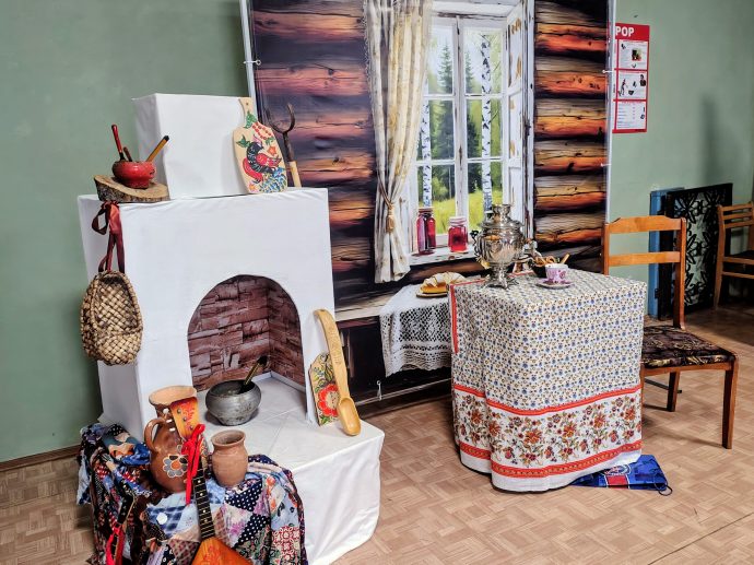 В пасхальный вечер модельная библиотека №1 превратилась в праздничную избу с печью, возле которой располагались предметы быта и различная домашняя утварь, а также самовар с угощениями.