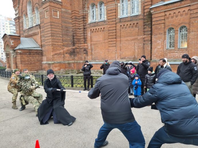 Поучаствовал в состязании и настоятель храма преподобного Сергия Радонежского протоиерей Вячеслав Ковалевский: он стал частью команды по перетягиванию каната. В честной борьбе команда настоятеля победила в считанные секунды.