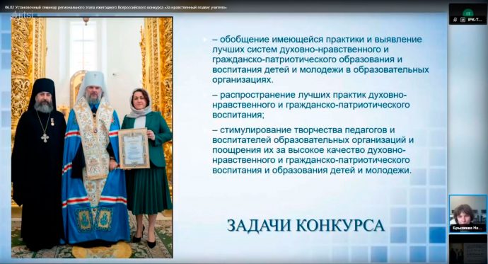 Мероприятие прошло в онлайн-формате на базе «Института повышения квалификации и профессиональной переподготовки работников образования Тульской области». В начале семинара собравшихся поприветствовала проректор по научно-методической работе института Наталья Владимировна Брызжева, которая отметила, что в ходе работы будет затронут ряд организационных и содержательных вопросов именно регионального этапа конкурса.