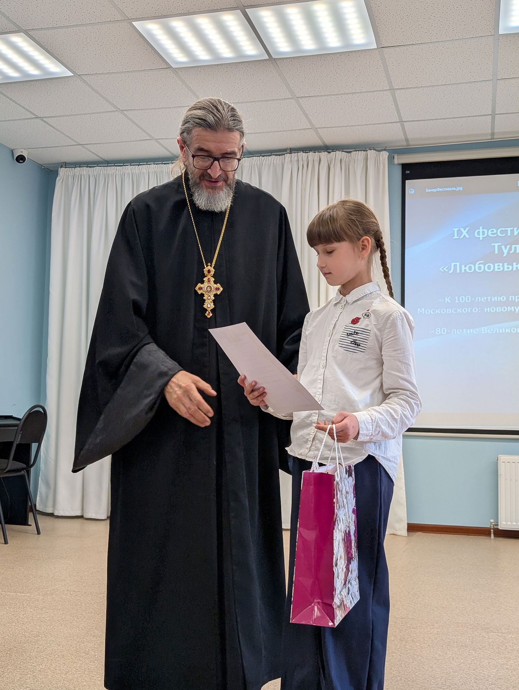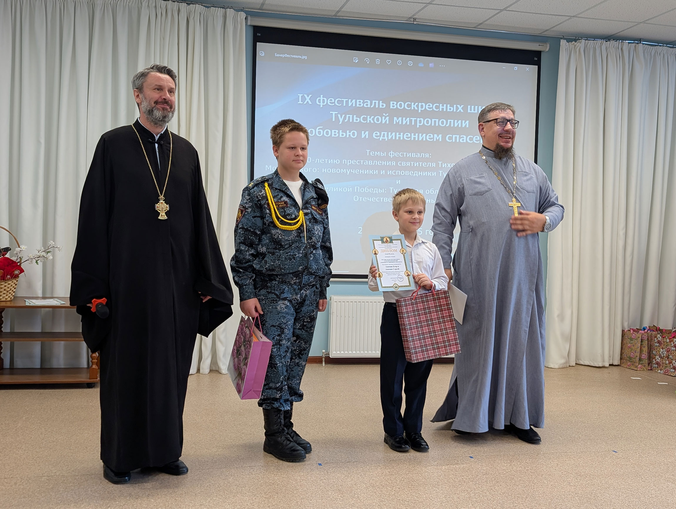 Затем прошло награждение дипломами и подарками победителей и призеров фестиваля воскресных школ Тульской митрополии «Любовью и единением спасёмся» по 3 конкурсам: сочинений «Подвиг тульских новомучеников. Защитники Отечества на Тульской земле»; рисунков «Новомученики и исповедники Тульской митрополии»; ученических презентаций и видеороликов «Отечество небесное и Отечество земное: вера, служение, подвиг».