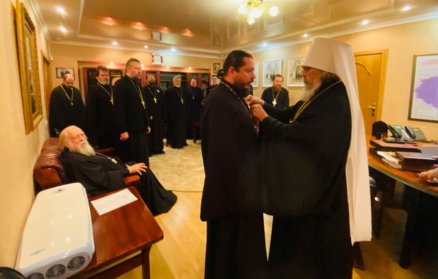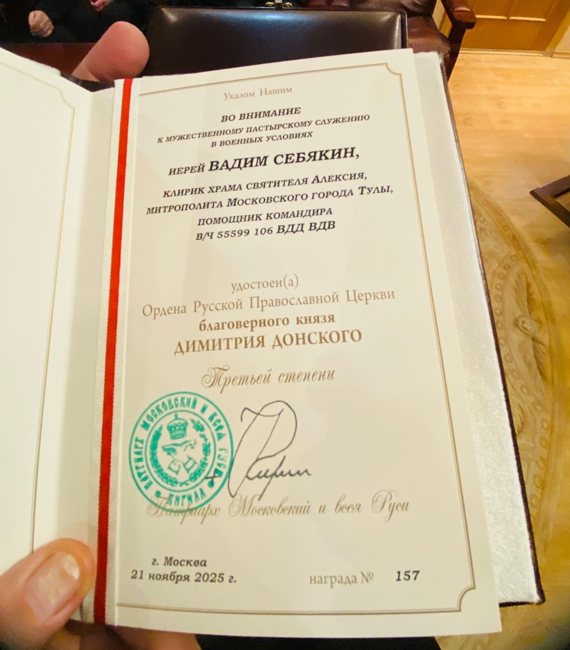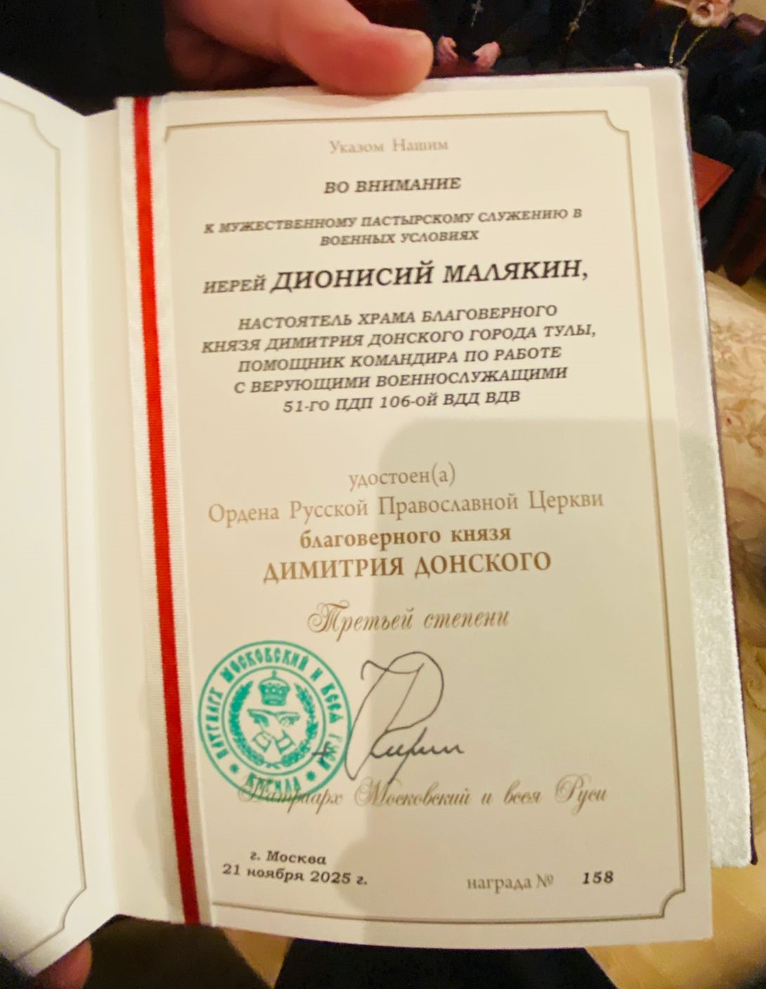 Во внимание к мужественному пастырскому служению в военных условиях клирик тульского храма святителя Алексия, митрополита Московского, иерей Вадим Себякин и настоятель храма благоверного князя Димитрия Донского иерей Дионисий Малякин были удостоены орденов благоверного князя Димитрия Донского III степени.