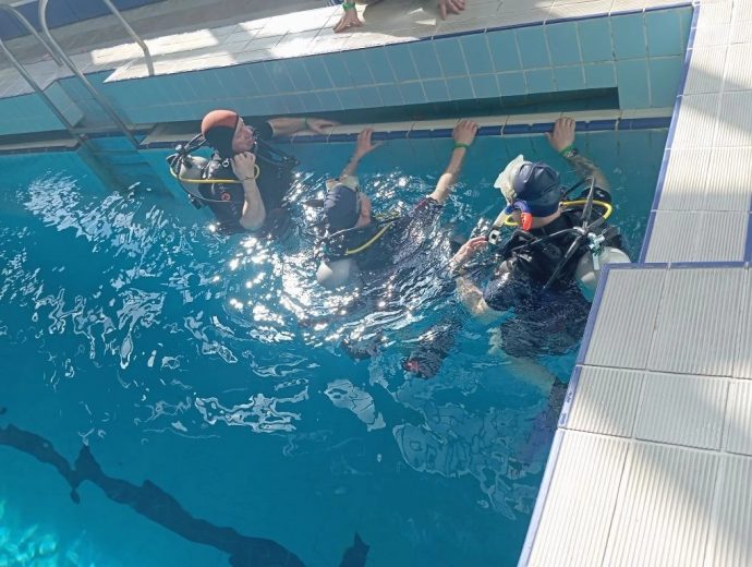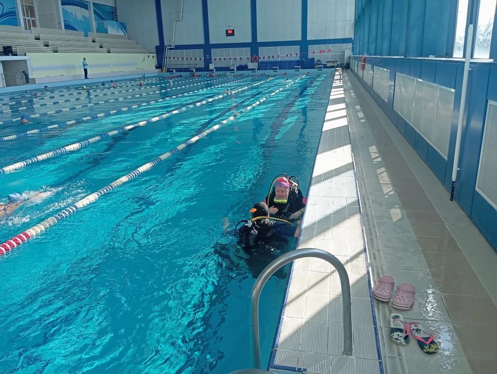 29 марта в бассейне «Арсенал» прошло очередное занятие по дайвингу с участниками программы реабилитации. В рамках встречи бойцы собрали оборудование, проверили его, после чего попарно совершили погружение в воду под руководством инструктора. Во время погружения выполнялись различные задания: находясь под водой, снимали компенсатор плавучести, дышали через октопус напарника, снимали маску и освобождали ее от воды.